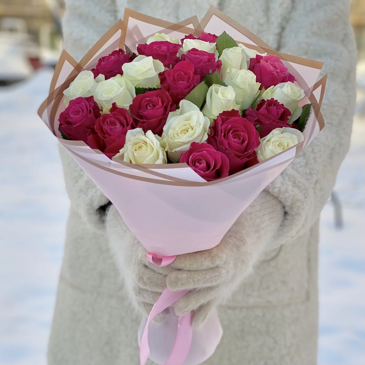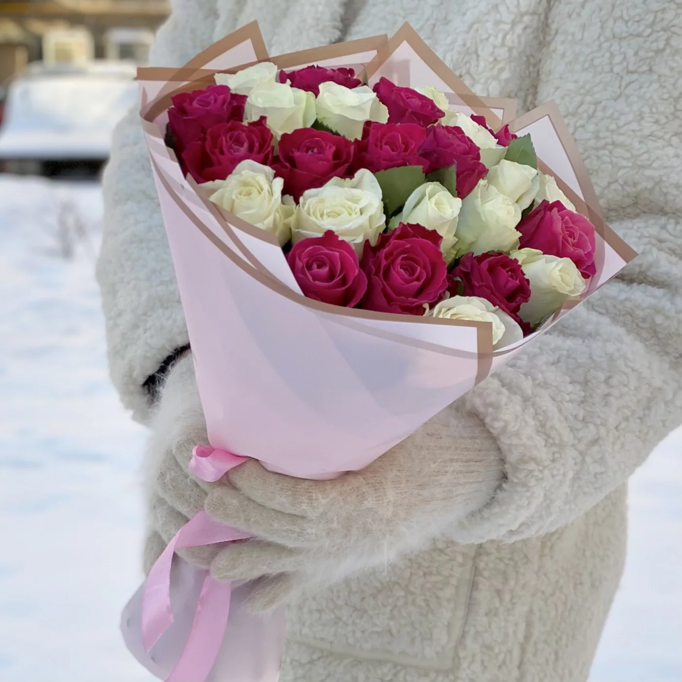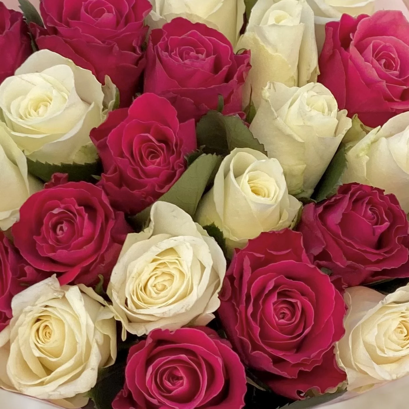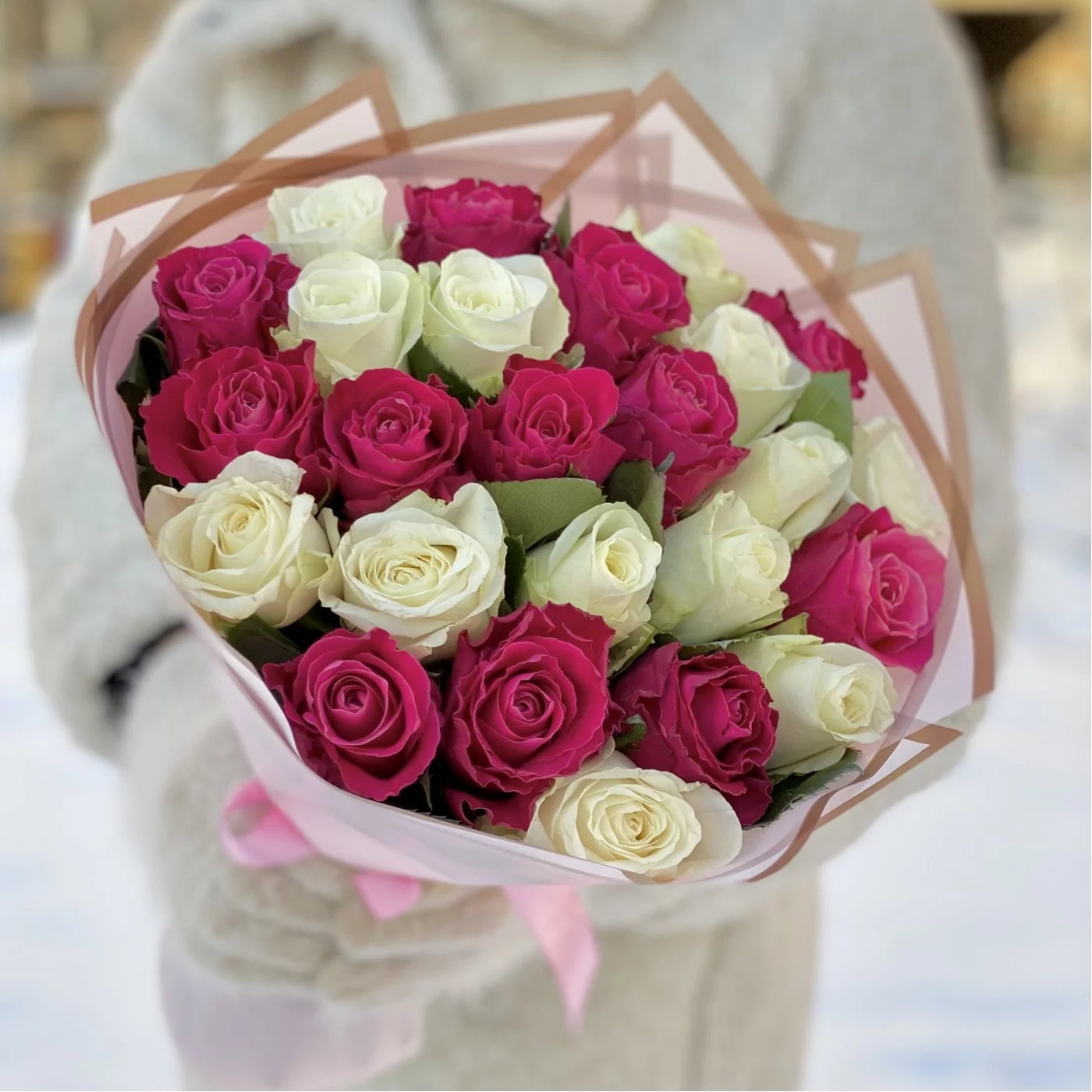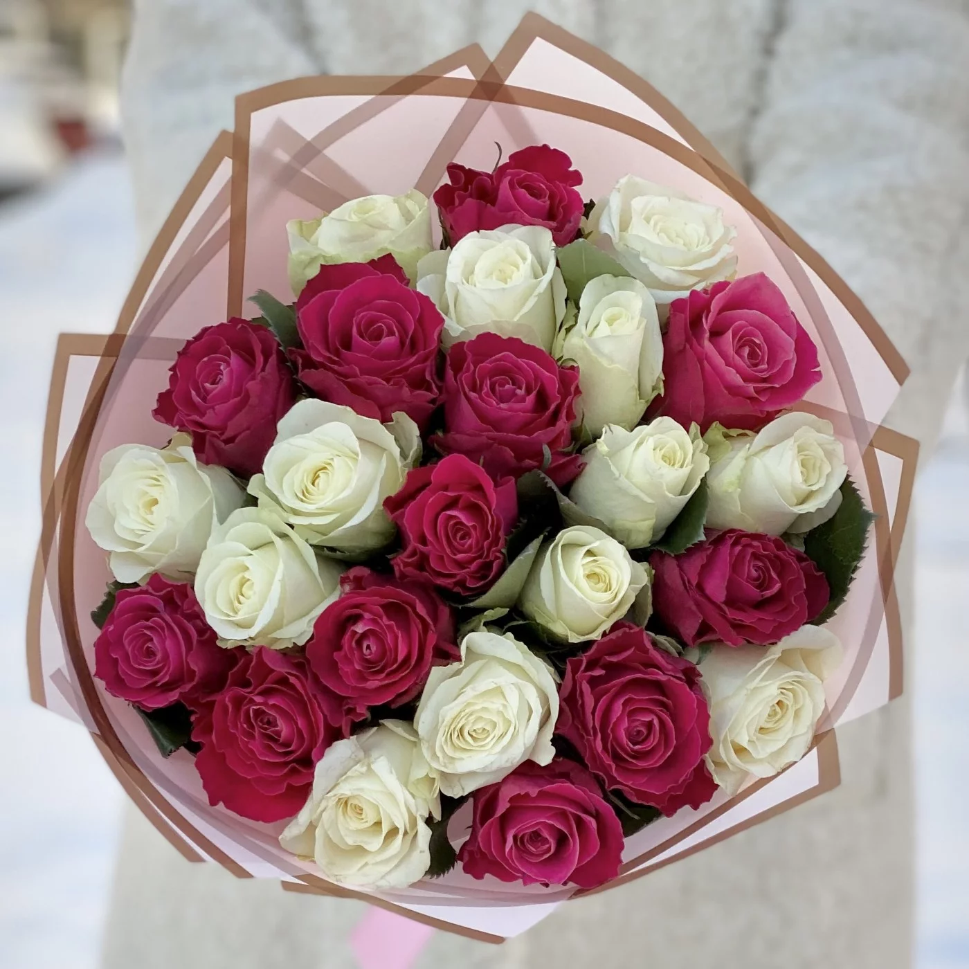 25 малиновых и белых роз