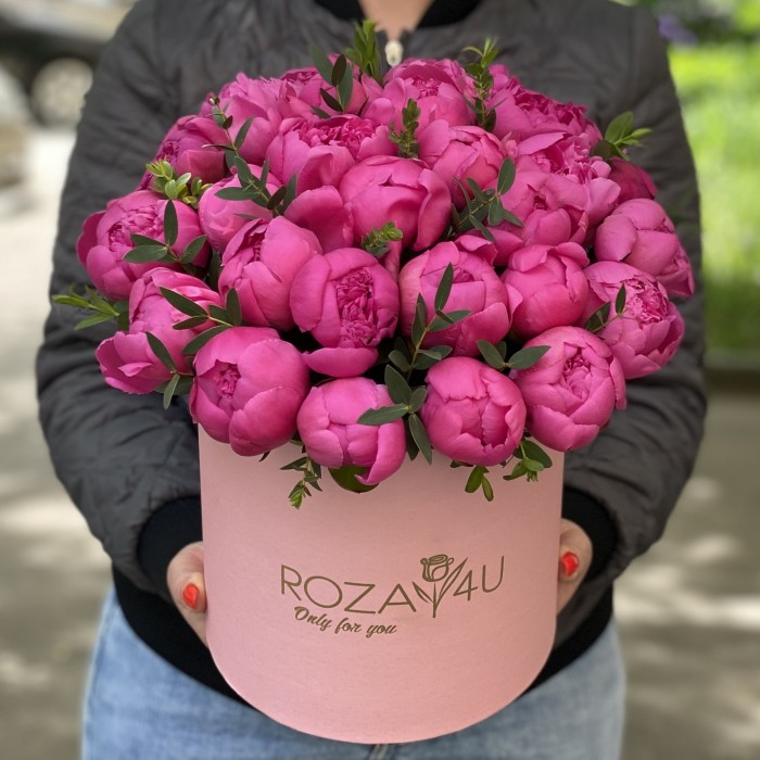 Букет из 25 пионов малинового цвета в модной «шляпной» коробке – прекрасный подарок для ярких и творческих натур. Цветочная «шапка» из пышных бутонов порадует получателя насыщенным ароматом, свежестью и красотой. Композиция выполнена в минималистическом стиле. Яркость сочных бутонов выгодно оттеняют веточки эвкалипта и бежевая коробка – стильная, лаконичная.
