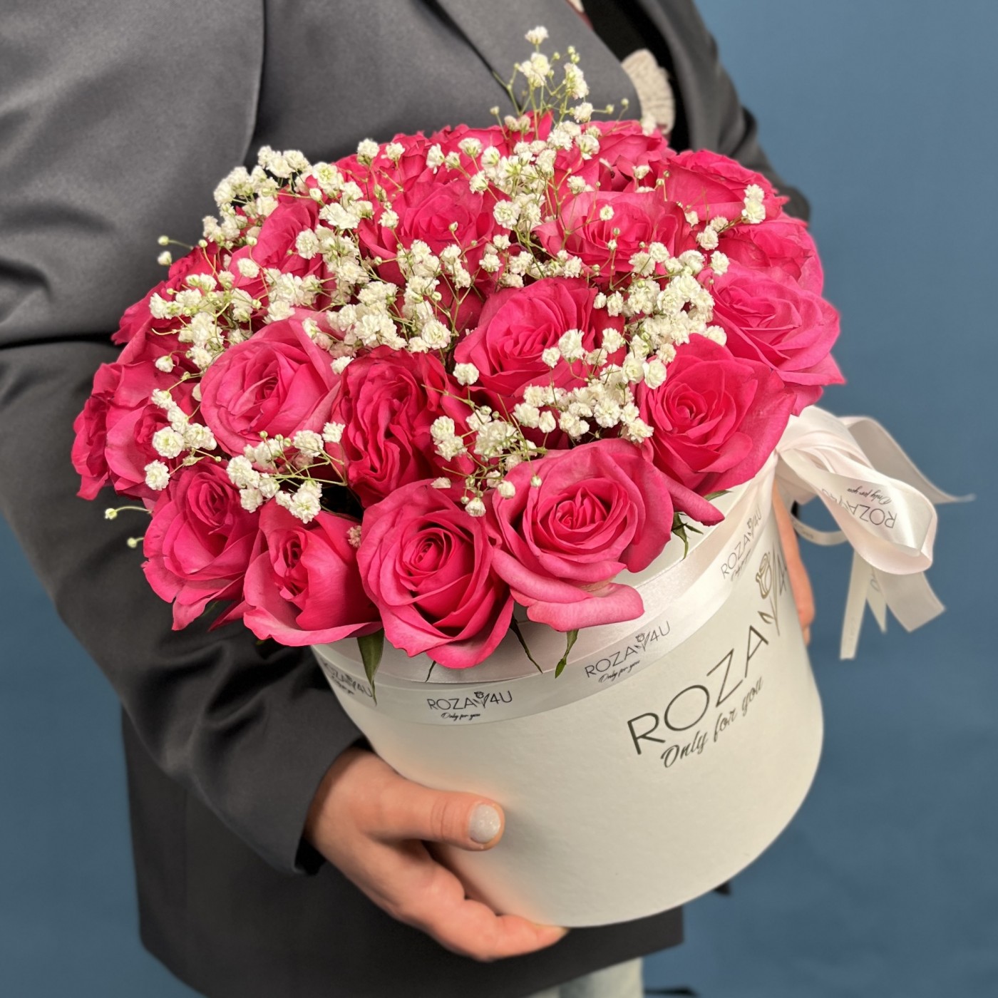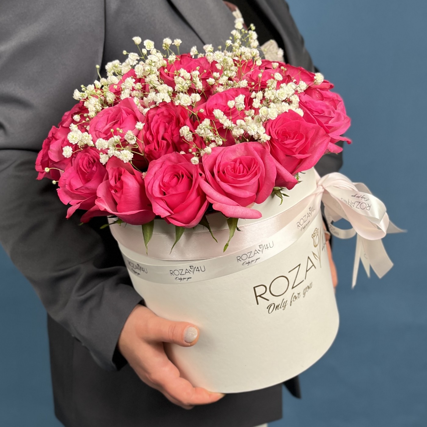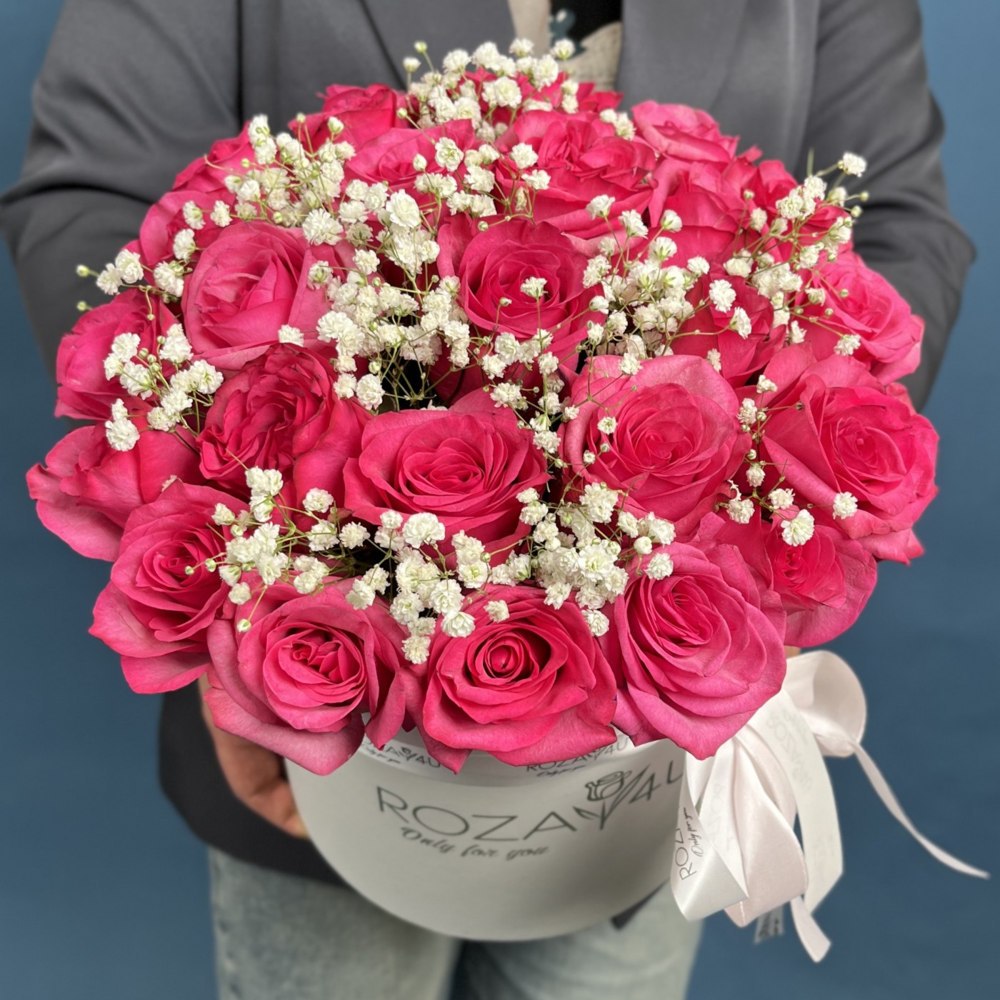 25 малиновых роз Палома Роял с гипсофилой в коробке — это изысканная и романтичная композиция. Насыщенный малиновый цвет роз создает страстный и выразительный акцент, а воздушная гипсофила придает легкость и нежность.