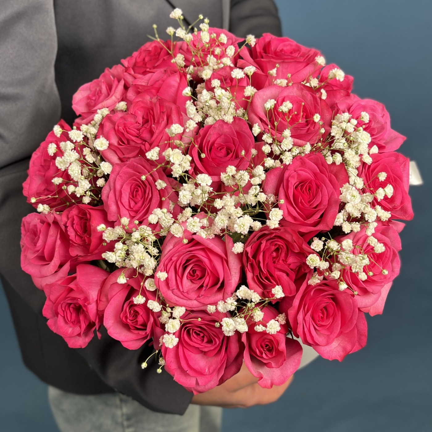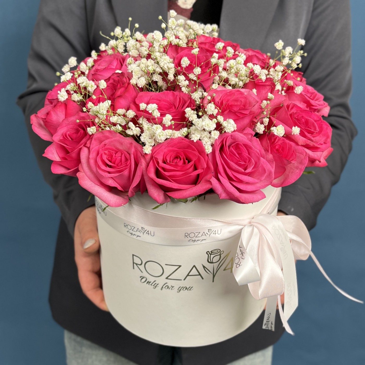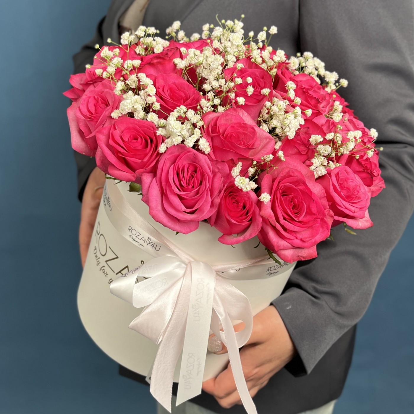 25 малиновых роз Палома Роял с гипсофилой в коробке — это изысканная и романтичная композиция. Насыщенный малиновый цвет роз создает страстный и выразительный акцент, а воздушная гипсофила придает легкость и нежность.