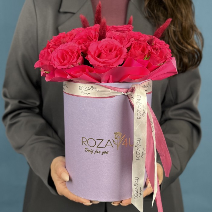 25 малиновых роз Вайлд Калипсо с лагурусом в коробке — это элегантная и романтичная композиция, которая станет прекрасным подарком для любого случая. Яркий малиновый оттенок роз создает насыщенный и выразительный образ, а лагурус добавляет легкость и воздушность.
