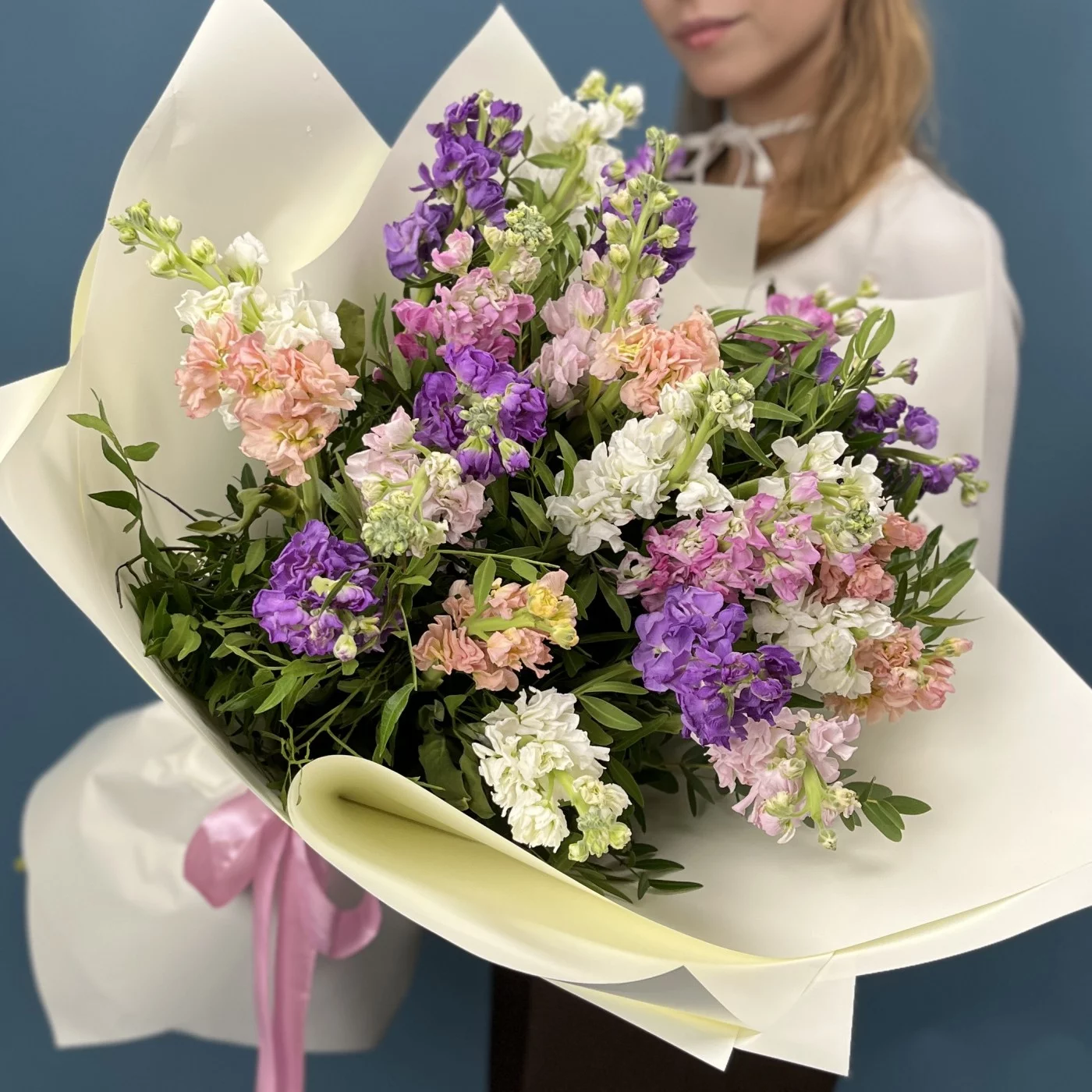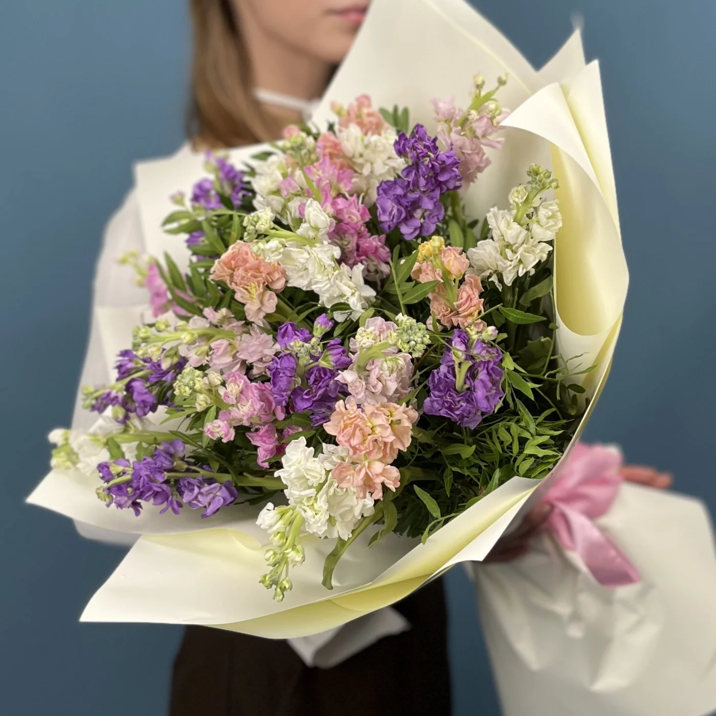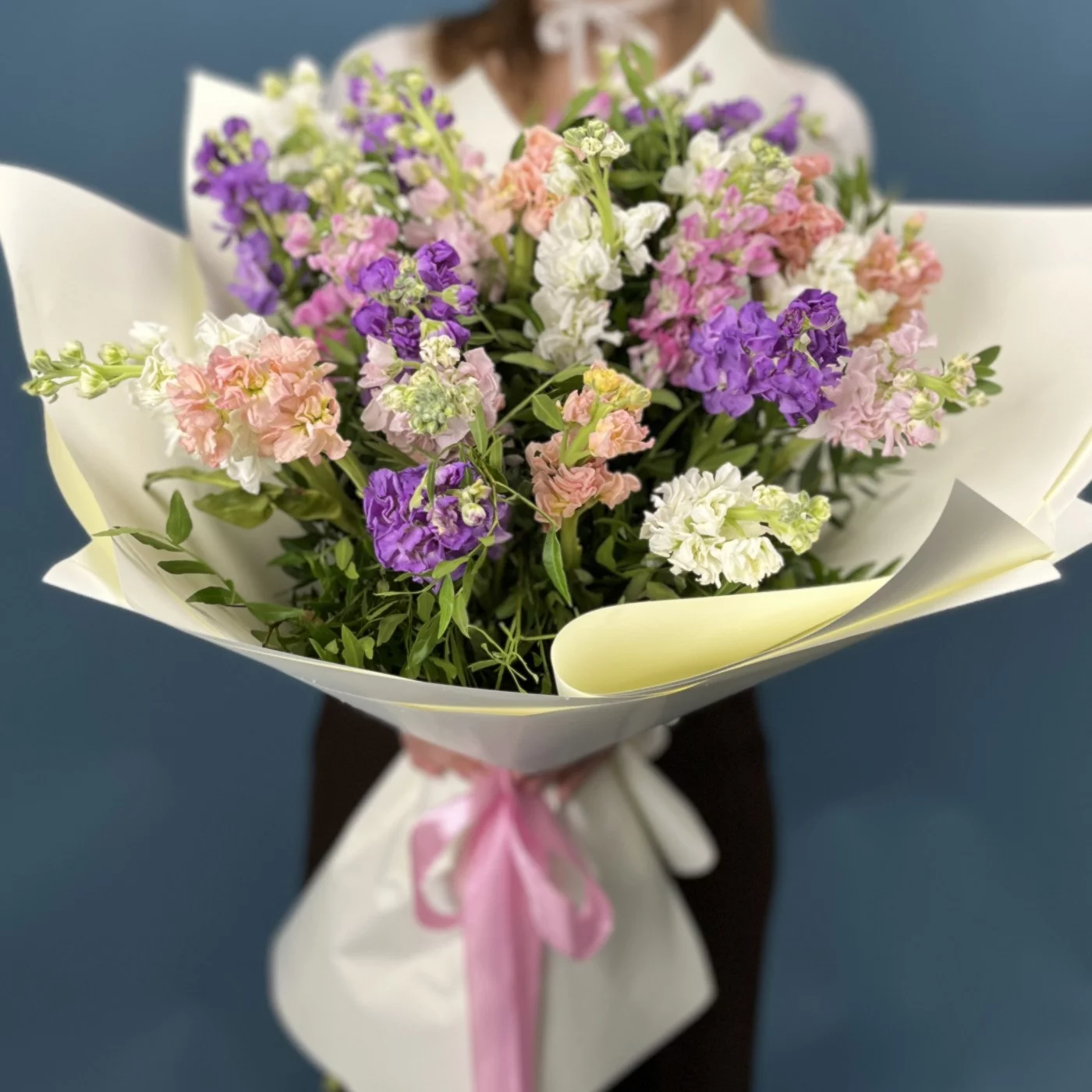 25 маттиол нежный MIX - композиция из пышных, нежных цветов в мягких оттенках создает атмосферу свежести, романтики и гармонии. Легкие и воздушные соцветия наполнят пространство уютом и природной красотой, идеально подходя для любого торжества или приятного сюрприза. Наслаждайтесь красотой и нежностью этого яркого микса!