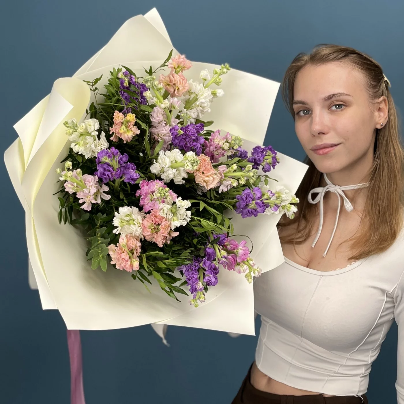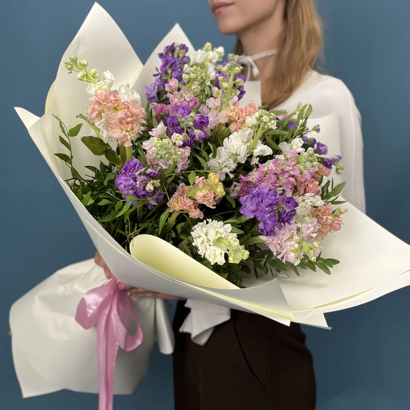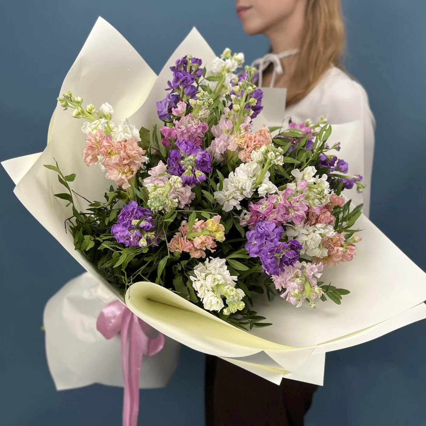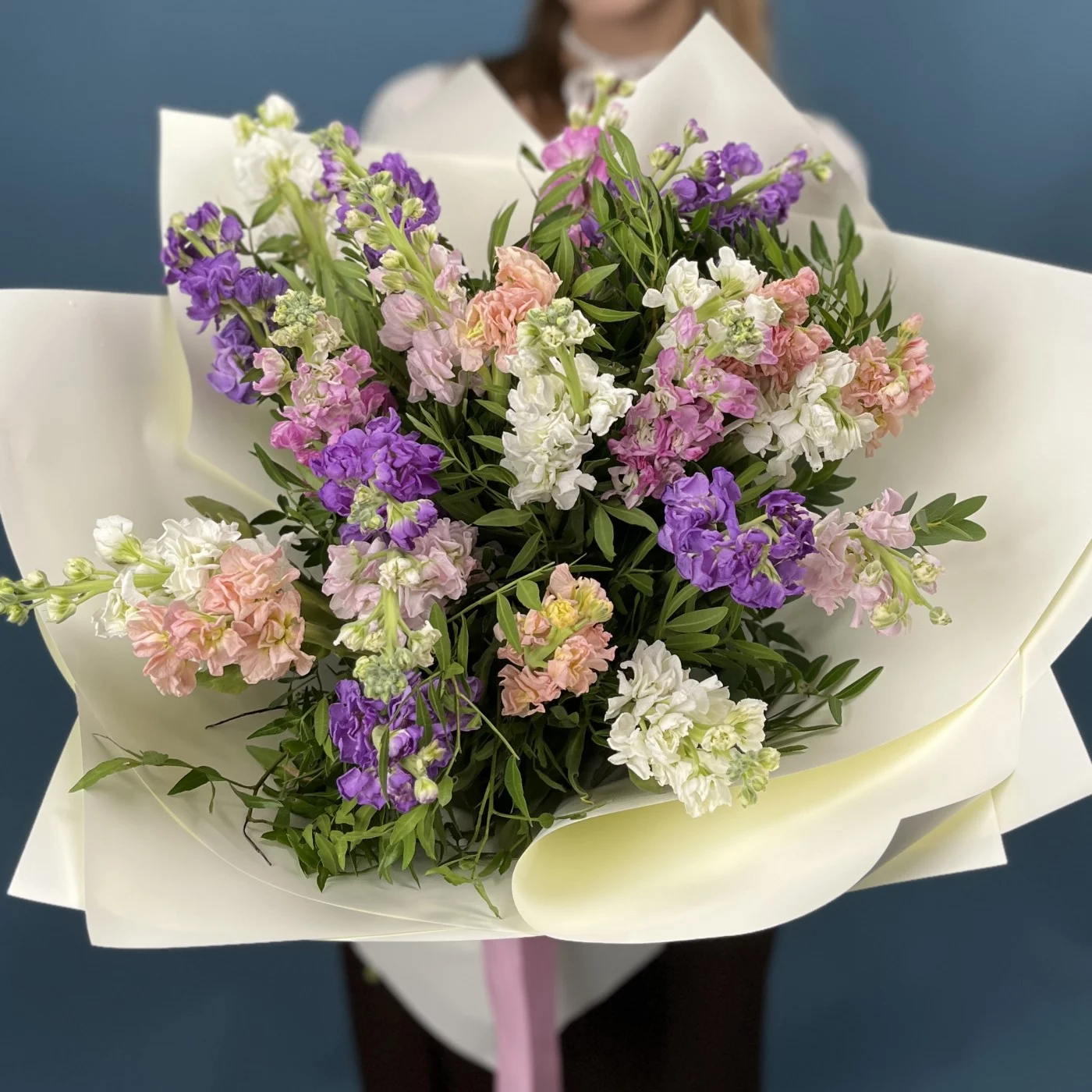 25 маттиол нежный MIX - композиция из пышных, нежных цветов в мягких оттенках создает атмосферу свежести, романтики и гармонии. Легкие и воздушные соцветия наполнят пространство уютом и природной красотой, идеально подходя для любого торжества или приятного сюрприза. Наслаждайтесь красотой и нежностью этого яркого микса!