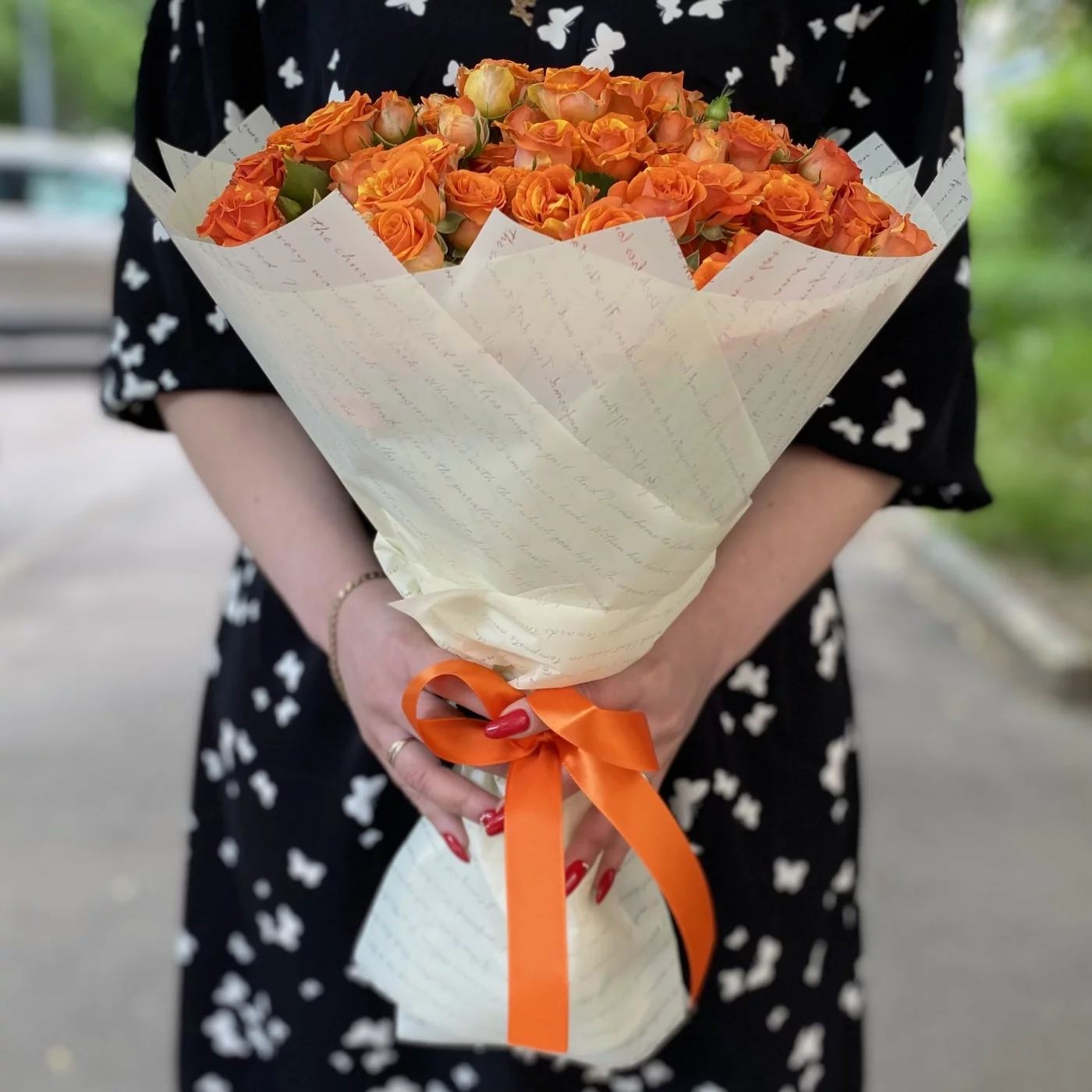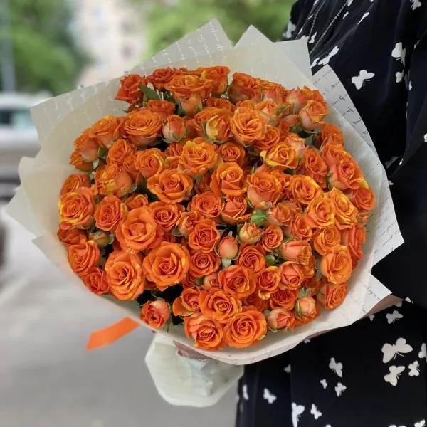 Букет из ярких кустовых роз сорта Smashing словно излучает энергию и свет солнца. Подарив этот роскошный букет, вы можете быть уверены, что настроение получателя станет прекрасным, а сердце наполнится теплотой! Яркие кустовые розы долго стоят, постепенно раскрывая чашечку цветка. Цветовая насыщенность не выцветает, продолжая день за днем радовать глаз. Оранжевый цвет значит силу, добро, радостные и теплые эмоции. Расскажите дорогому вам человеку о своих чувствах, преподнеся оранжевое солнце в креативной упаковке!