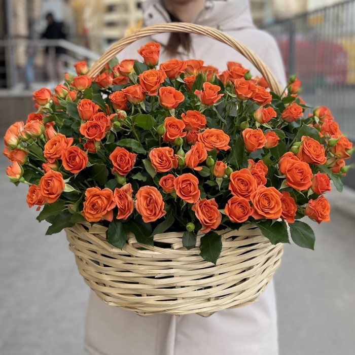 Яркая, оранжевая кустовая роза Чарминг Бейб в корзине, станет незабываемым сюрпризом для любимой.