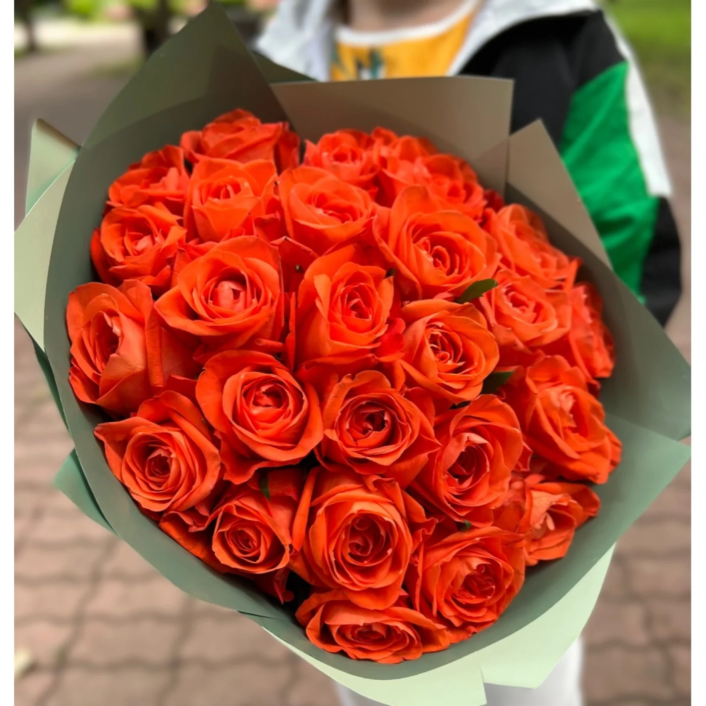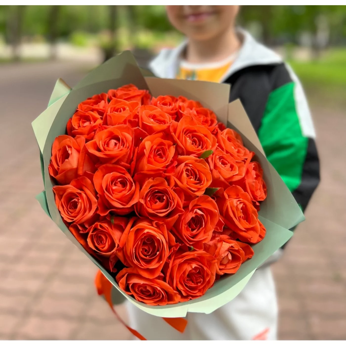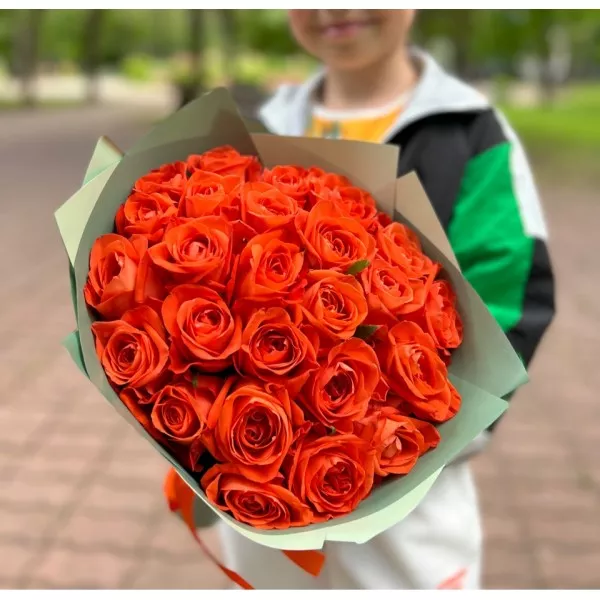 Большой и пышный букет из 25 оранжевых роз Копакабана будет выделяться на фоне других композиций и подарков. Яркие, крупные бутоны будто горят в оранжевых лучах солнца. Букет можно преподнести амбициозным, смелым девушкам. Кричащий, пламенный цвет принесет ощущение радости и счастья любому, кто на него посмотрит. Такая композиция станет чудесным подарком на семейное торжество, свидание, корпоративный праздник.