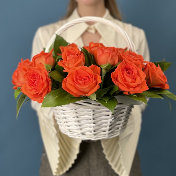 Эффектная корзина с 25 розами сорта Копакабана насыщенного оранжевого цвета — это яркое и солнечное воплощение энергии и жизнелюбия.