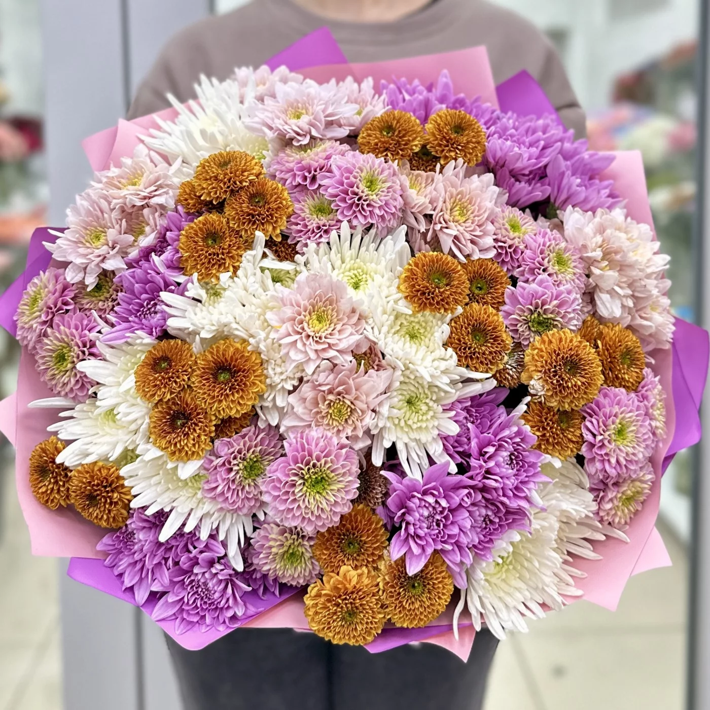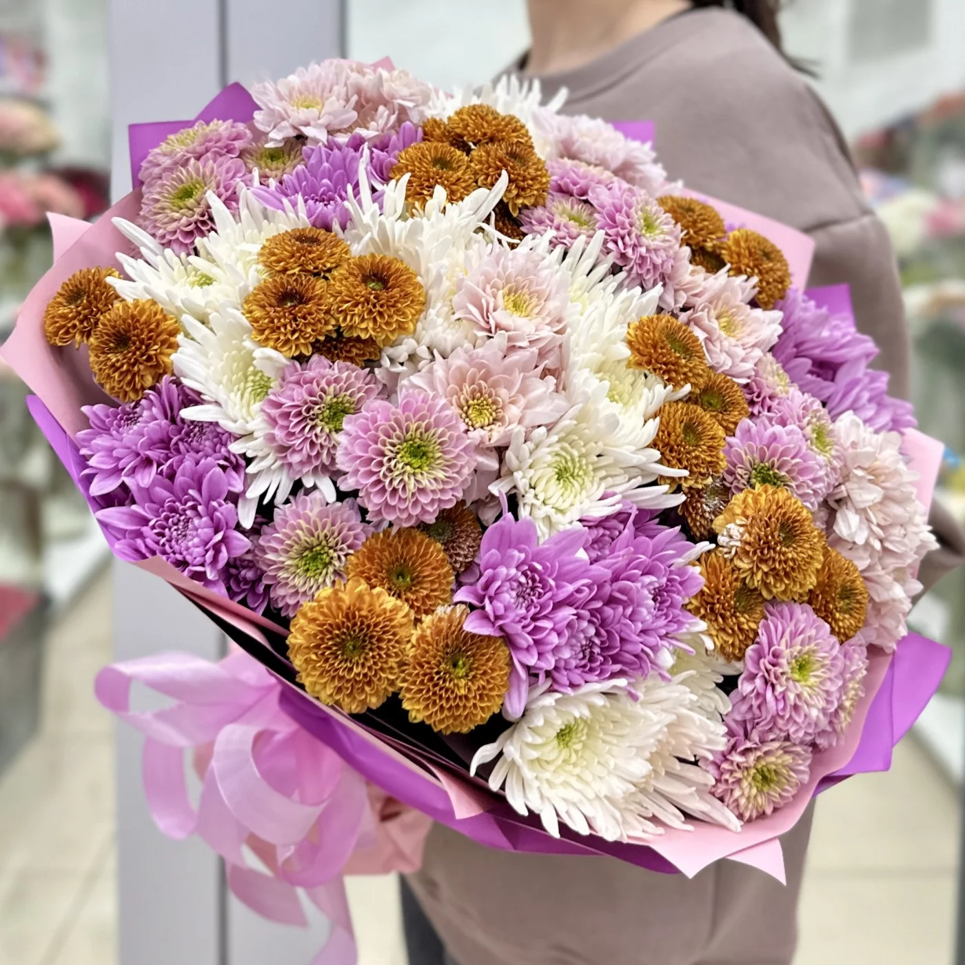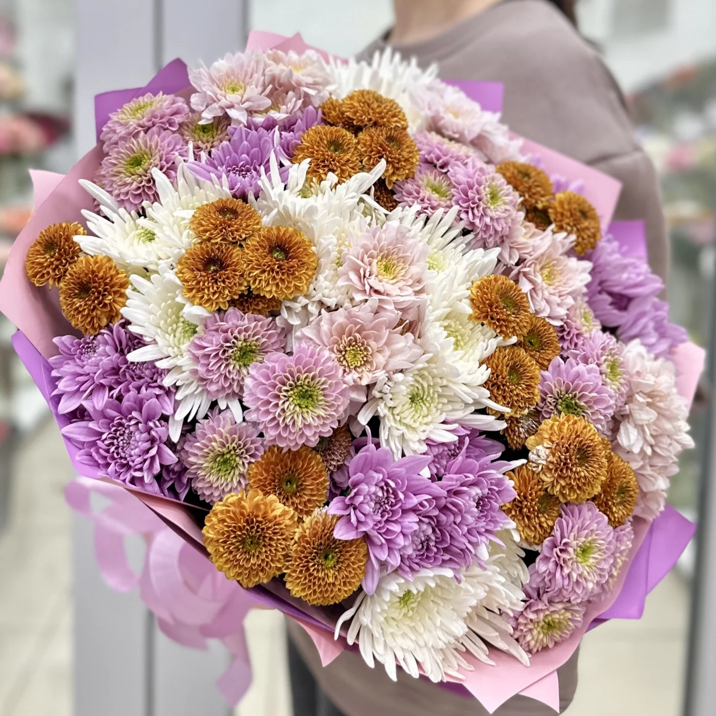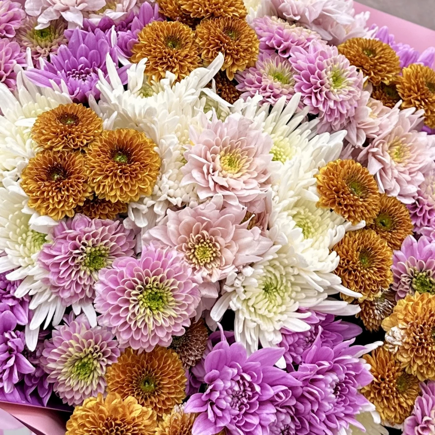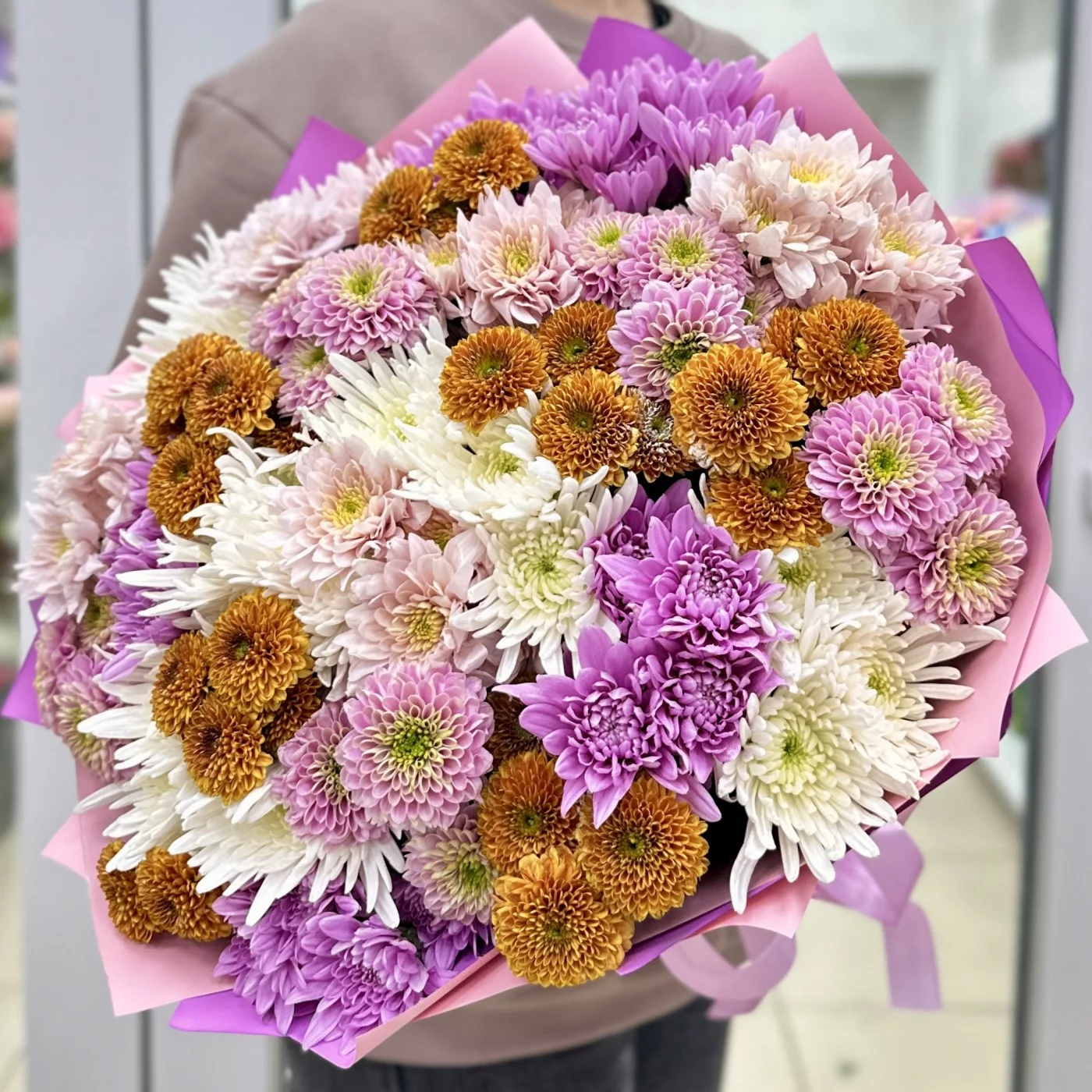 Букет из 25 осенних хризантем в миксе — это яркое и стильное решение для украшения интерьера или в качестве подарка. Осенние хризантемы отличаются разнообразием оттенков и форм, что делает их идеальными для создания эффектных композиций.