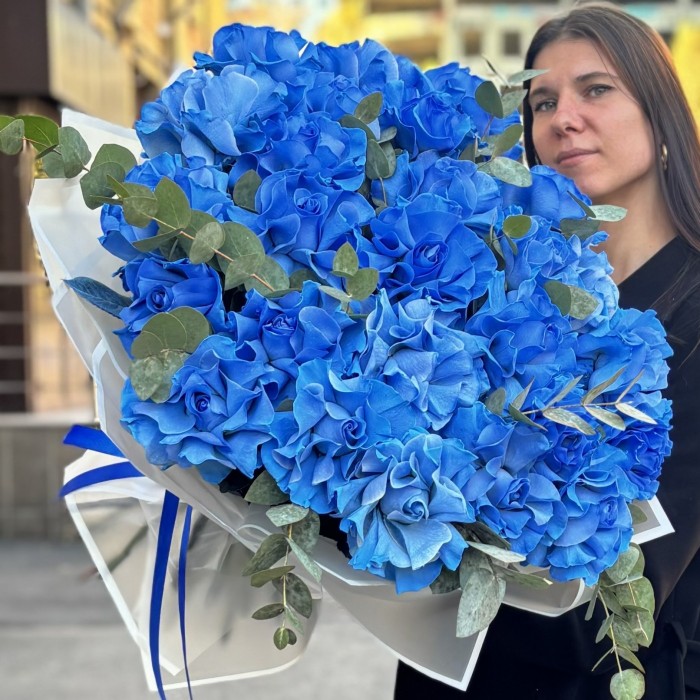 Букет из 25 пышных голубых роз с ароматным эвкалиптом — это стильное и универсальное решение для любого случая, которое не оставит равнодушным никого!