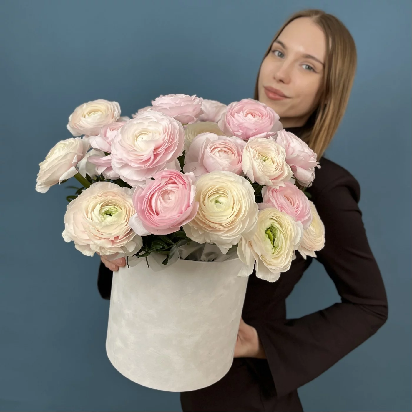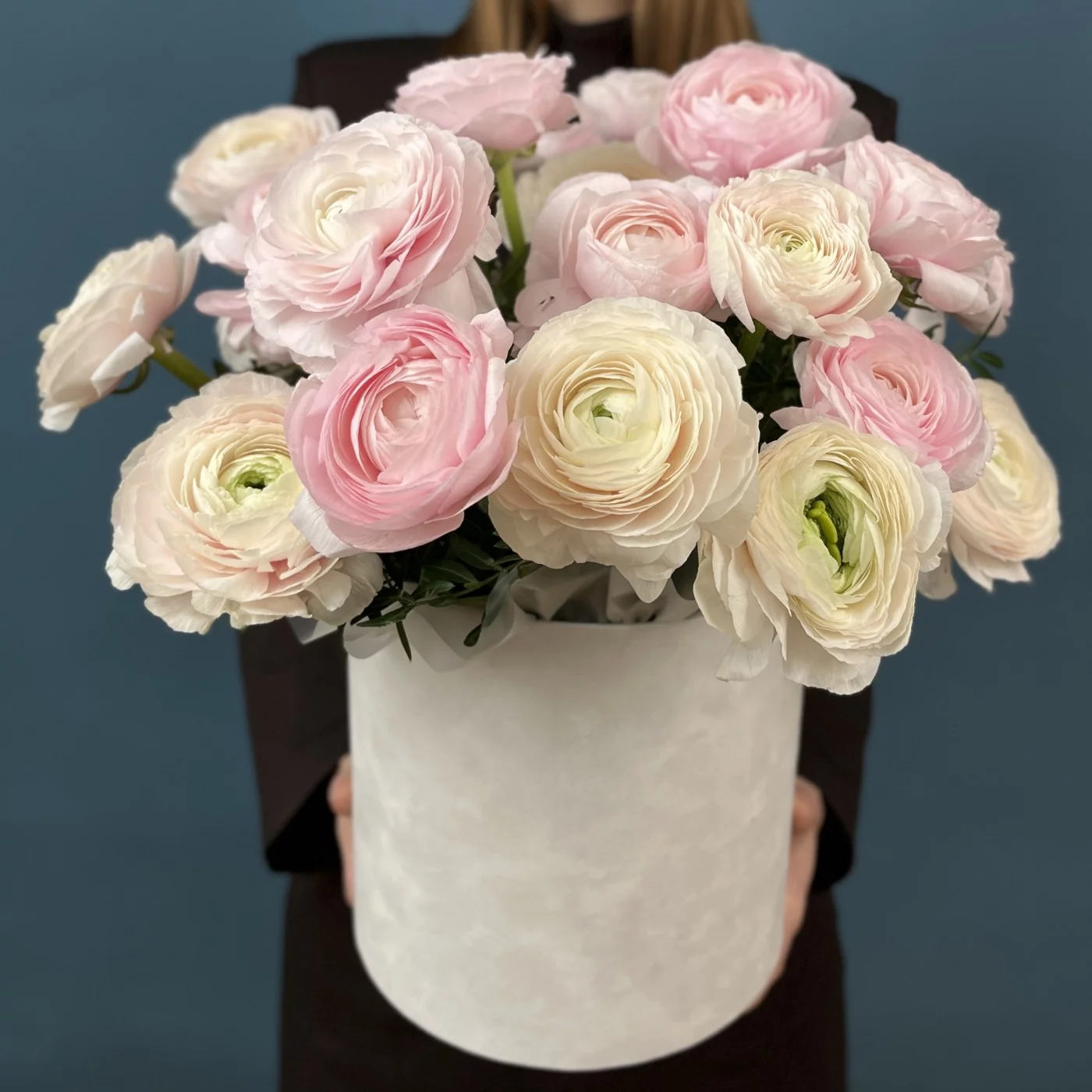 25 пышных розовых и розово-белых Ранункулбсов в коробке