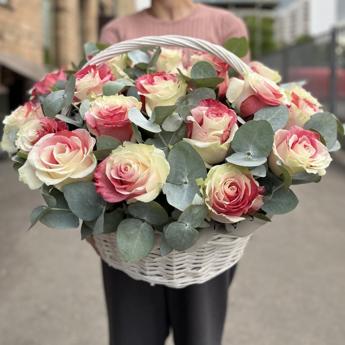 Эта великолепная корзина содержит 25 роз в ярких, радужных оттенках — белых и красных, создающих эффектный и насыщенный образ. Такой букет символизирует страсть, любовь и искренние чувства, а гармоничное сочетание цветов придает композиции особую выразительность. Идеальный подарок для особых случаев, чтобы порадовать близких или выразить свои самые теплые эмоции.