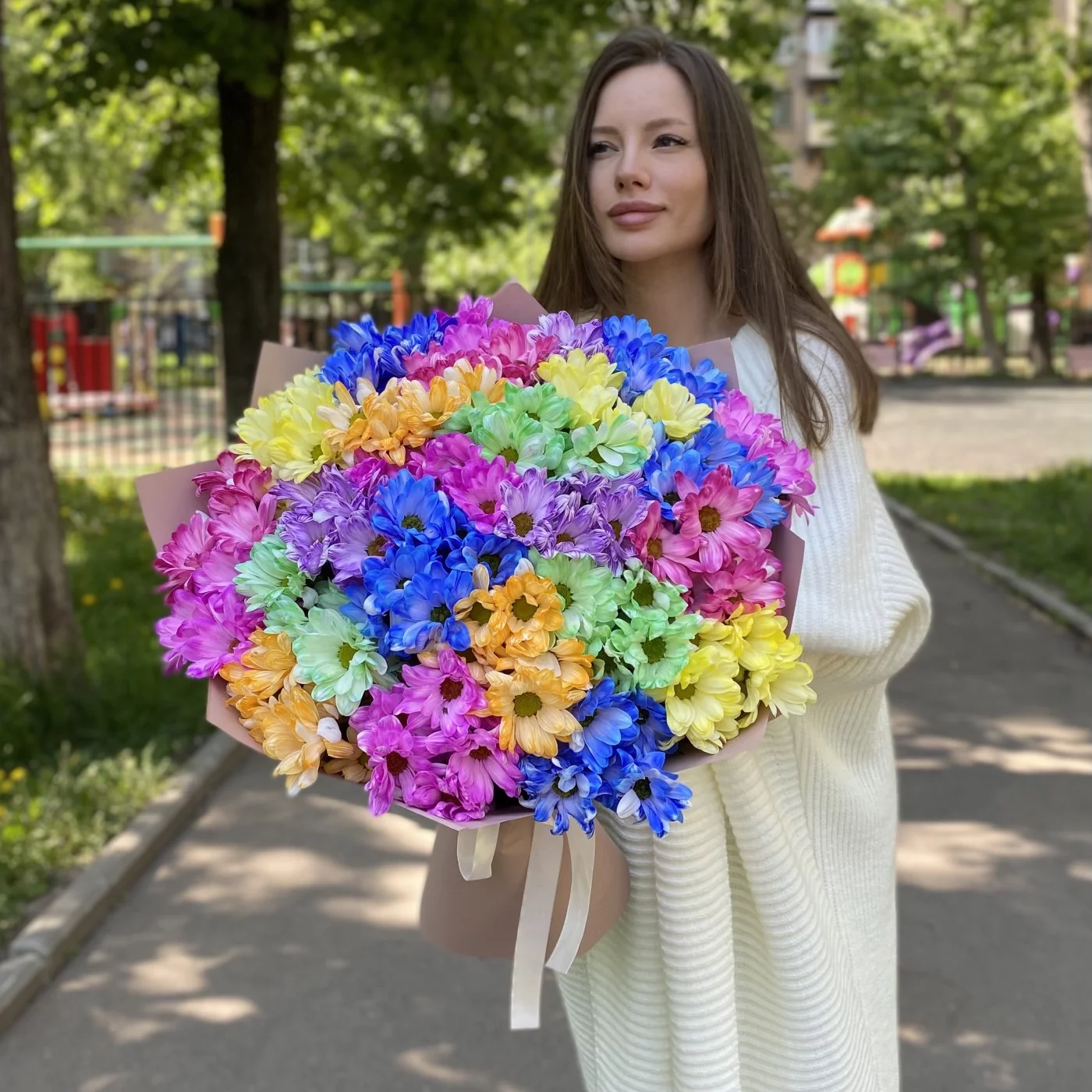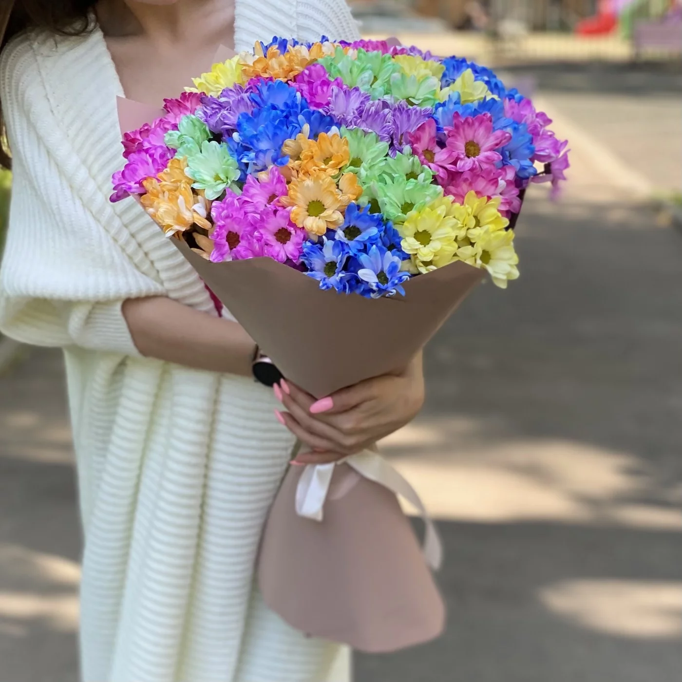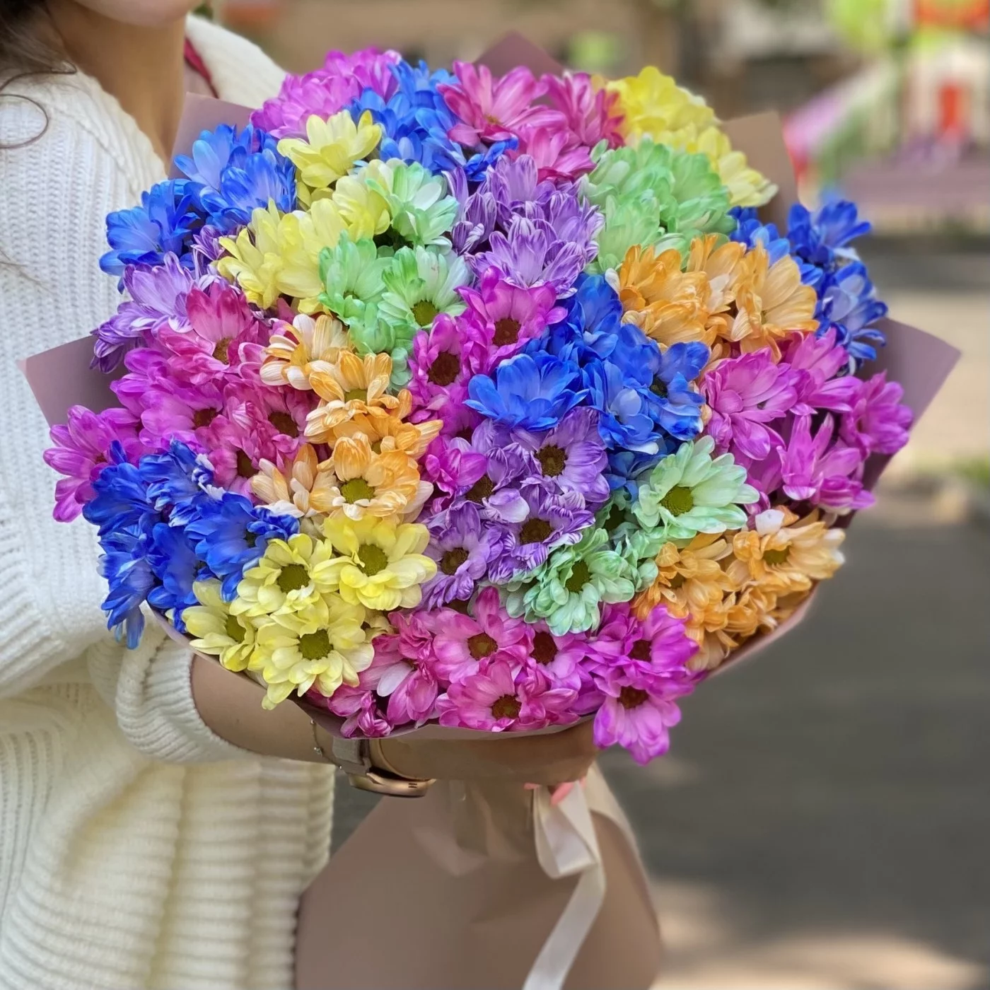 Большой букет из радужной кустовой хризантемы поднимет настроение своей получательнице и оставит яркое впечатление на долгое время.