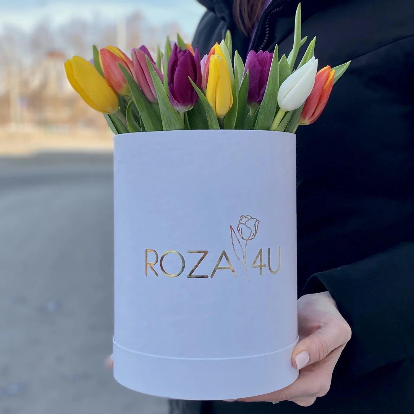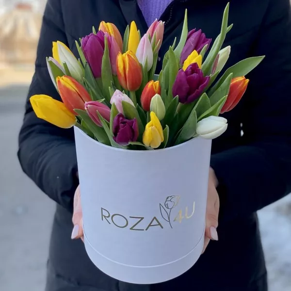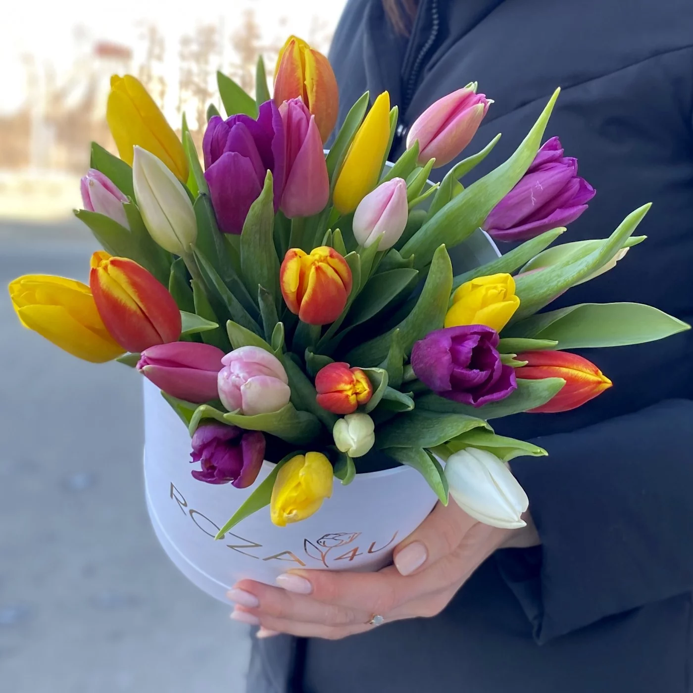 Коробка с 25 разноцветными тюльпанами. Преподнесите такую композиция в качестве подарка своим любимым женщинам к 8 марта.