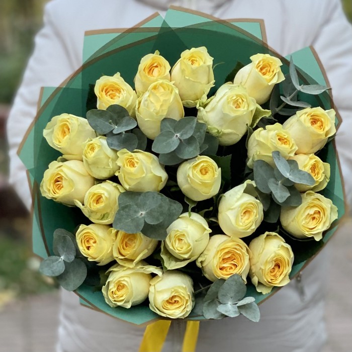 25 роз Баттеркап с эвкалиптом 35 см