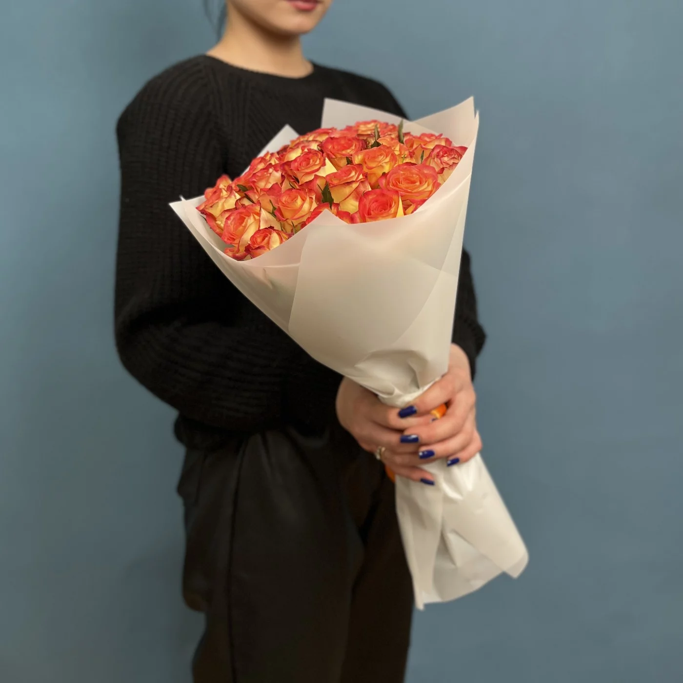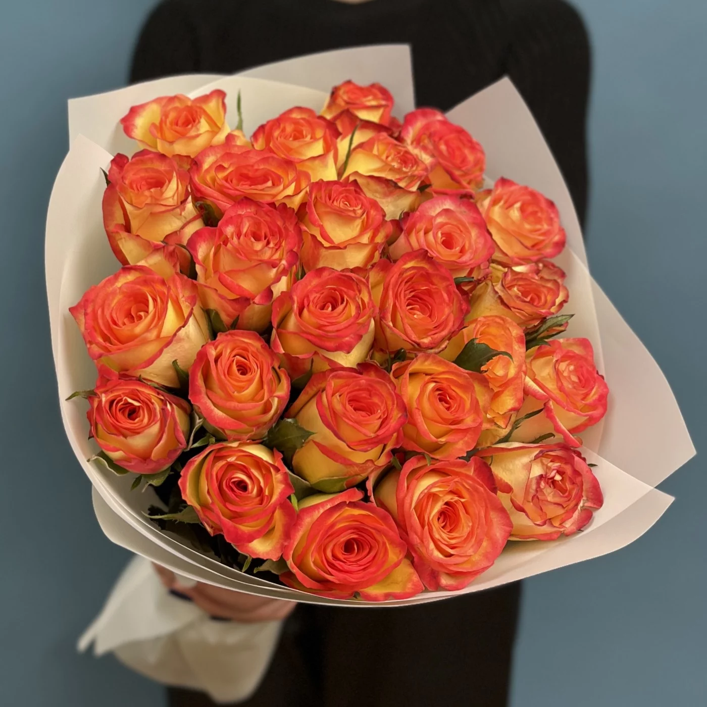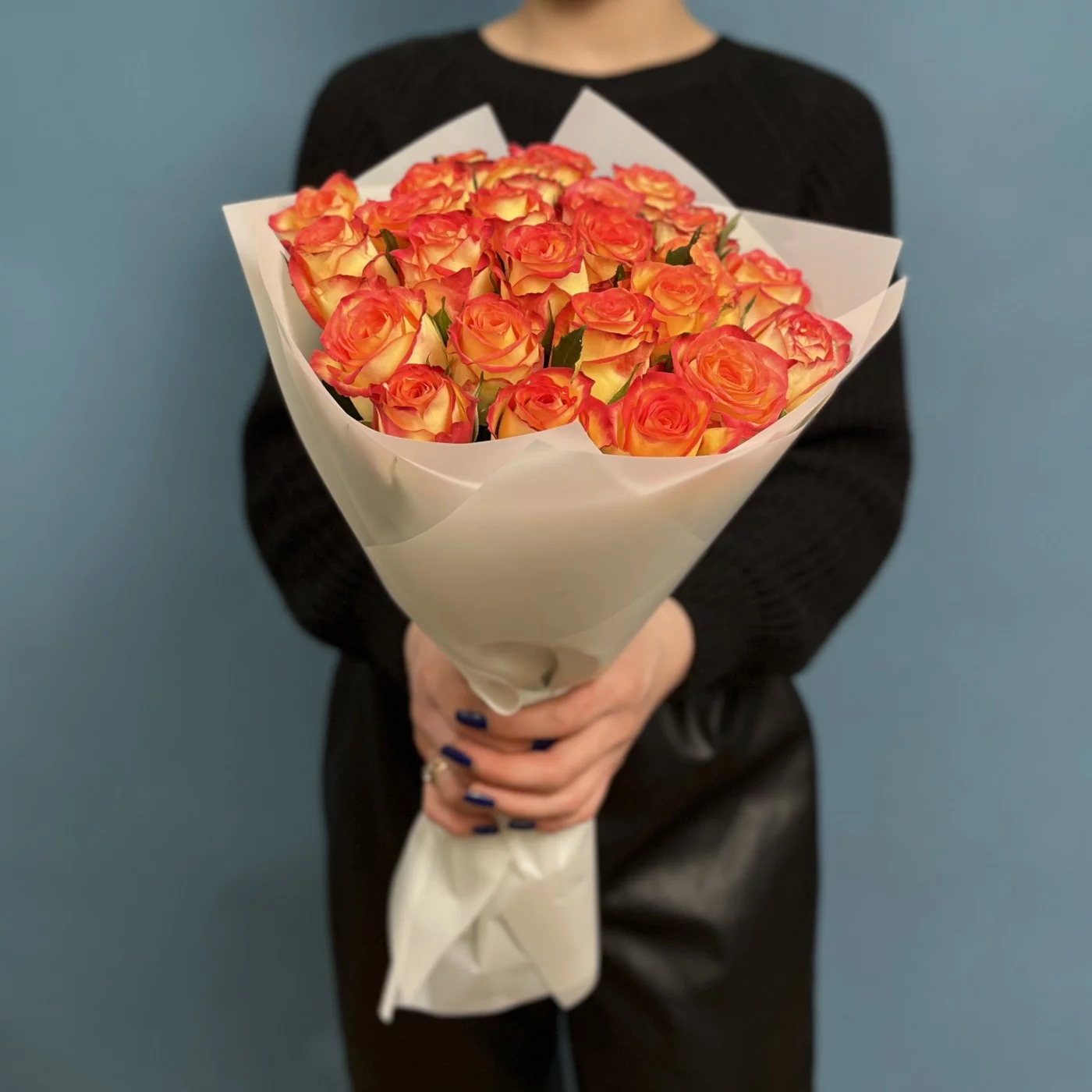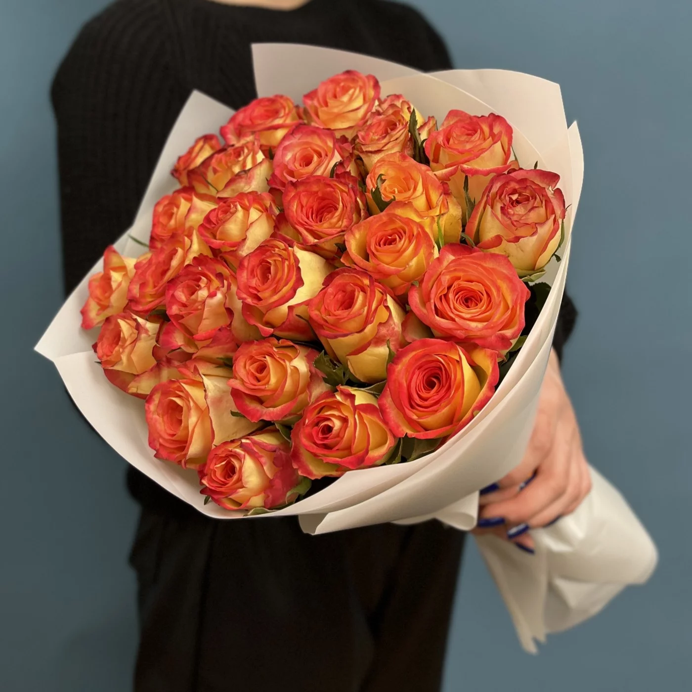 Букет из 25 оранжево-желтых роз Инка высотой 40 см впечатляет сочным сиянием оттенка, который напоминает солнечное тепло и живую энергию. Розы собраны так, что каждая из них подчёркивает объем и выразительность композиции, создавая ощущение динамики и совершенства. Он приносит радость благодаря яркости, аккуратности форм и способности моментально оживлять настроение. Преимущество этого букета в его позитивном характере и умении выделяться без излишней вычурности. Такой подарок подойдёт для поздравления с новым началом, успешным событием, для друга, коллеги, мужчины или женщины, а также для тех случаев, когда хочется подарить уверенность, поддержку и вдохновение. Наша