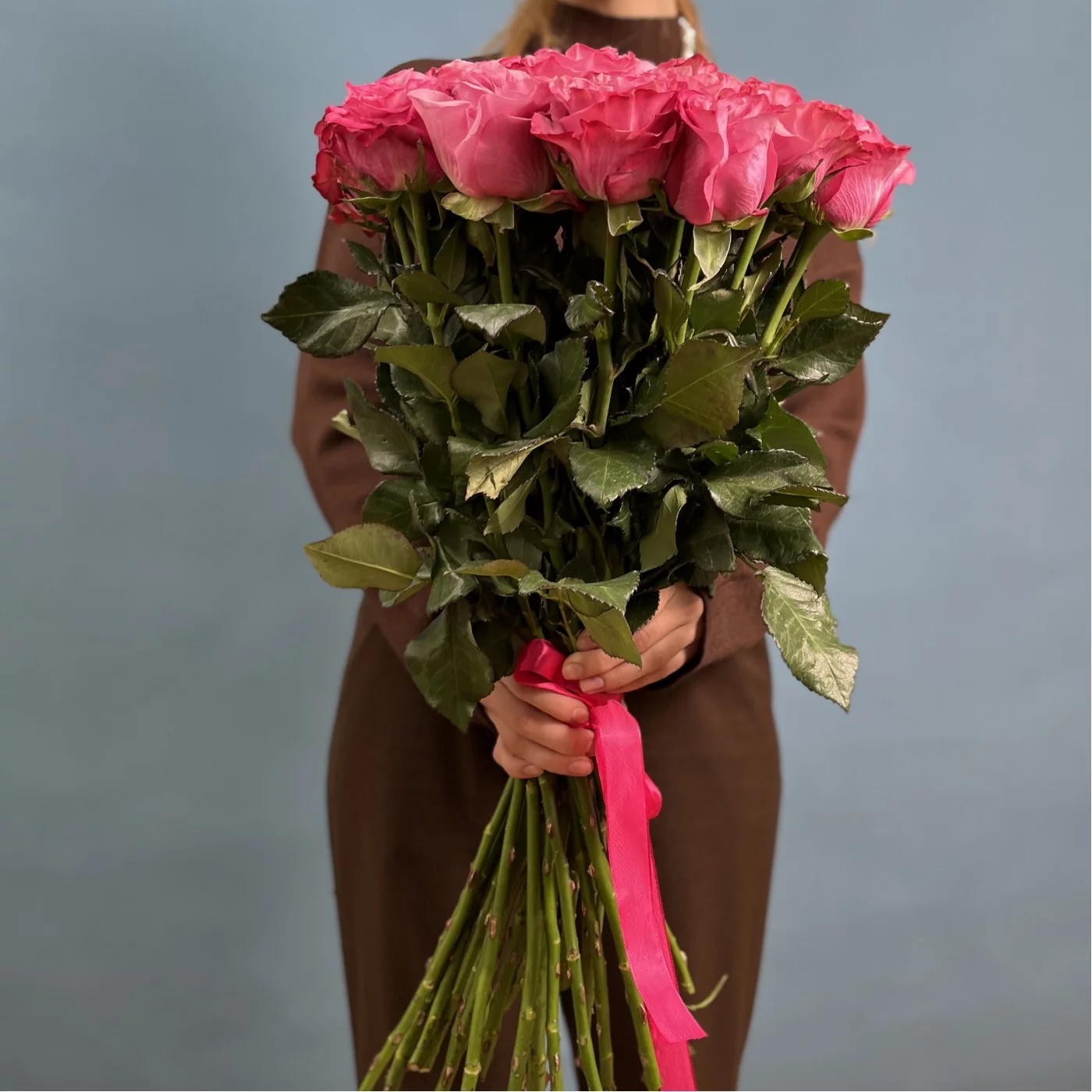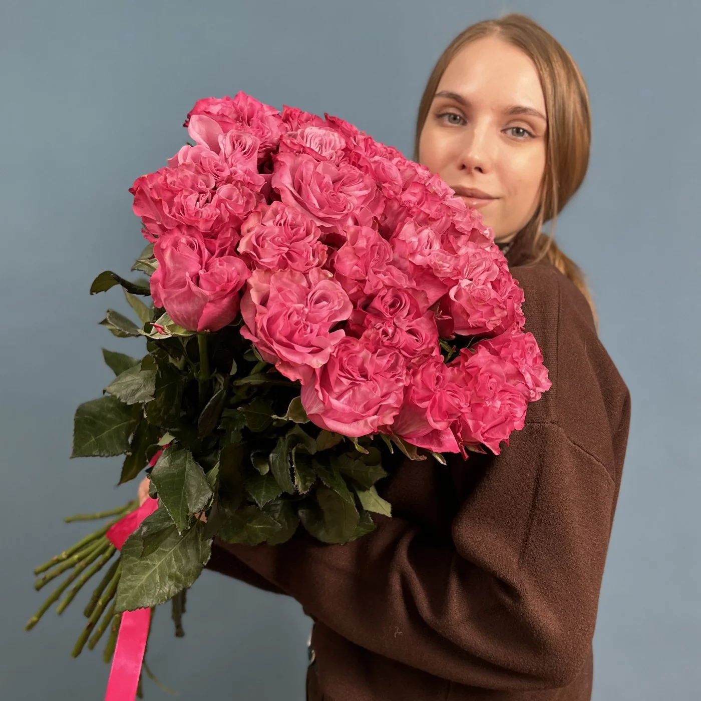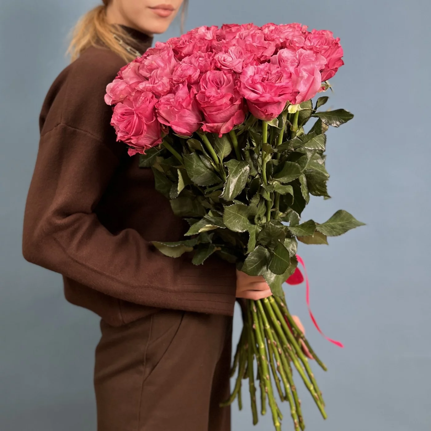 Изысканная пионовидная роза Кантри Блюз радует взор насыщенным розовым цветом и идеальной формой круглого бутона.Такой букет никак нельзя назвать банальным, настолько живописно и эффектно смотрятся эти сочные тяжелые бутоны даже без каких-либо дополнений и украшений.Невероятно женственные пионовидные розы станут прекрасным посланием для девушки любого возраста, будь то личный подарок или деловое поздравление.Букет из 25 пионовидных роз Кантри блюз можно дополнить стильной корейской цветной пленкой или крафтовой бумагой.