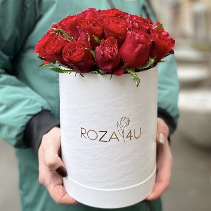 Состав букета: Розы - 25 шт., шляпная коробка для цветов