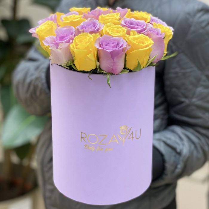 Состав букета: желтые и фиолетовые розы - 25 шт., шляпная коробка для цветов.