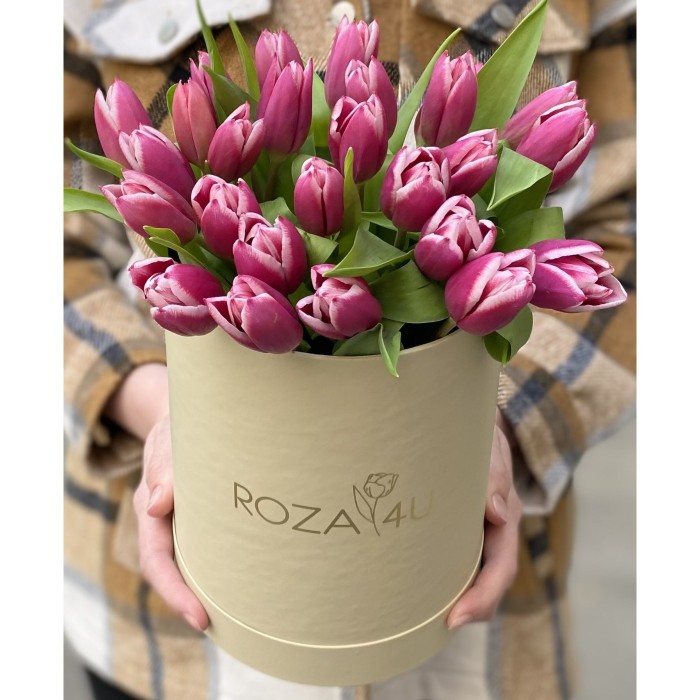 Коробка с 25 розово-белыми тюльпанами. Преподнесите такую композиция в качестве презента своим любимым людям. Прекрасный подарок к 8 марта.