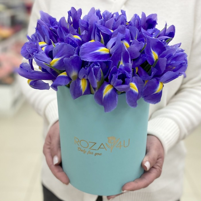 Яркие синие ирисы в голубой коробке.