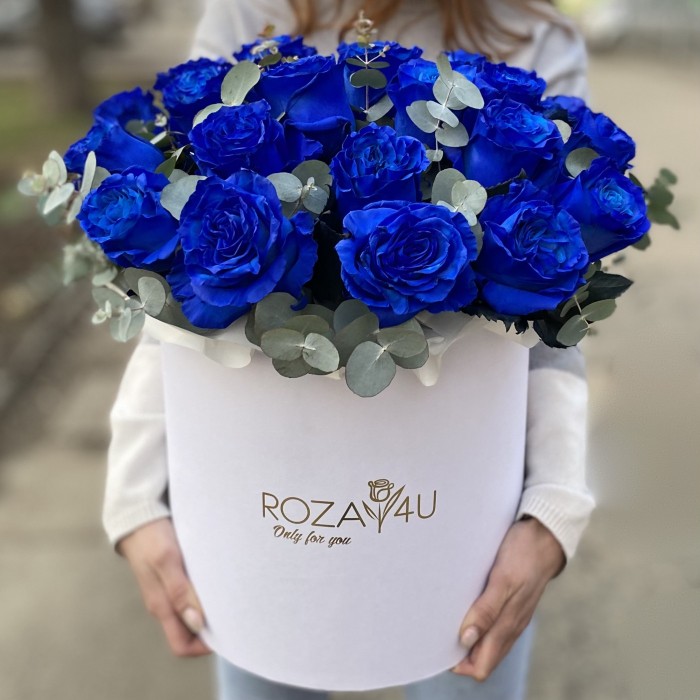 Стильная коробочка из 25 синих роз и ароматного эвкалипта, произведет незабываемое впечатление на Вашу любимую!