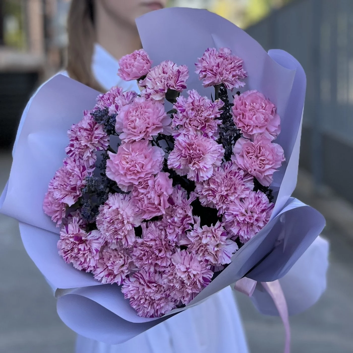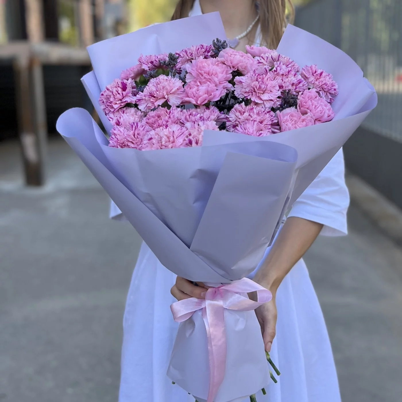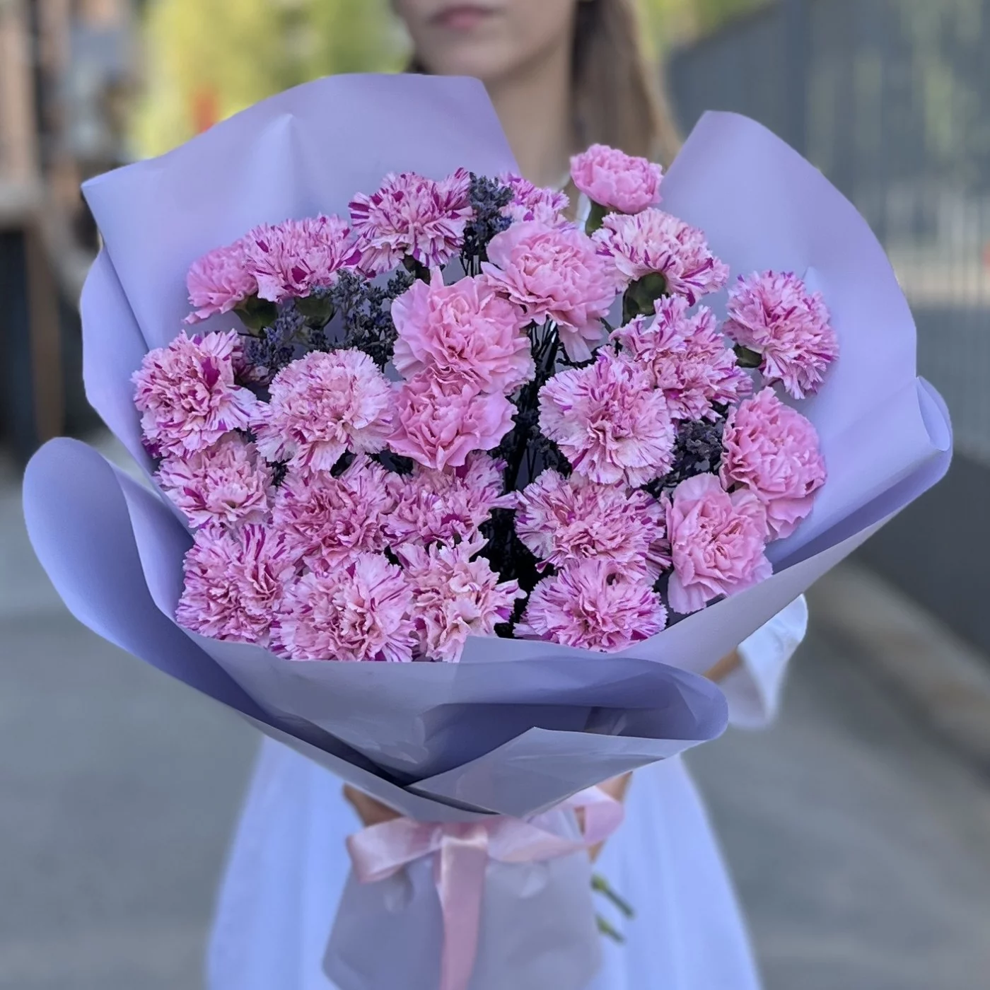 Букет из 25 сиреневых гвоздик с лимониумом — это изящная и свежая композиция, сочетающая в себе нежность и лёгкую воздушность. Гвоздики в мягком сиреневом оттенке придают букету утончённость и романтичность, их бархатистые лепестки создают приятную текстуру и насыщенный цветовой акцент. Лимониум добавляет композиции лёгкости и изящества своими мелкими, словно искрящимися цветочками, которые словно окутывают гвоздики нежным фоном. Вместе эти цветы создают гармоничный и сбалансированный букет, идеально подходящий для выражения нежных чувств, дружбы и искренних пожеланий.