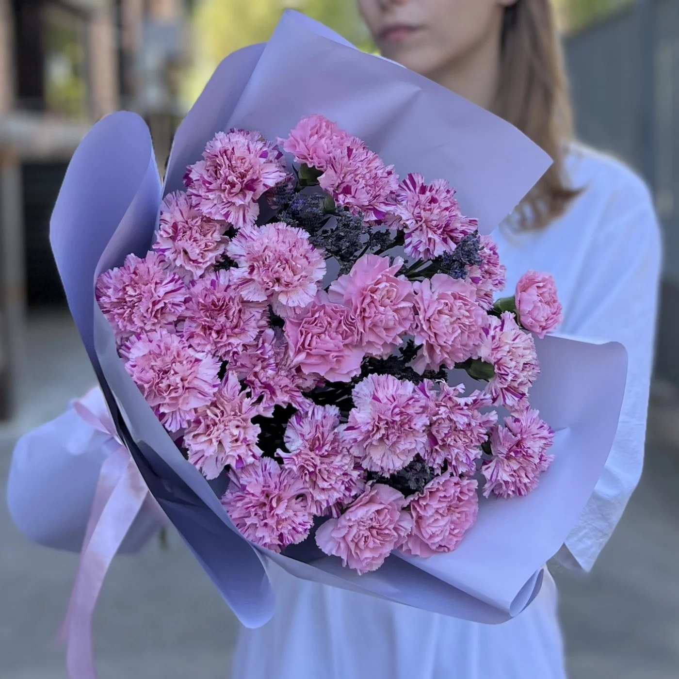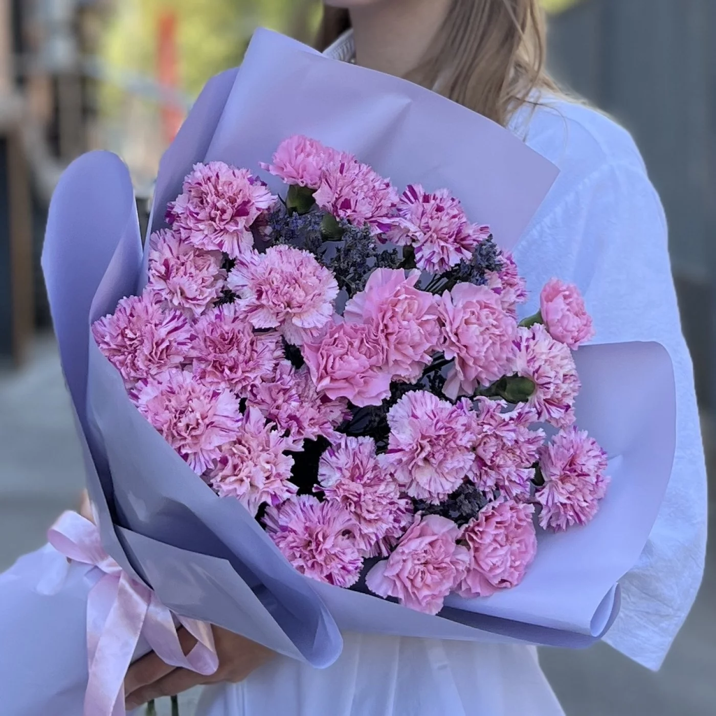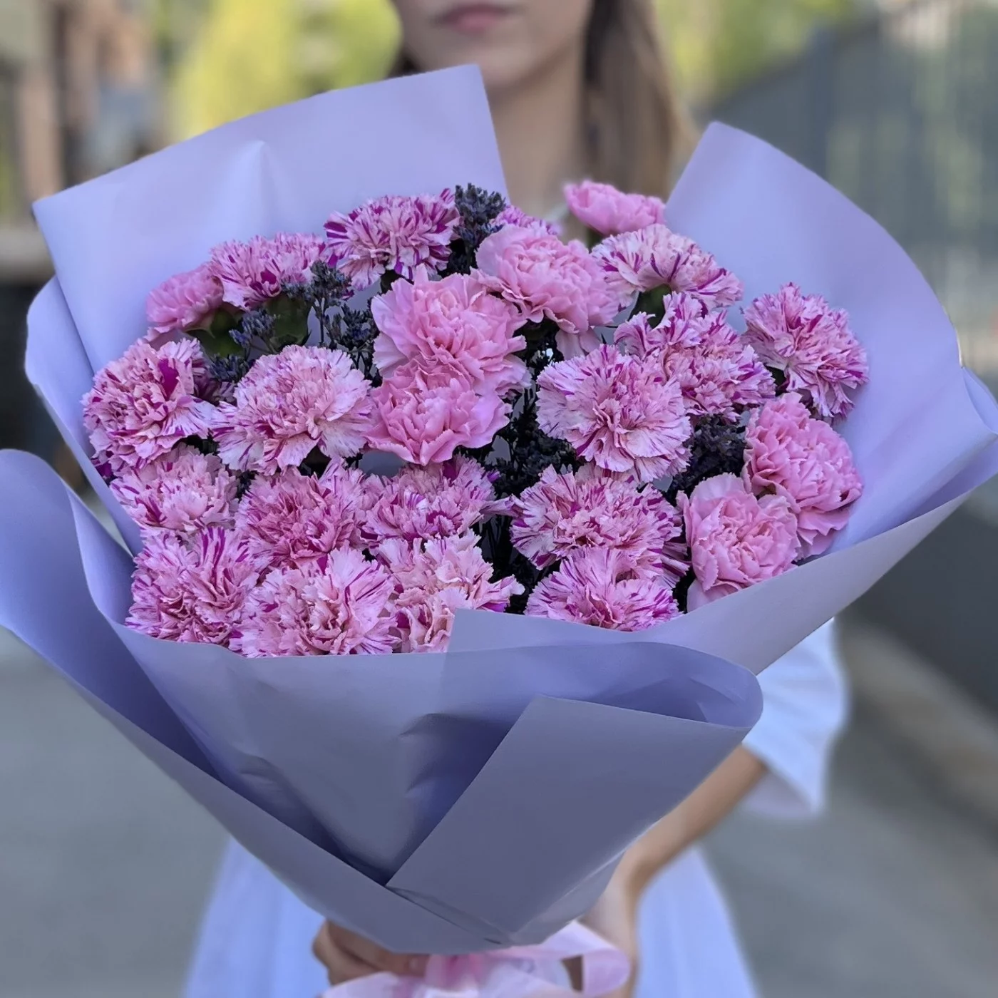 Букет из 25 сиреневых гвоздик с лимониумом — это изящная и свежая композиция, сочетающая в себе нежность и лёгкую воздушность. Гвоздики в мягком сиреневом оттенке придают букету утончённость и романтичность, их бархатистые лепестки создают приятную текстуру и насыщенный цветовой акцент. Лимониум добавляет композиции лёгкости и изящества своими мелкими, словно искрящимися цветочками, которые словно окутывают гвоздики нежным фоном. Вместе эти цветы создают гармоничный и сбалансированный букет, идеально подходящий для выражения нежных чувств, дружбы и искренних пожеланий.