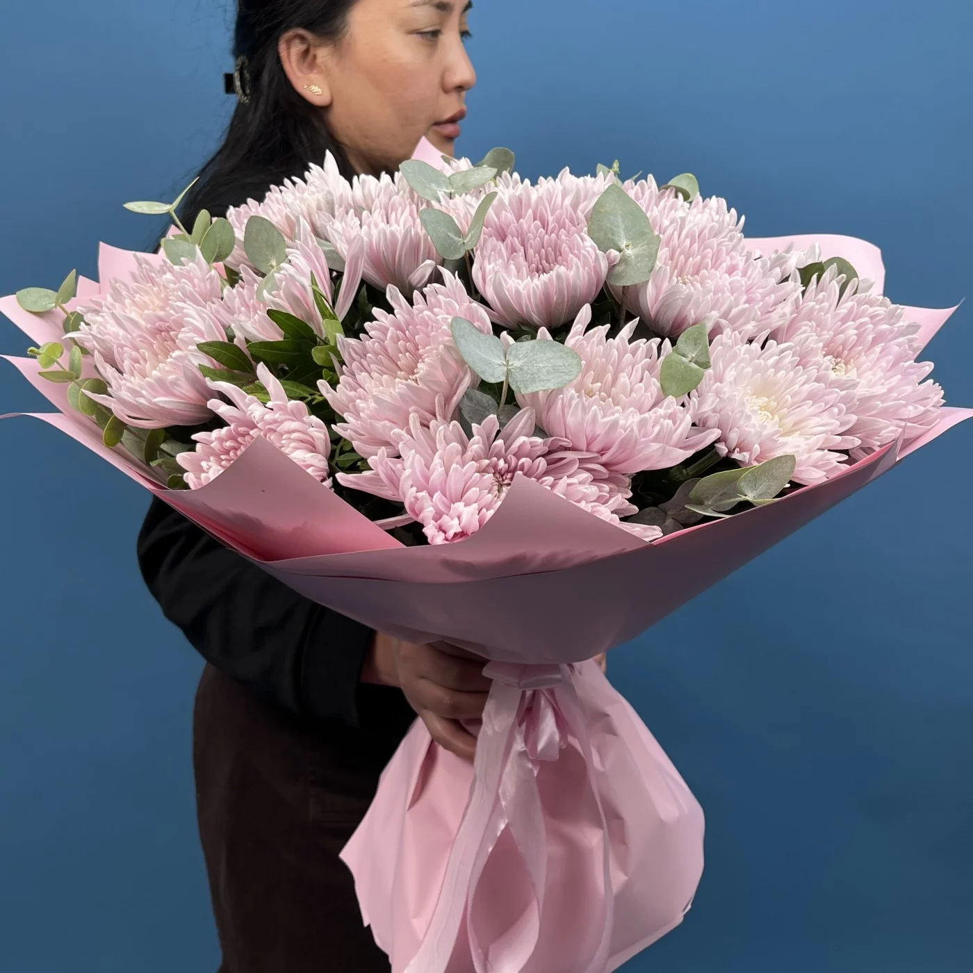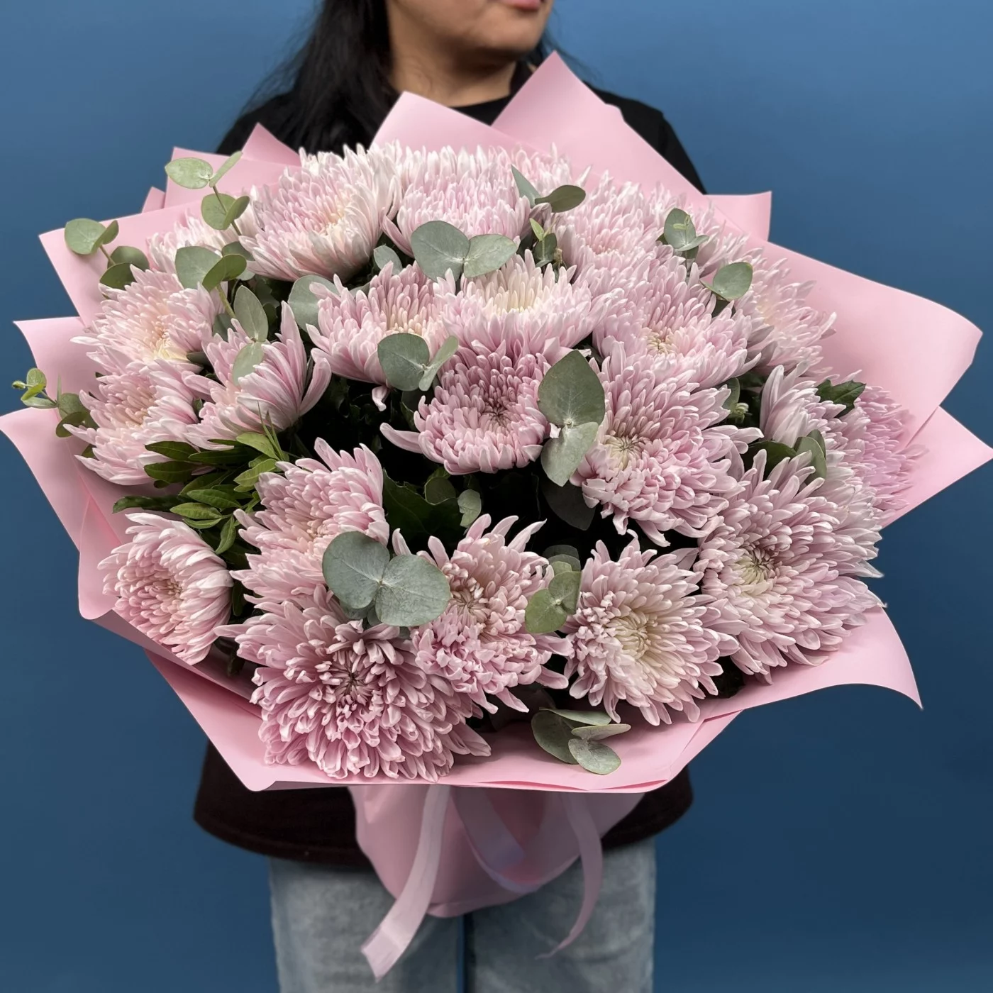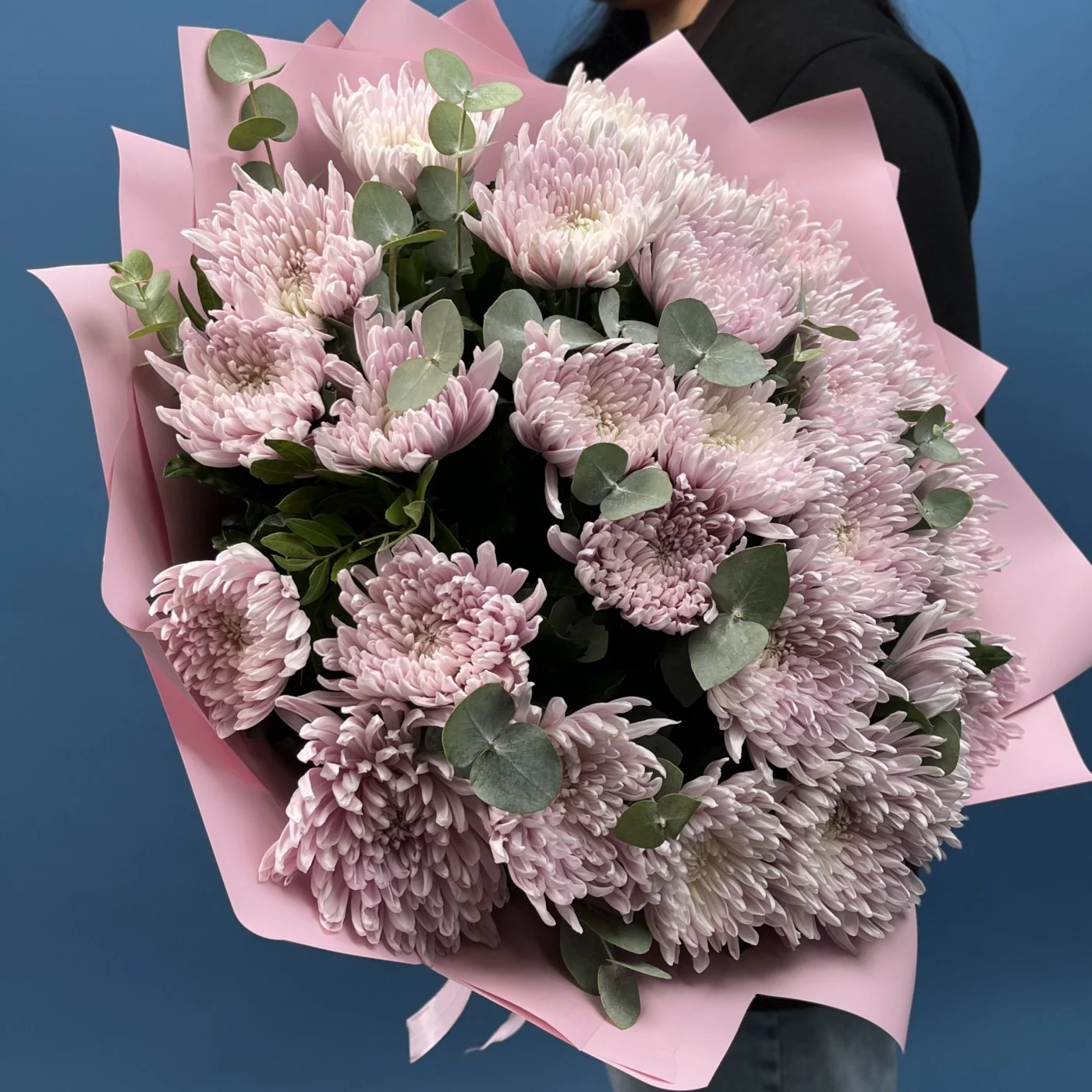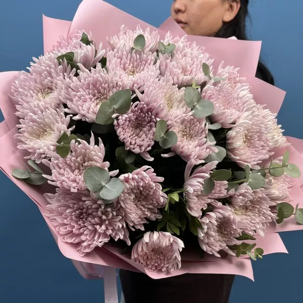 Пышный букет из 25 сиреневых хризантем с эвкалиптом поможет продемонстрировать уважение, любовь, бережное отношение к родному и близкому человеку. Такие цветы обожают практичные и сильные женщины.