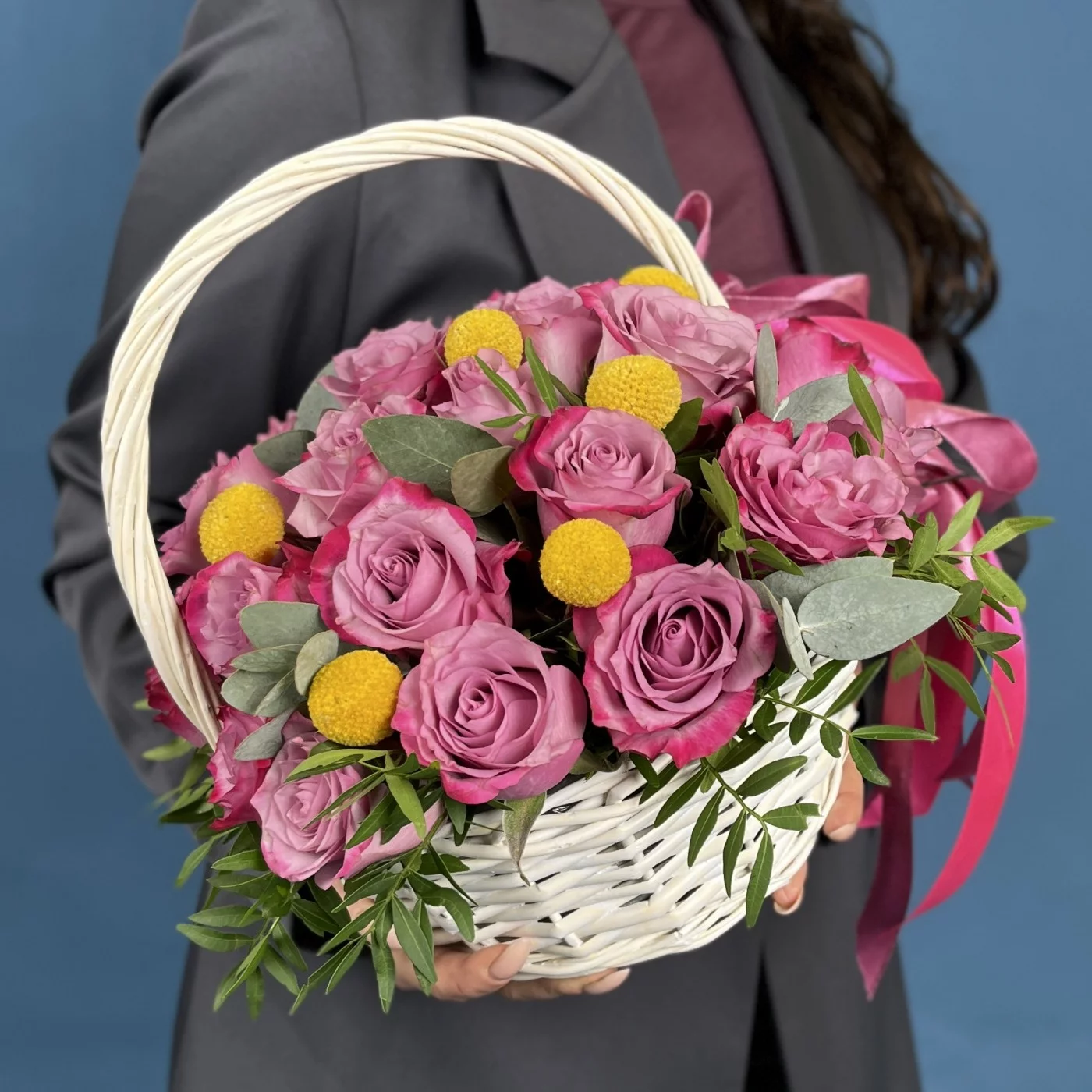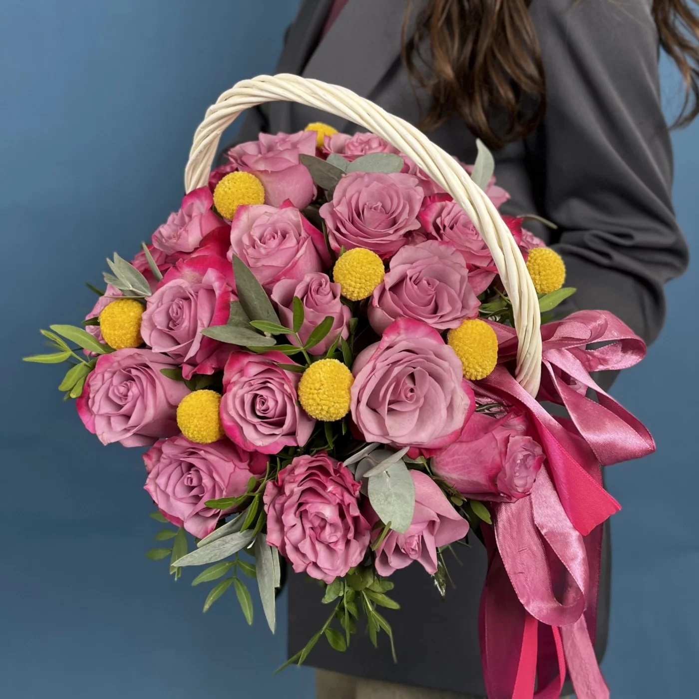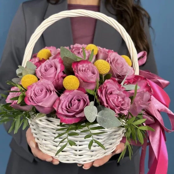 Композиция из 25 фиолетовых роз Дип Перпл с краспедией в изящной корзине восхищает глубиной цвета и необычным сочетанием фактур, создающим ощущение продуманной гармонии и совершенства. Контраст мягких лепестков и округлых солнечных акцентов делает оформление живым, выразительным и по-настоящему радующим взгляд. Преимущество такой композиции в её оригинальности, элегантности и умении выделяться, не теряя утончённости. Она подойдёт для поздравления с творческими успехами, для человека с ярким характером, для любимой женщины, вдохновляющего наставника или в качестве подарка на значимую дату, когда важно подчеркнуть индивидуальность и внимание. Наша