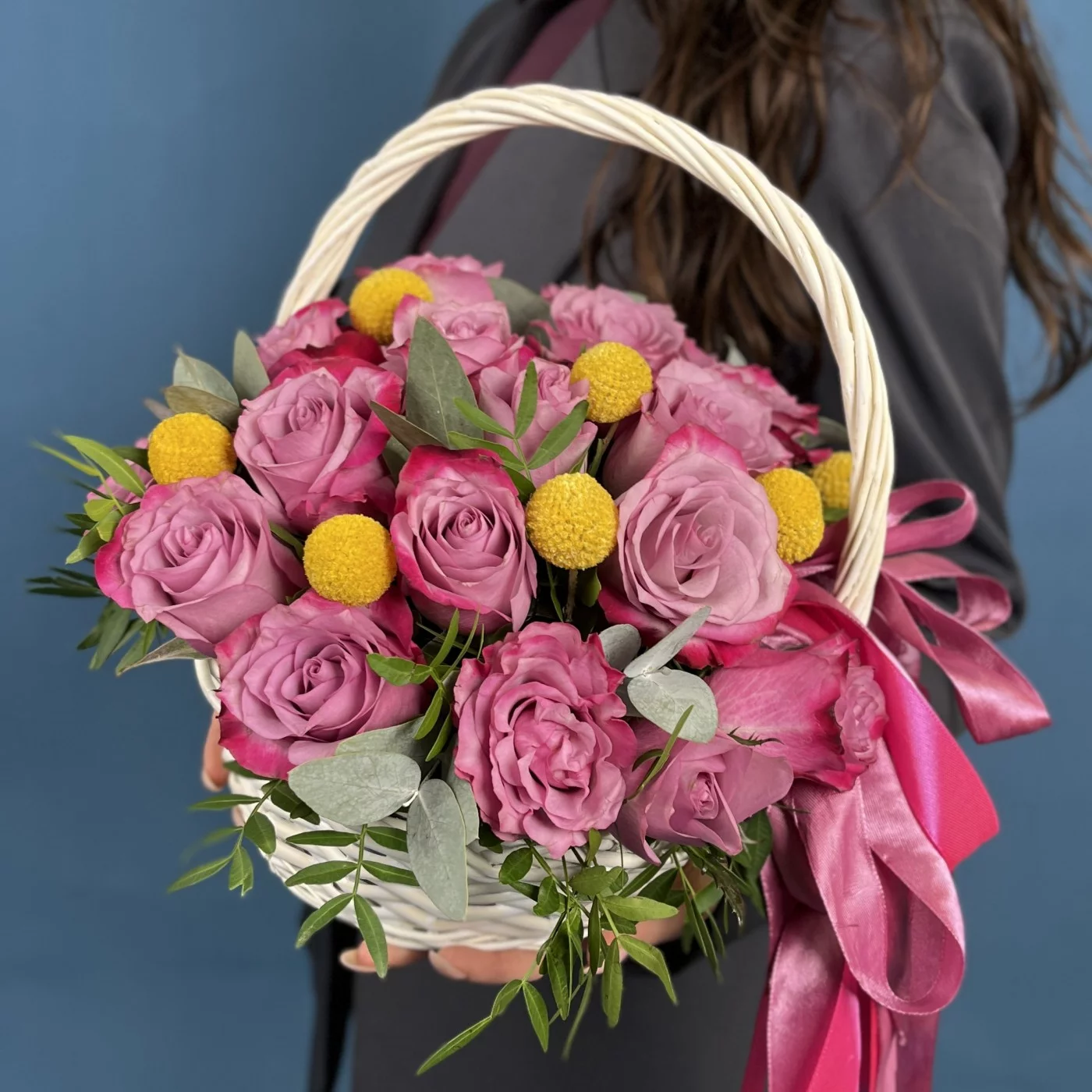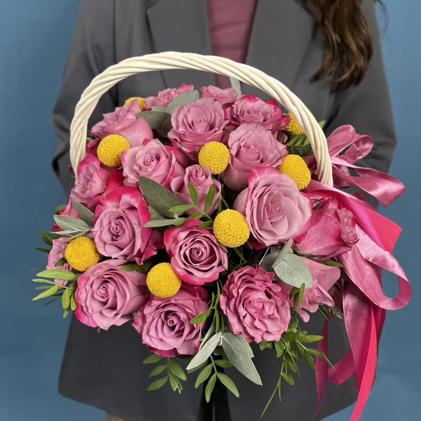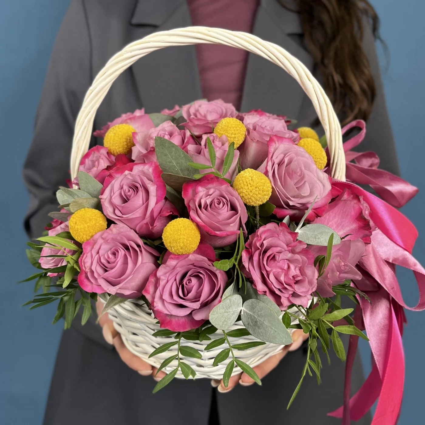 Композиция из 25 фиолетовых роз Дип Перпл с краспедией в изящной корзине восхищает глубиной цвета и необычным сочетанием фактур, создающим ощущение продуманной гармонии и совершенства. Контраст мягких лепестков и округлых солнечных акцентов делает оформление живым, выразительным и по-настоящему радующим взгляд. Преимущество такой композиции в её оригинальности, элегантности и умении выделяться, не теряя утончённости. Она подойдёт для поздравления с творческими успехами, для человека с ярким характером, для любимой женщины, вдохновляющего наставника или в качестве подарка на значимую дату, когда важно подчеркнуть индивидуальность и внимание. Наша