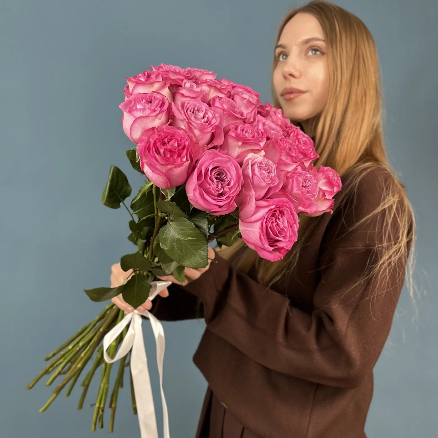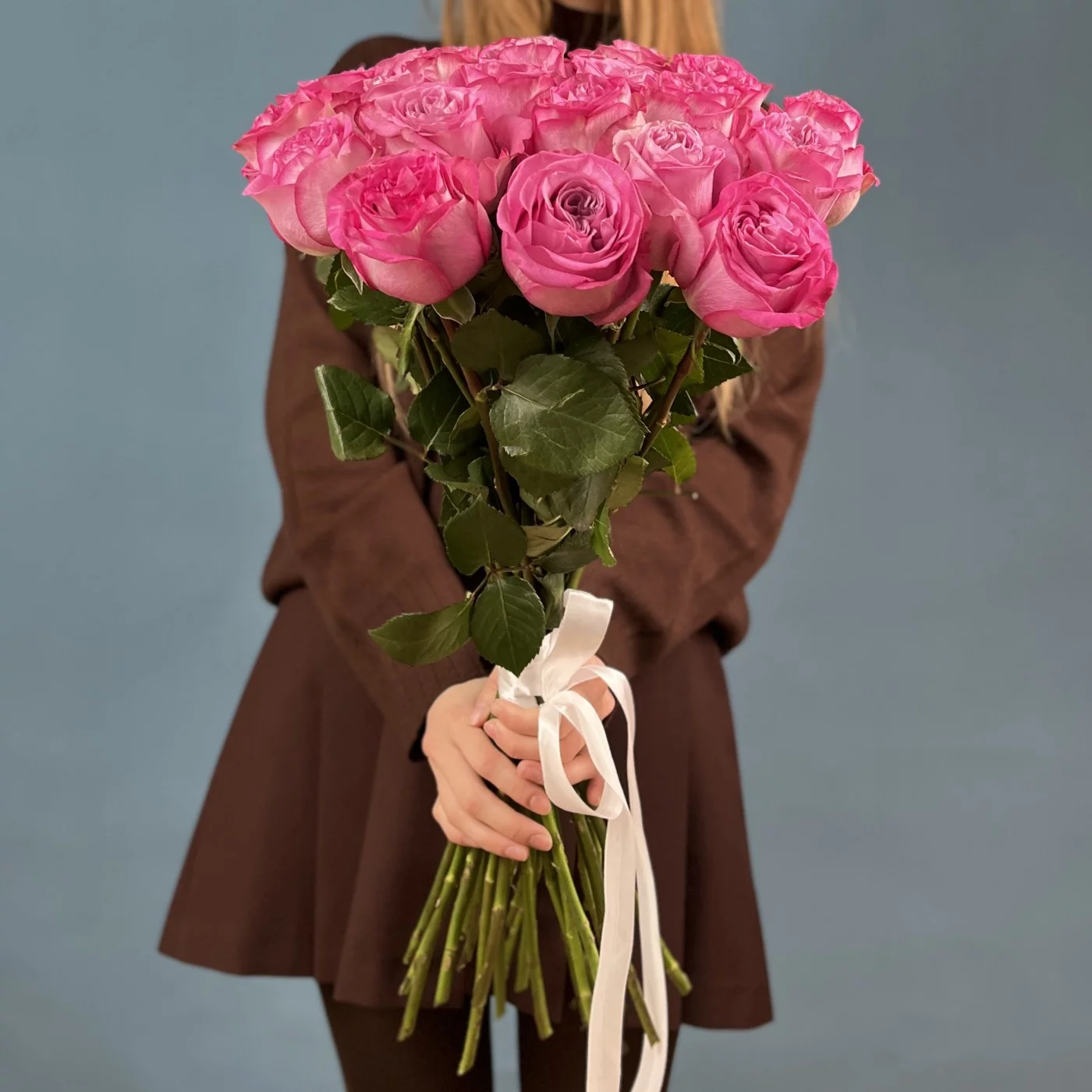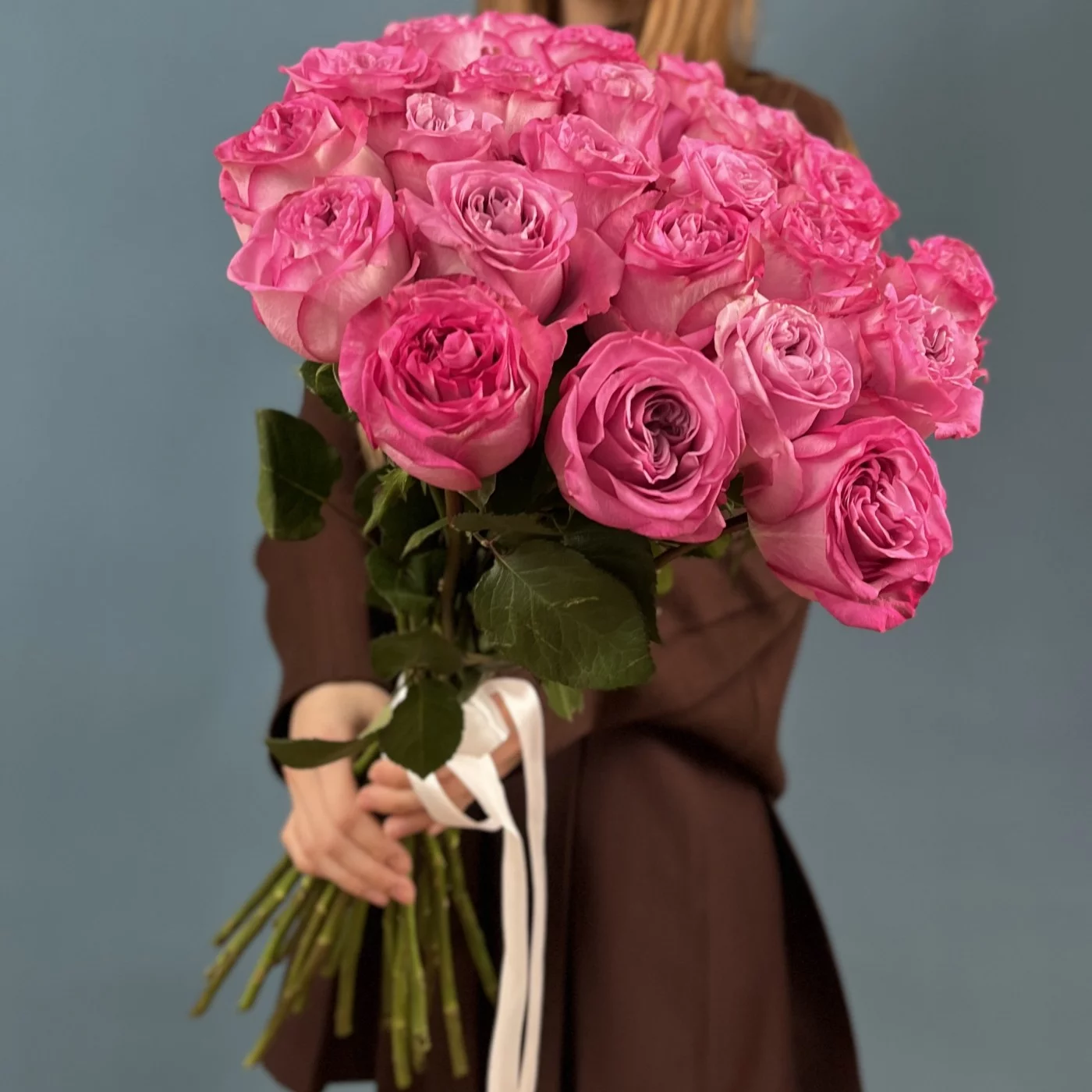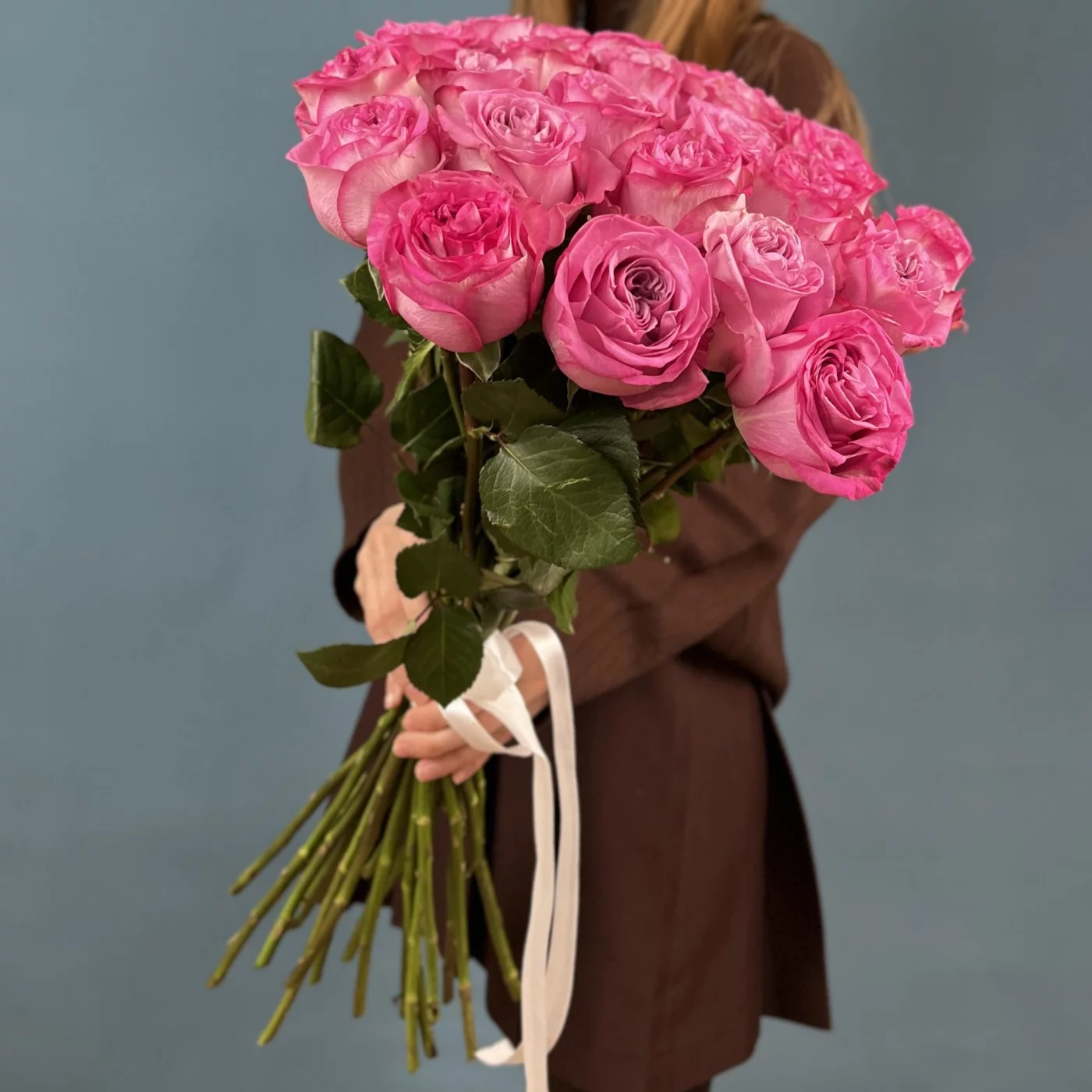 Пышные, большие бутоны долго сохраняют свою привлекательность, медленно раскрываясь и источая нежный цветочный аромат. Композицию дополняет элегантная упаковка и лента в цвет букету.