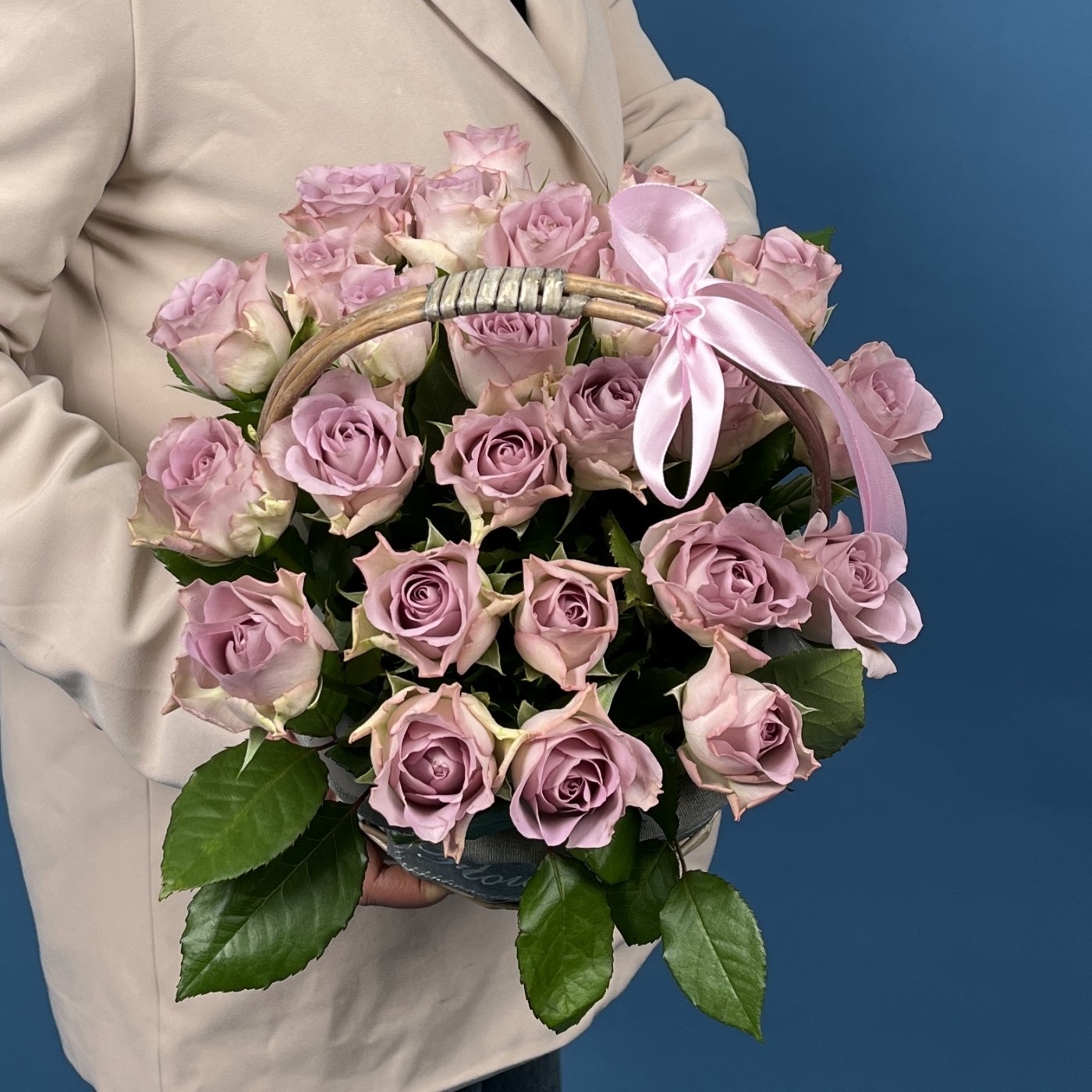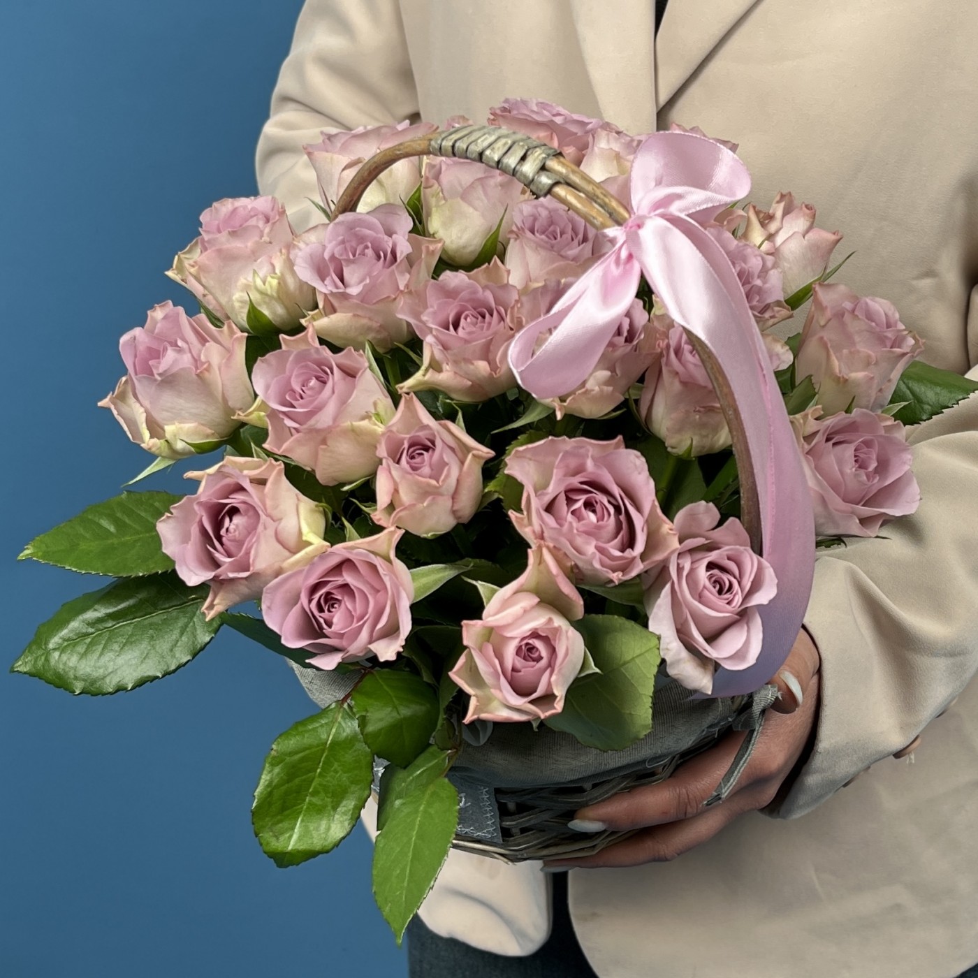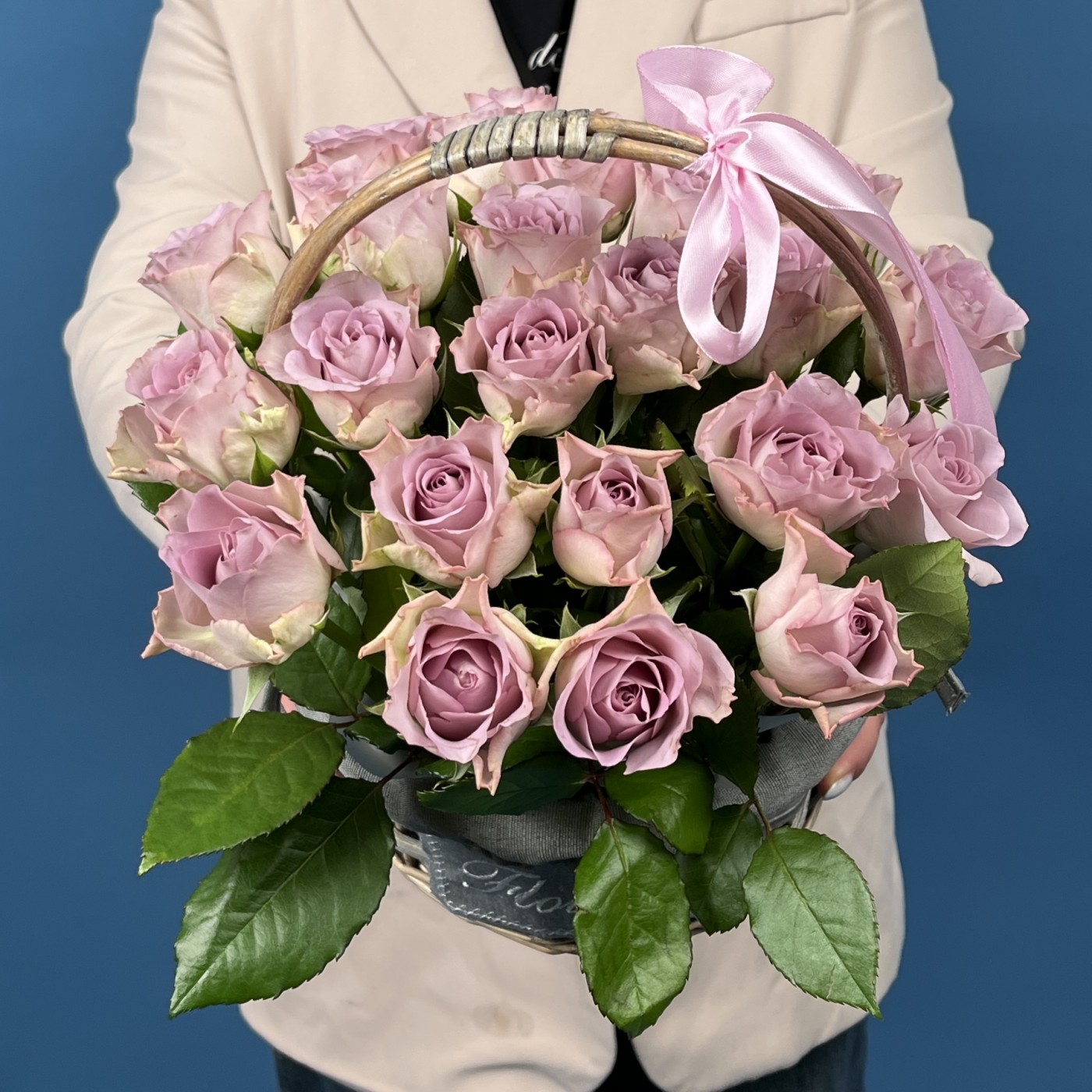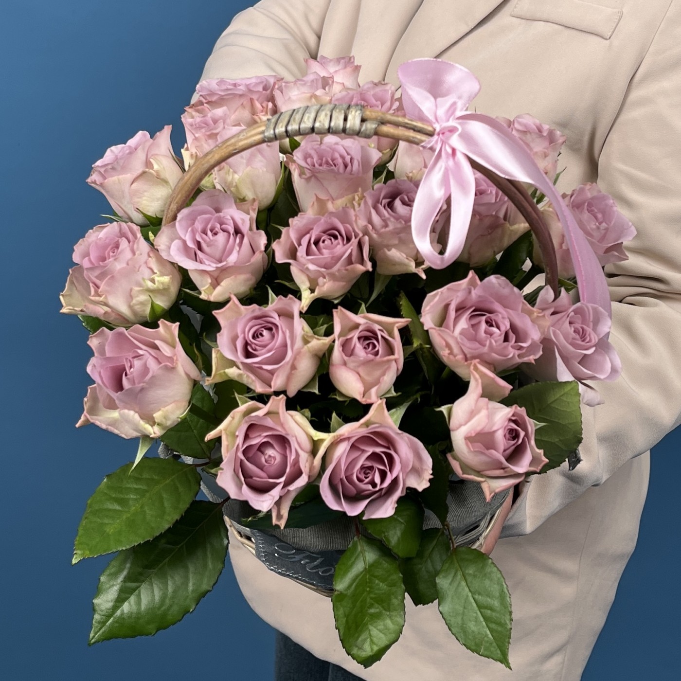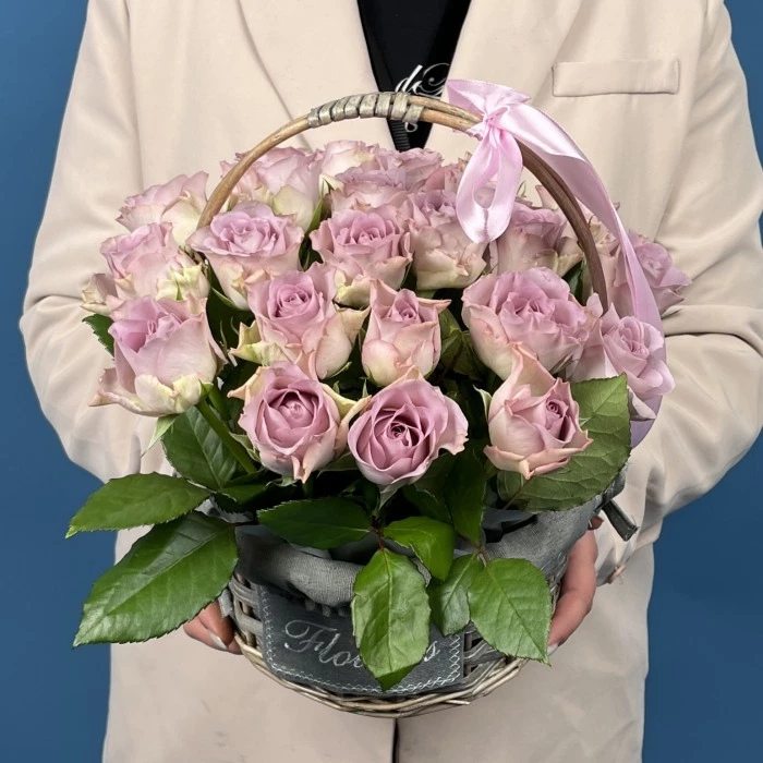 Очаровательный букет из 25 сиреневых роз, символизирующий память, уважение и искренние чувства. Уложенная в элегантную корзину, эта композиция станет выразительным подарком для особого случая — выражения благодарности, уважения или памятных событий. Мягкие сиреневые оттенки создают атмосферу спокойствия и утонченности, делая этот букет особенным и трогательным символом любви и памяти.