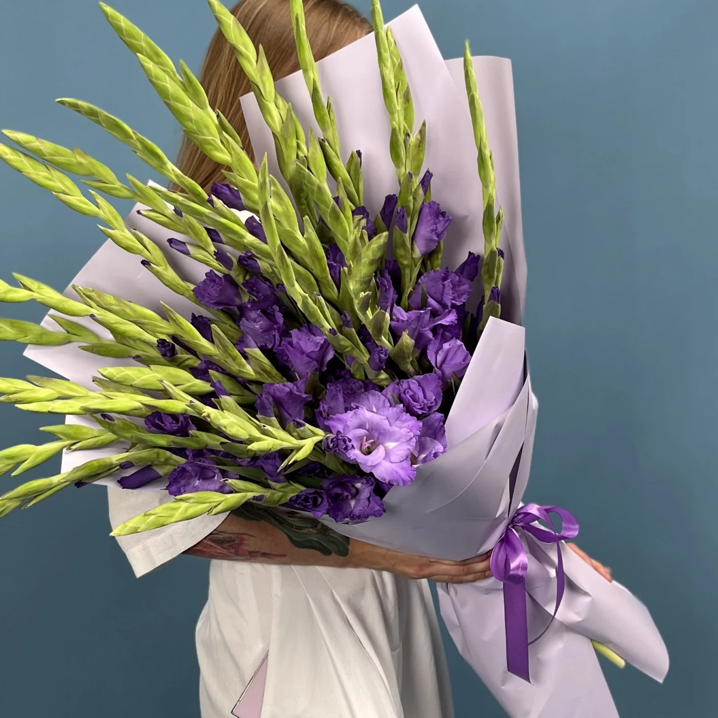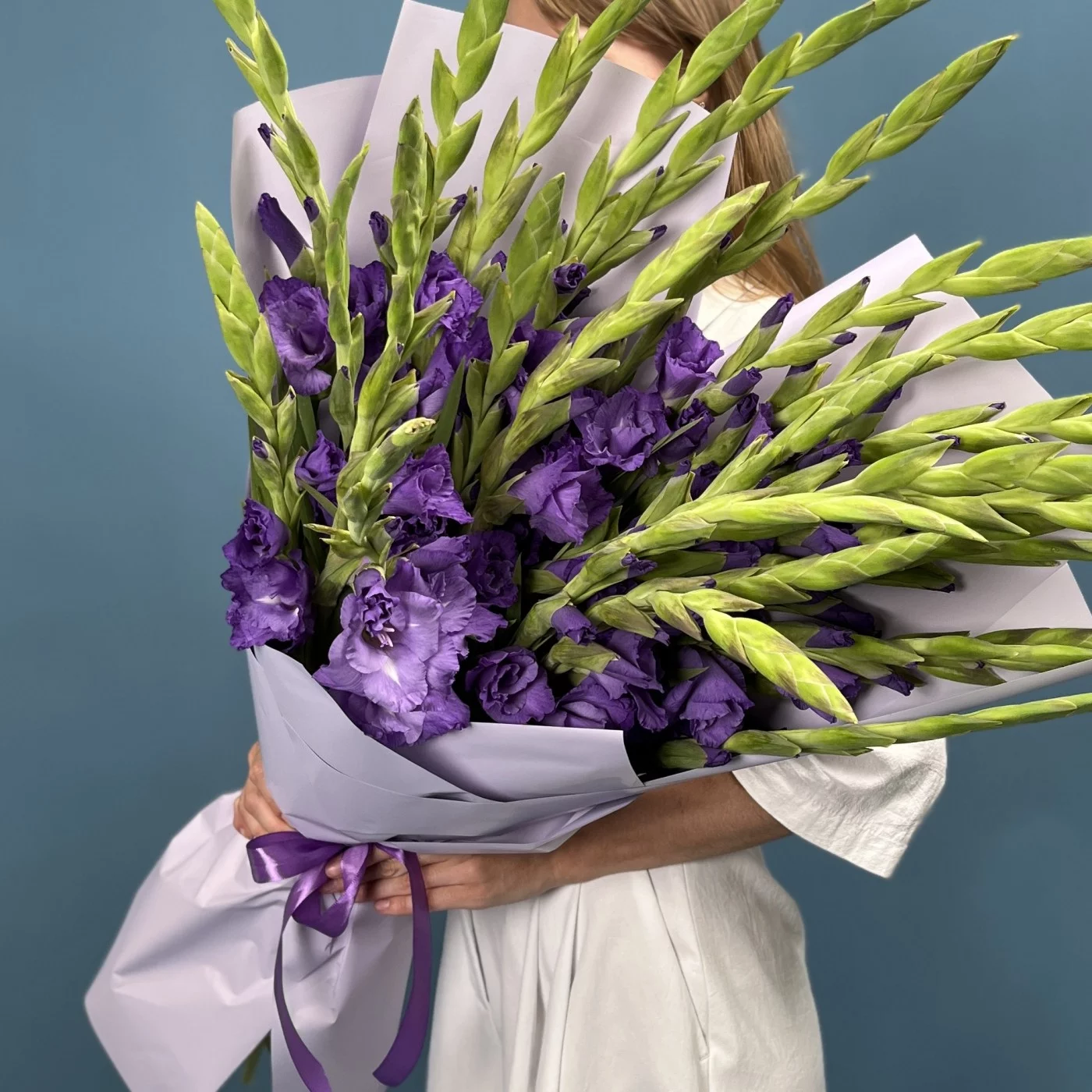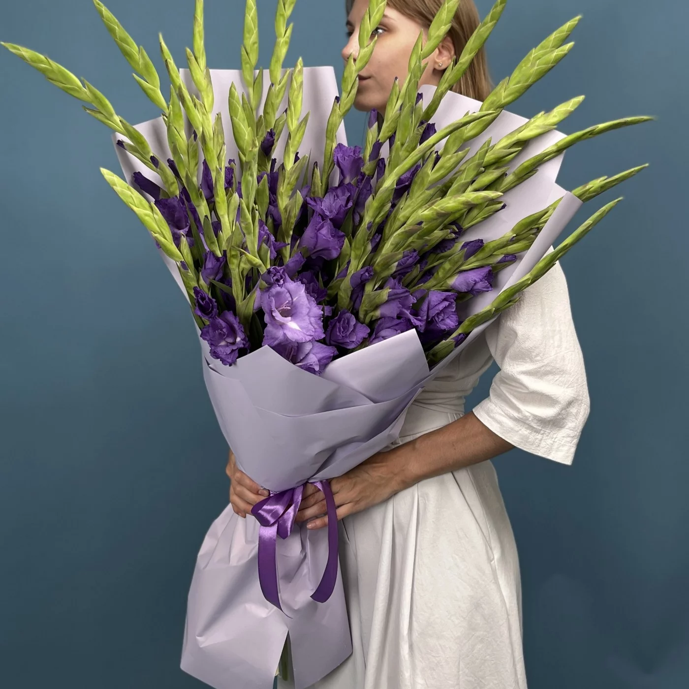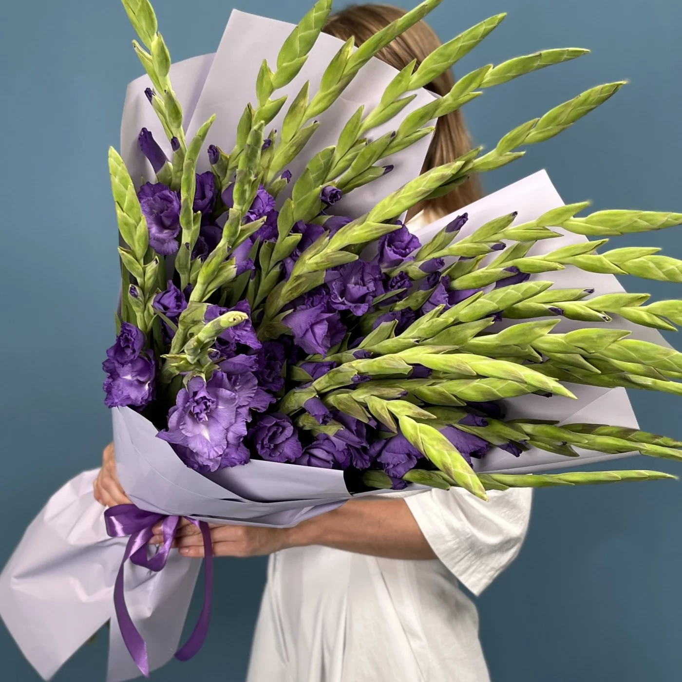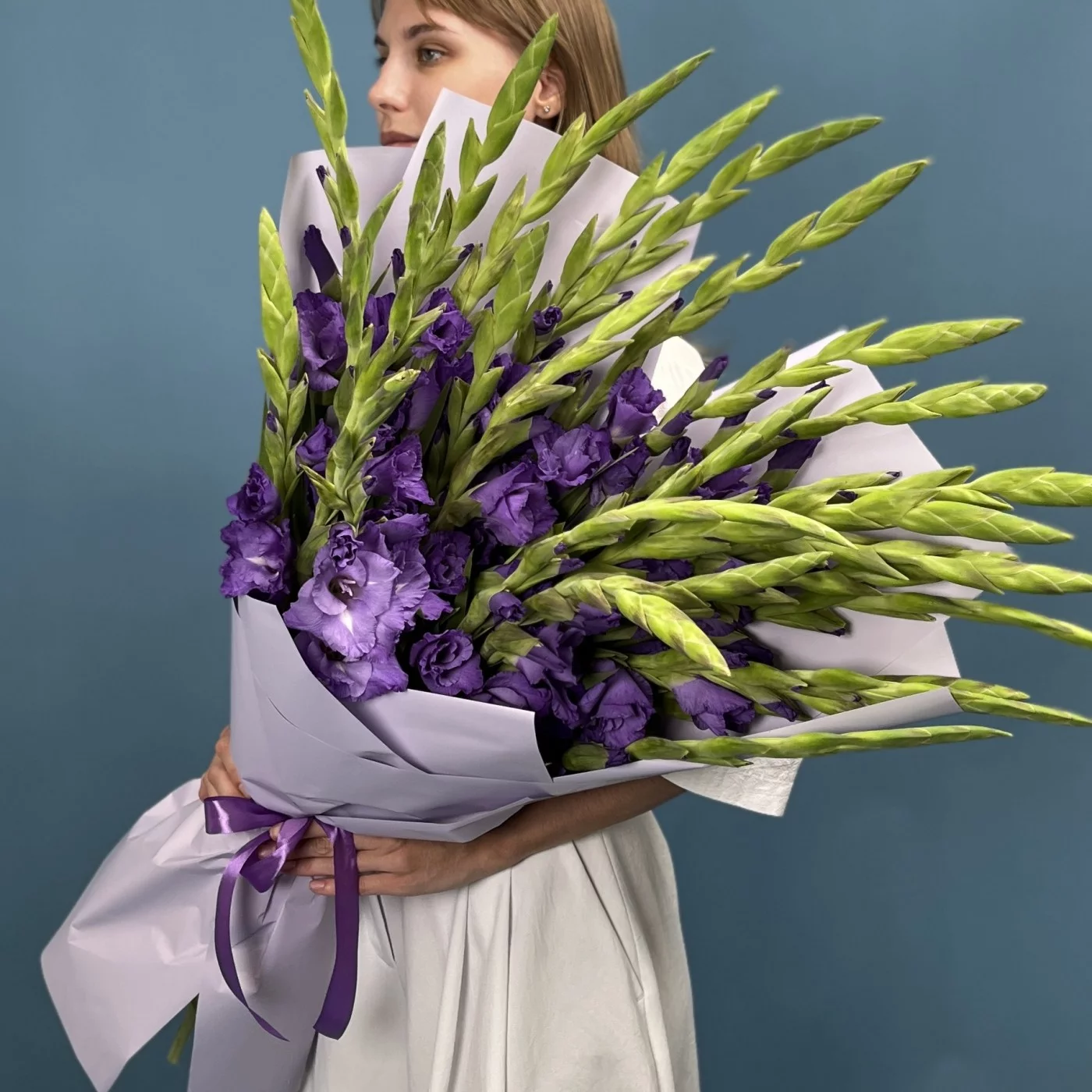 Элегантный букет из 25 темно-фиолетовых гладиолусов — это эффектное и выразительное украшение, которое подчеркнет вашу утонченность и изысканность.
