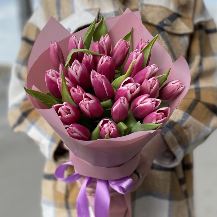 Букет из 25 розово-белых тюльпанов сорта Камалия. Подарите красивый, весенний букет своим родным и близким.