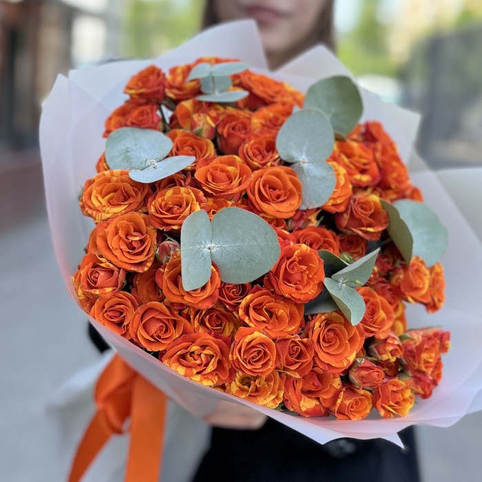 25 кустовых роз Смэшинг с эвкалиптом — это гармония яркости, стиля и природной красоты, которая обязательно вызовет улыбку и оставит приятное впечатление.
