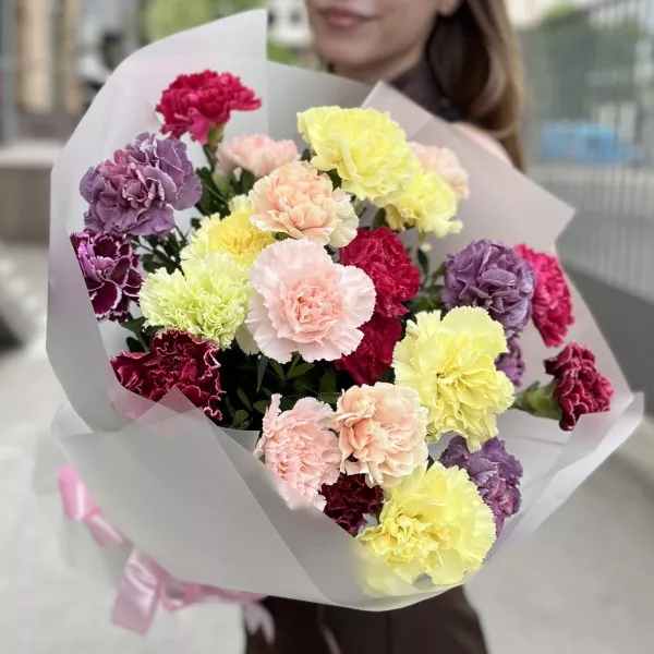 Букет из 25 ярких праздничных гвоздик MIX — это взрыв красок и радости, который идеально подходит для любого торжества! Яркие оттенки гвоздик создают жизнерадостное настроение и наполняют пространство энергией и позитивом.