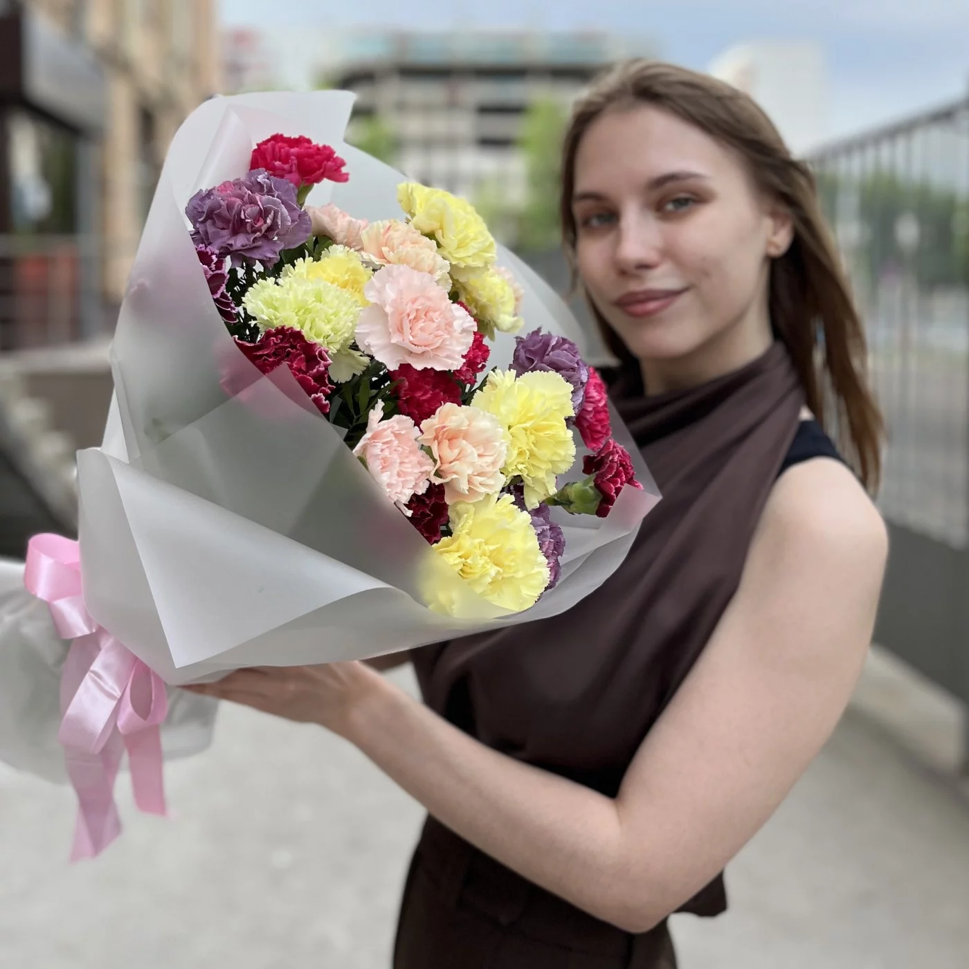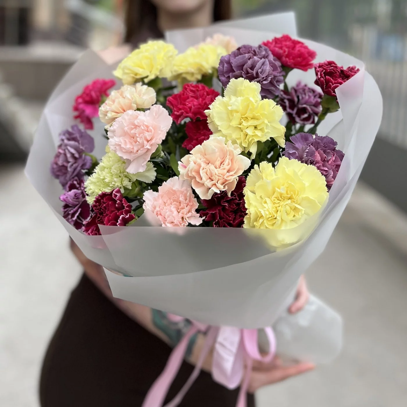 СОРТА И ОТТЕНКИ ГВОЗДИК МОГУТ ОТЛИЧАТЬСЯ ОТ ФОТО. БУКЕТ СОБИРАЕТСЯ ИЗ ГВОЗДИК В НАЛИЧИИ