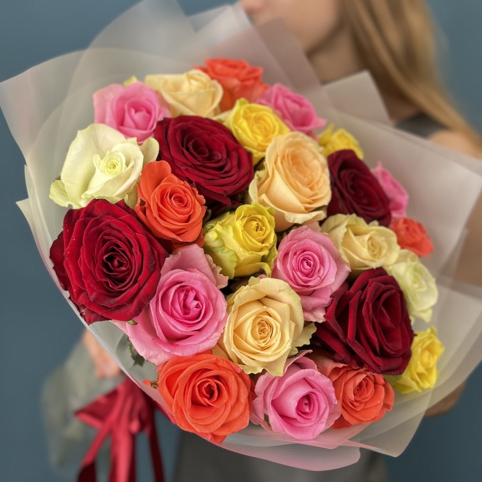 Яркий и насыщенный букет из 25 роз MIX высотой 60 см — это настоящее воплощение энергии и радости.
