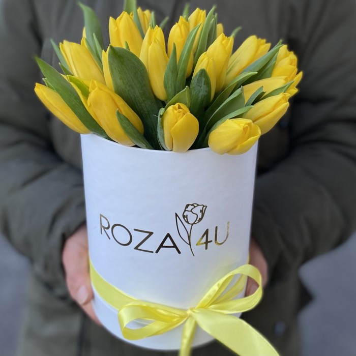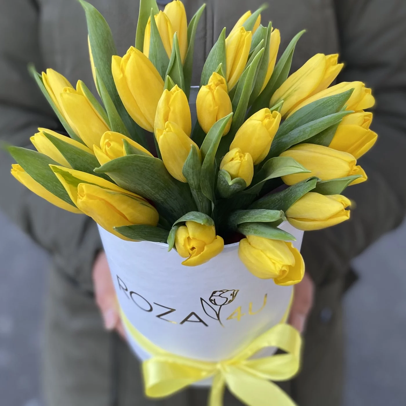 Коробка с 25 желтыми тюльпанами. Преподнесите такую композиция в качестве презента своим любимым людям. Прекрасный подарок к 8 марта.
