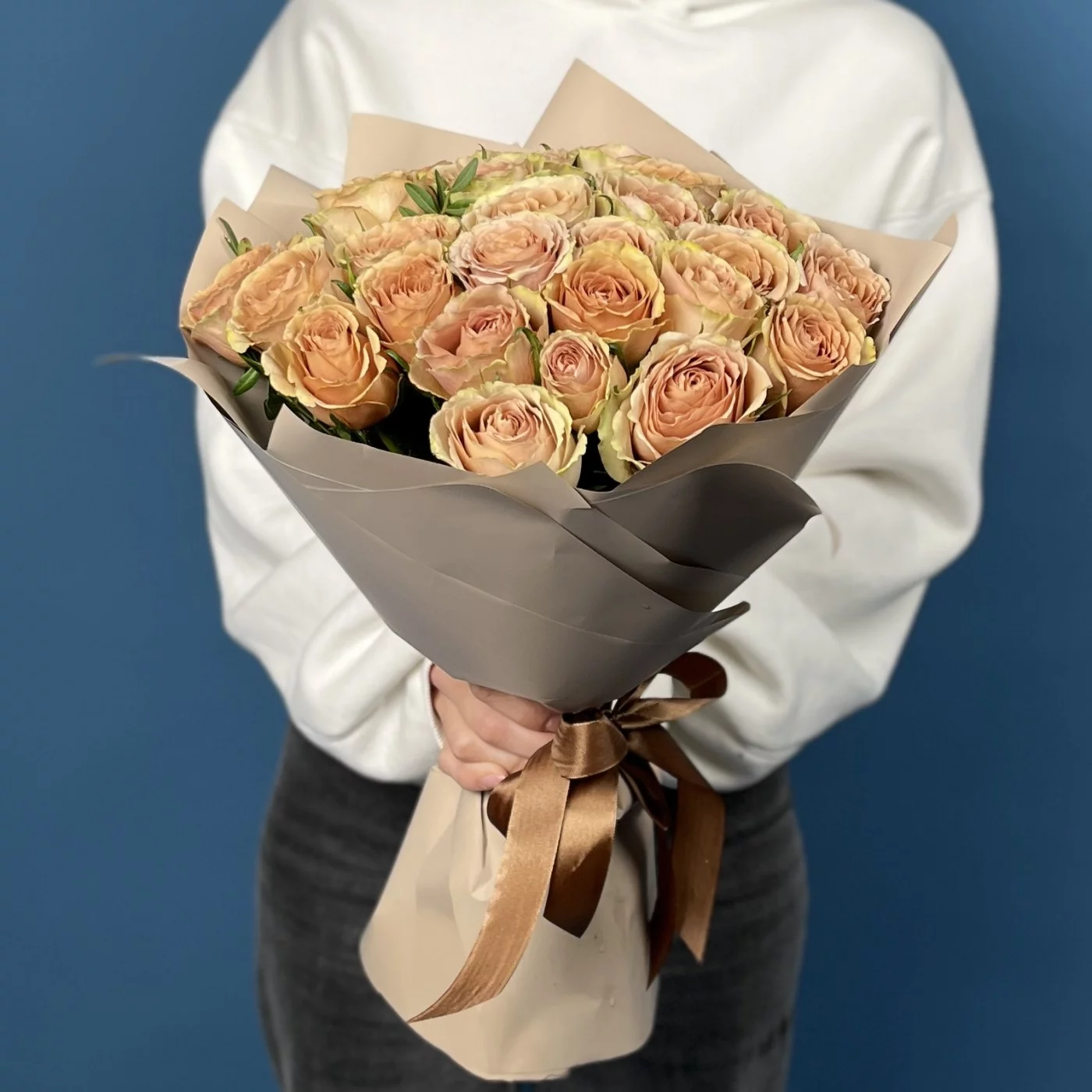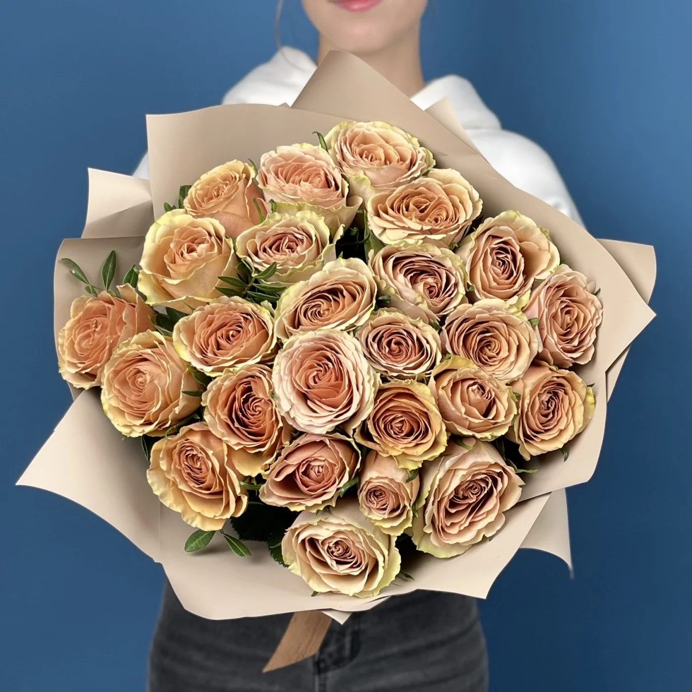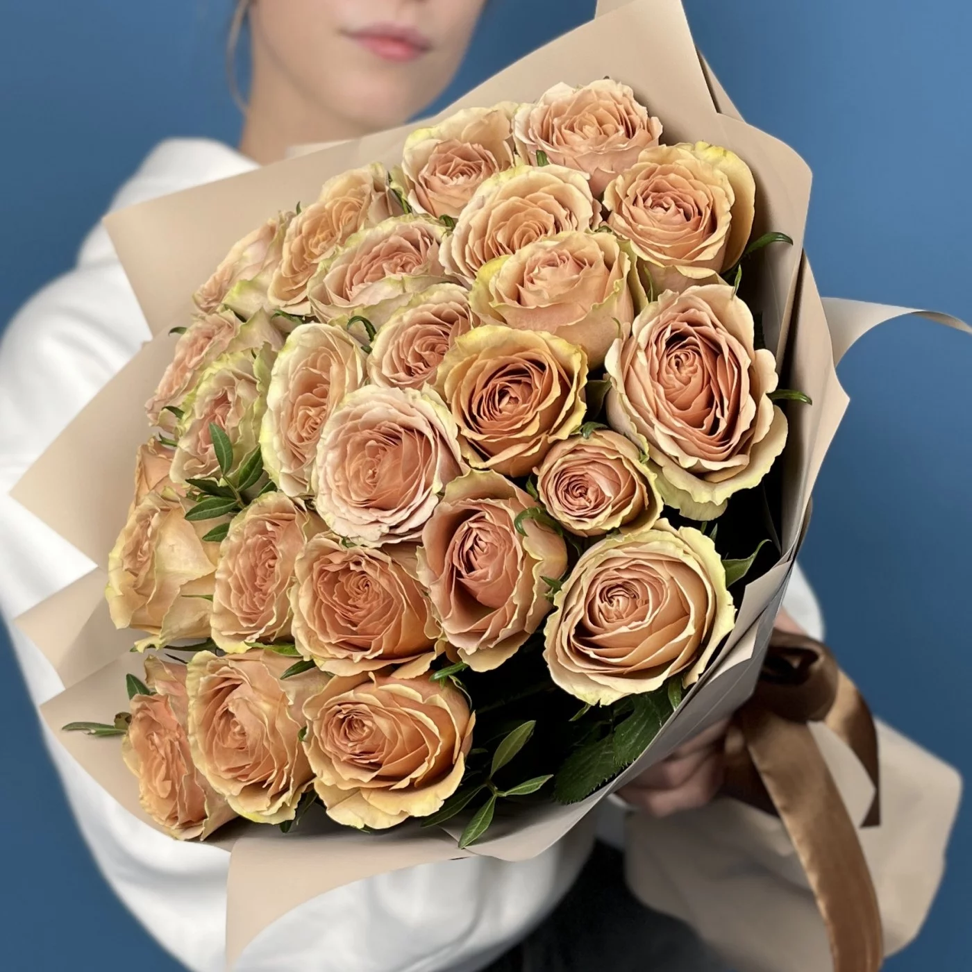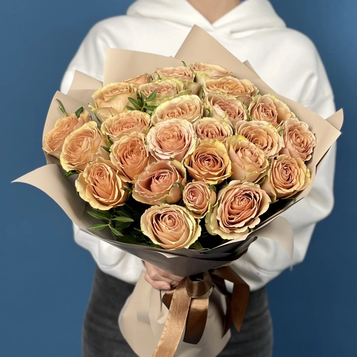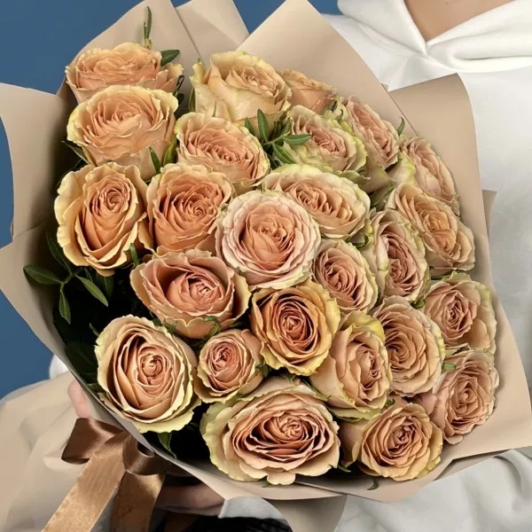 Красивый и насыщенный букет из 25 роз сорта Тедди высотой 40 см. Изысканные зелено-персиковые оттенки придают композиции свежесть и мягкость, создавая атмосферу нежности и уюта. Идеальный выбор для торжеств, подарков или украшения интерьера.