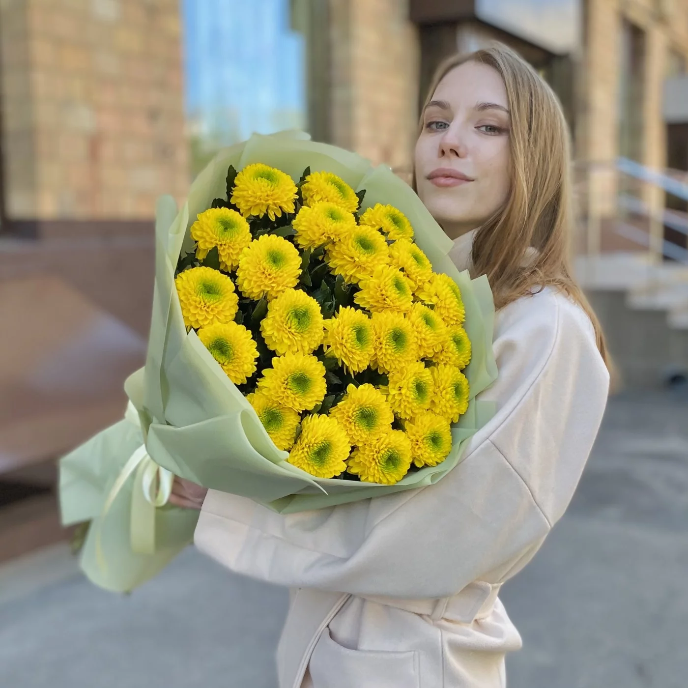 Букет из 25 пышных жёлтых хризантем Помпон отлично подойдет, чтобы поздравить коллегу или подругу с днем рождения.