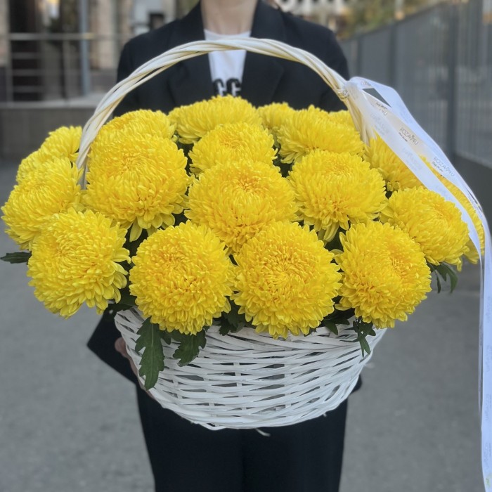 25 желтых хризантем в корзине — это очень красивый и нежный подарок. Такие цветы символизируют радость, благополучие и дружеские чувства.