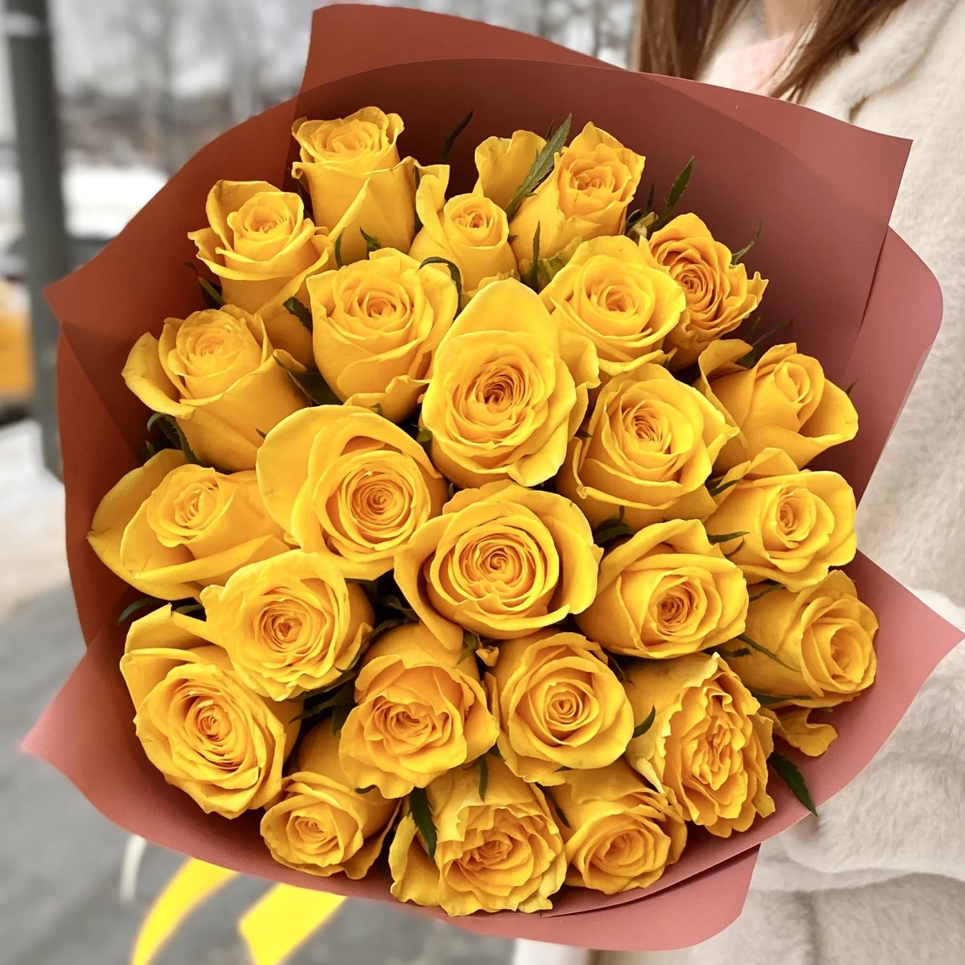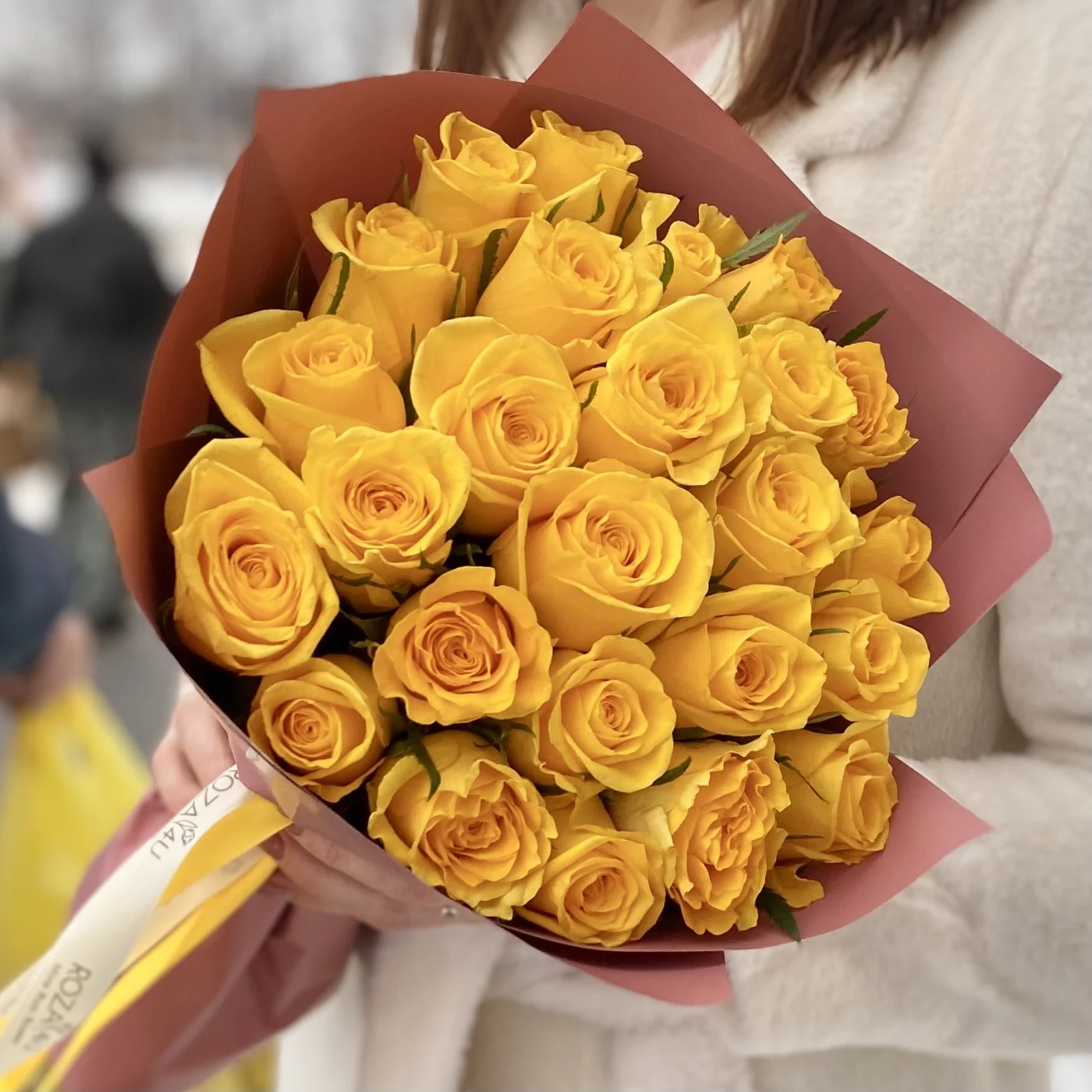 Свежий и сочный букет из 25 желтых роз ярко выделяется среди своих конкурентов в цветочном мире красок. Желтый цвет бутонов символизирует радость, семейное счастье, достаток, уверенность и добросердечие. Если вы хотите выразить своему партнеру доверие и нежную заботу о нем, большой букет желтых роз все скажет за вас без слов. Композиция не только заворадивает своей красотой и утонченностью, но и дарит восхитительное благоухание недавно срезанных цветов.