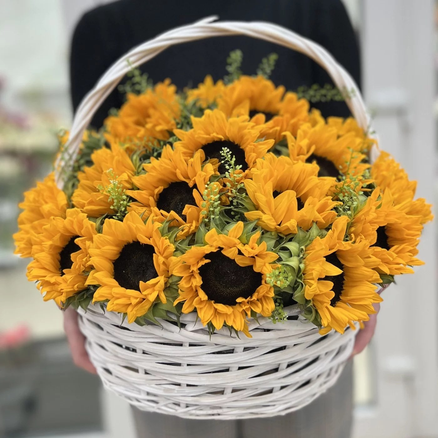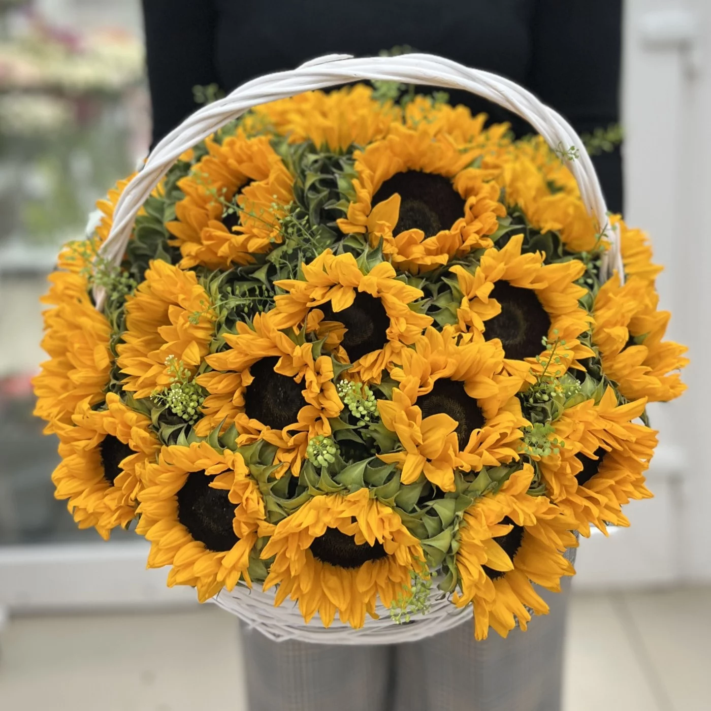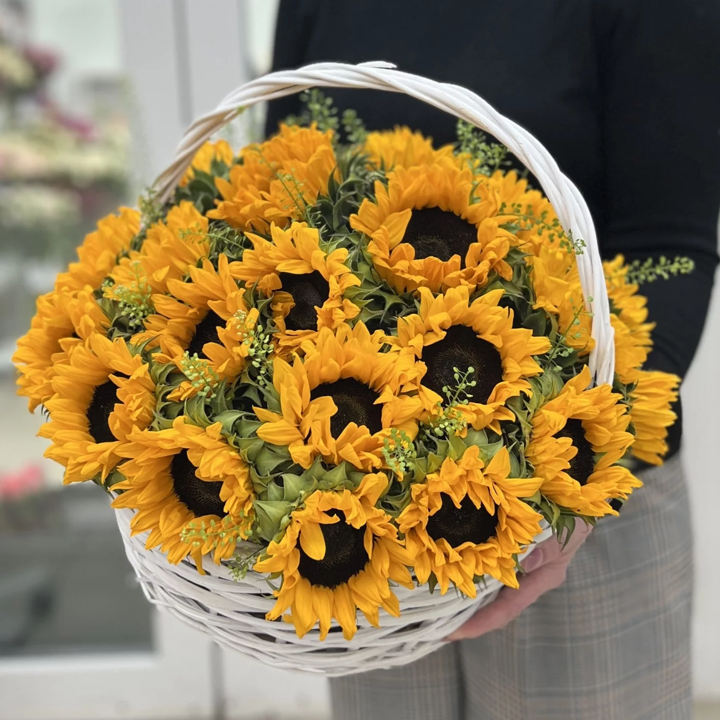 27 подсолнухов с гринбеллом в корзине — это не только красивый, но и универсальный подарок, яркое и жизнерадостное решение для подарка или декора.