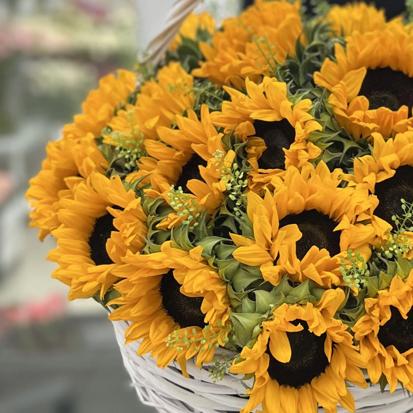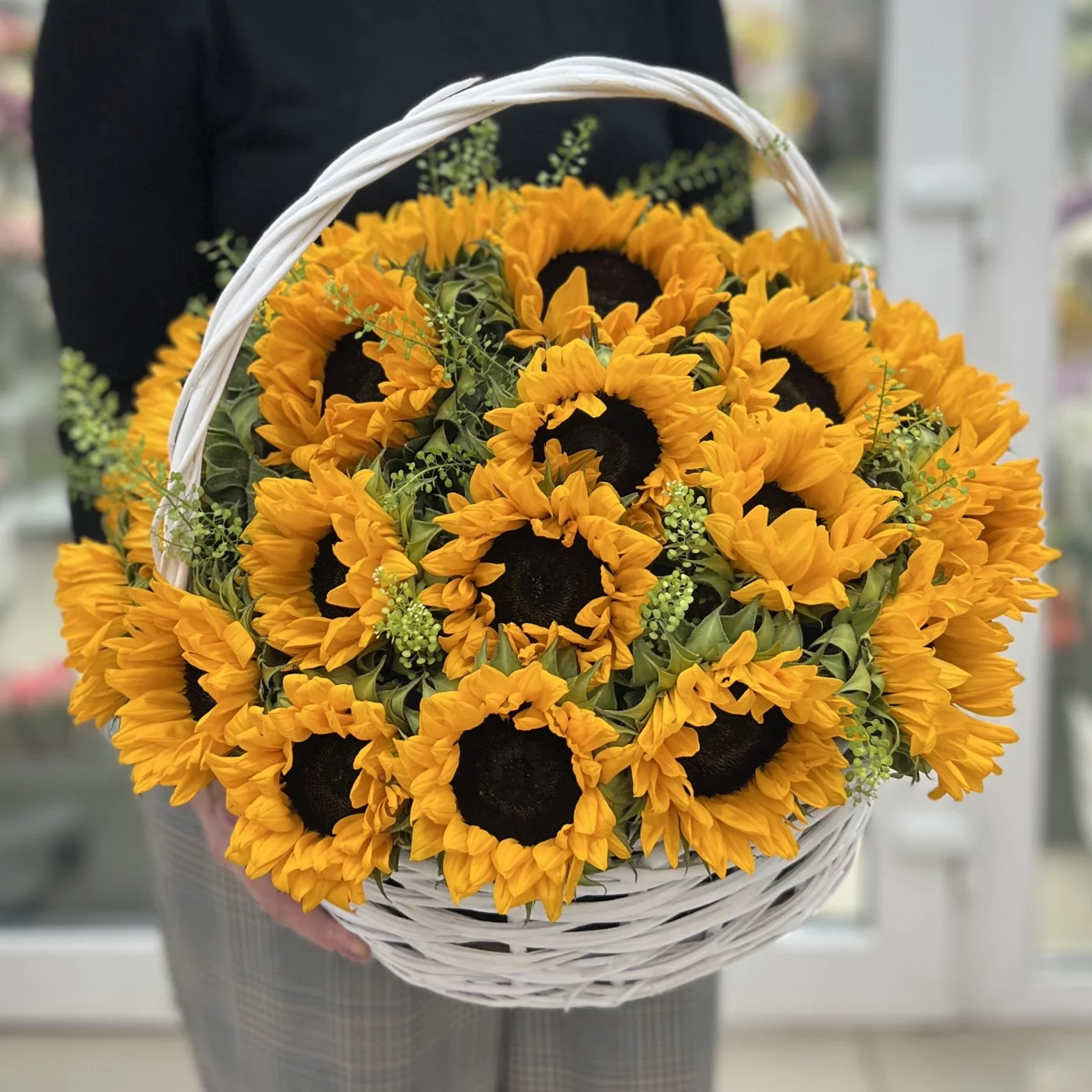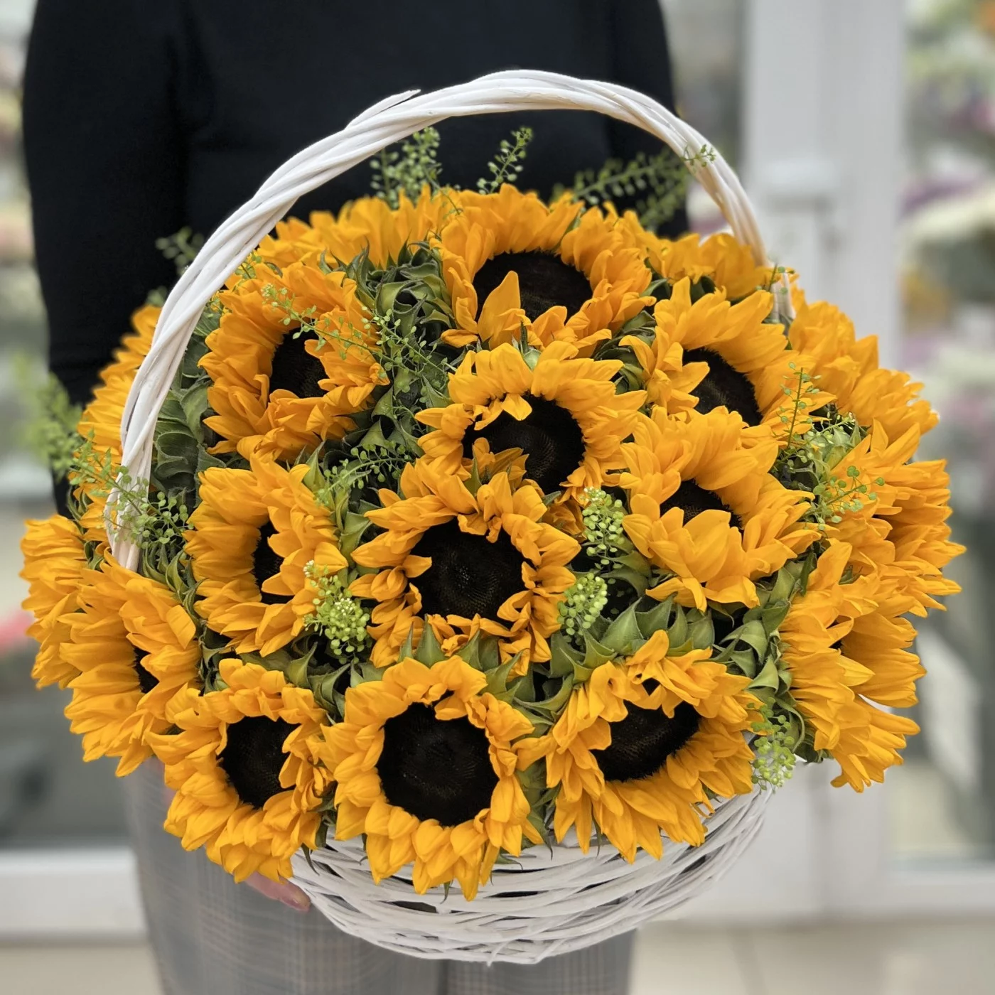 27 подсолнухов с гринбеллом в корзине — это не только красивый, но и универсальный подарок, яркое и жизнерадостное решение для подарка или декора.