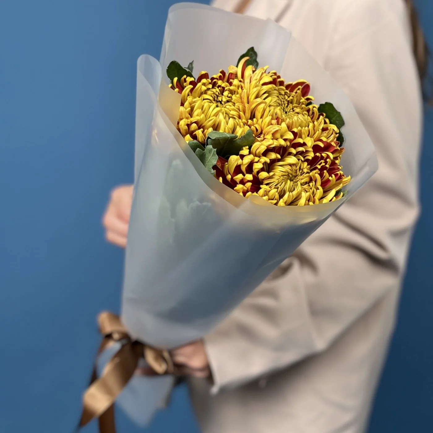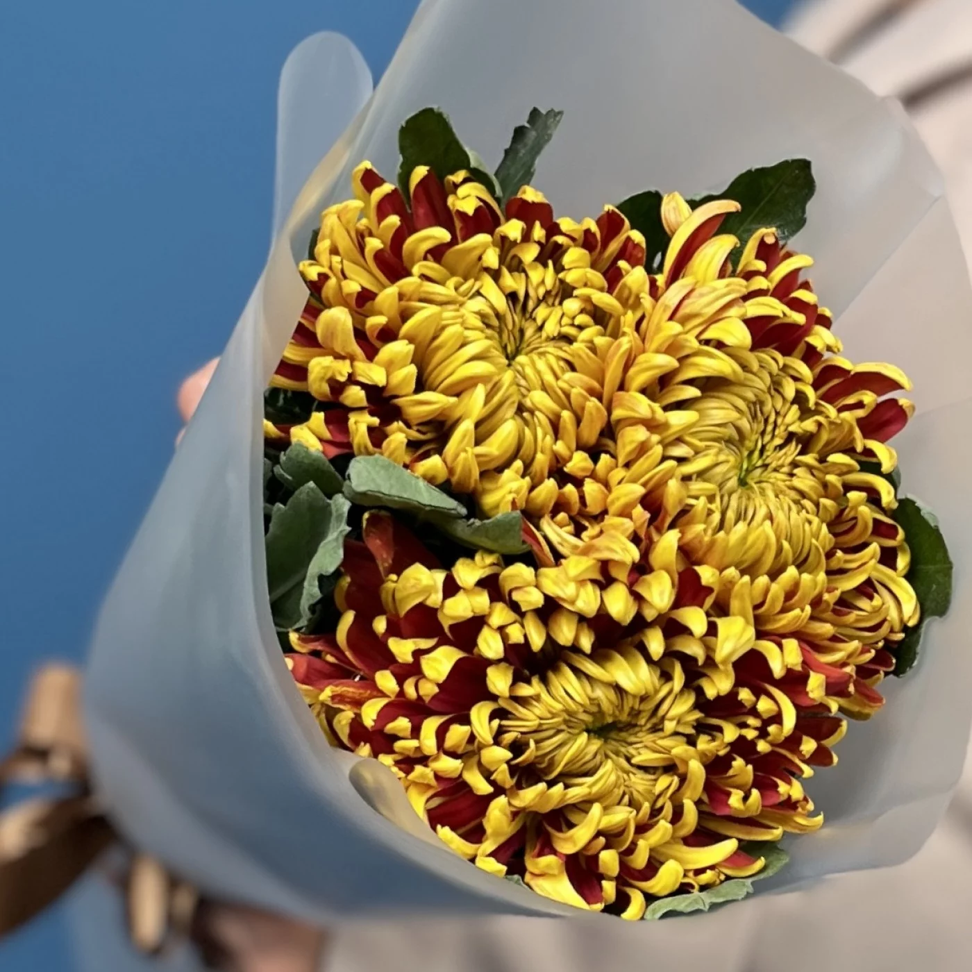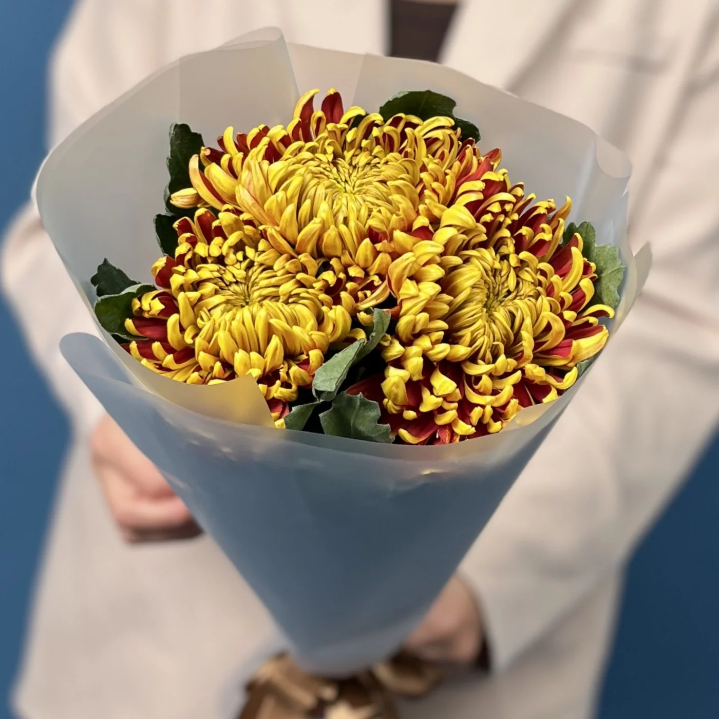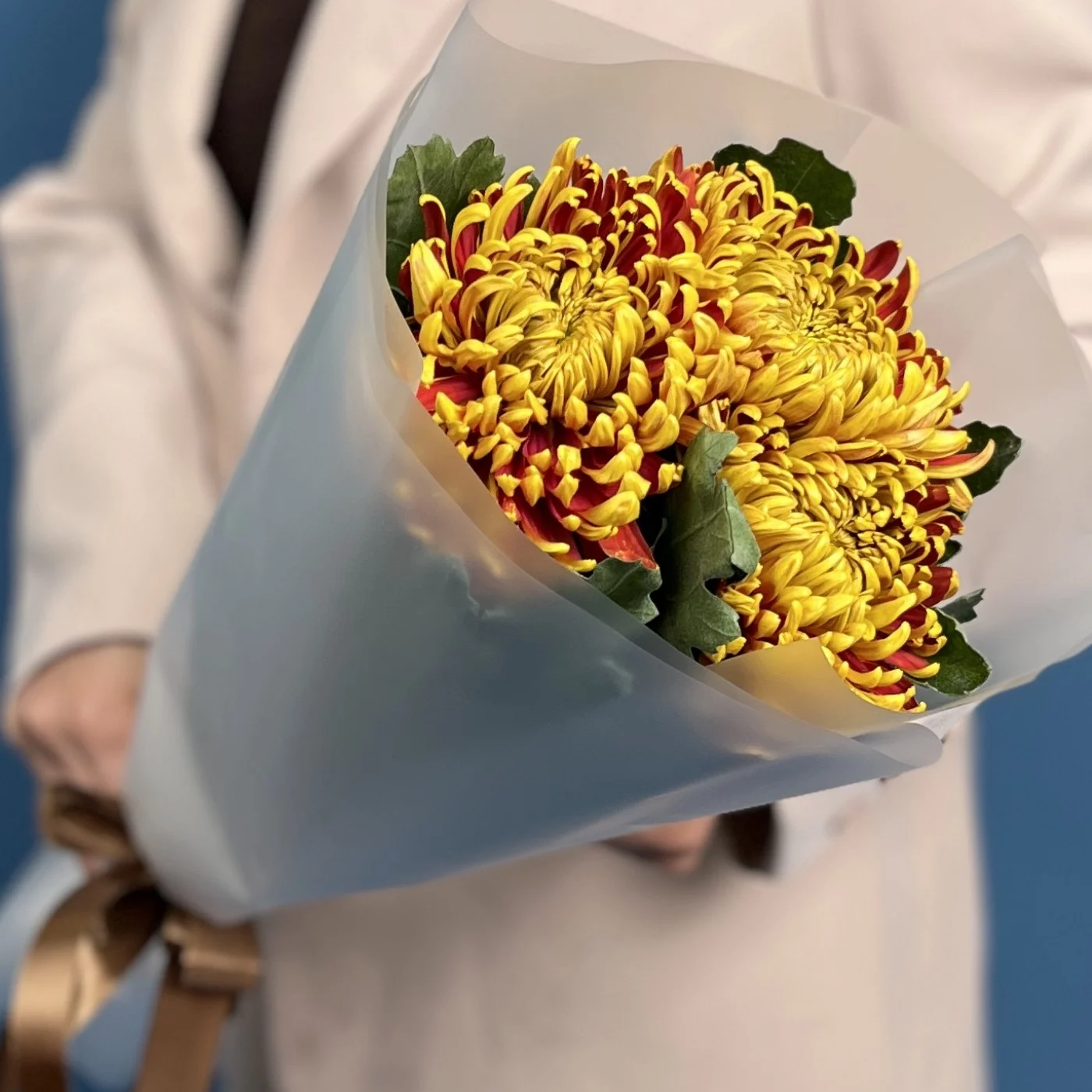 Букет из трёх хризантем Том Пирс — это яркая, теплая и по-осеннему жизнерадостная композиция. Хризантемы с огненными жёлто-красными переливами выглядят по-настоящему уникально: каждый бутон словно собран из солнечных лучей и тёплых оттенков заката. Благодаря насыщенной палитре и плотной форме цветков букет кажется объёмным и выразительным даже при небольшом количестве стеблей. Он притягивает взгляд своей энергией и вызывает искреннюю улыбку, будто приносит с собой немного света даже в самый обычный день.
