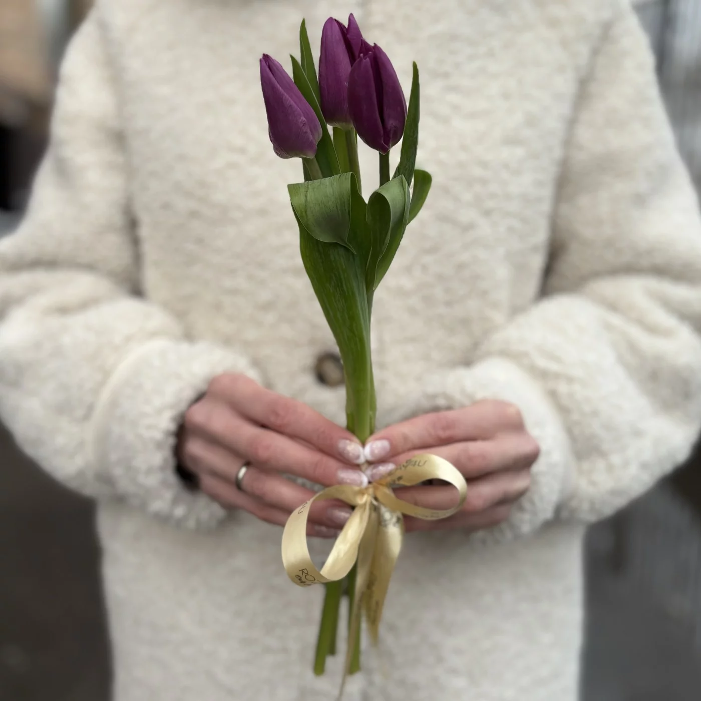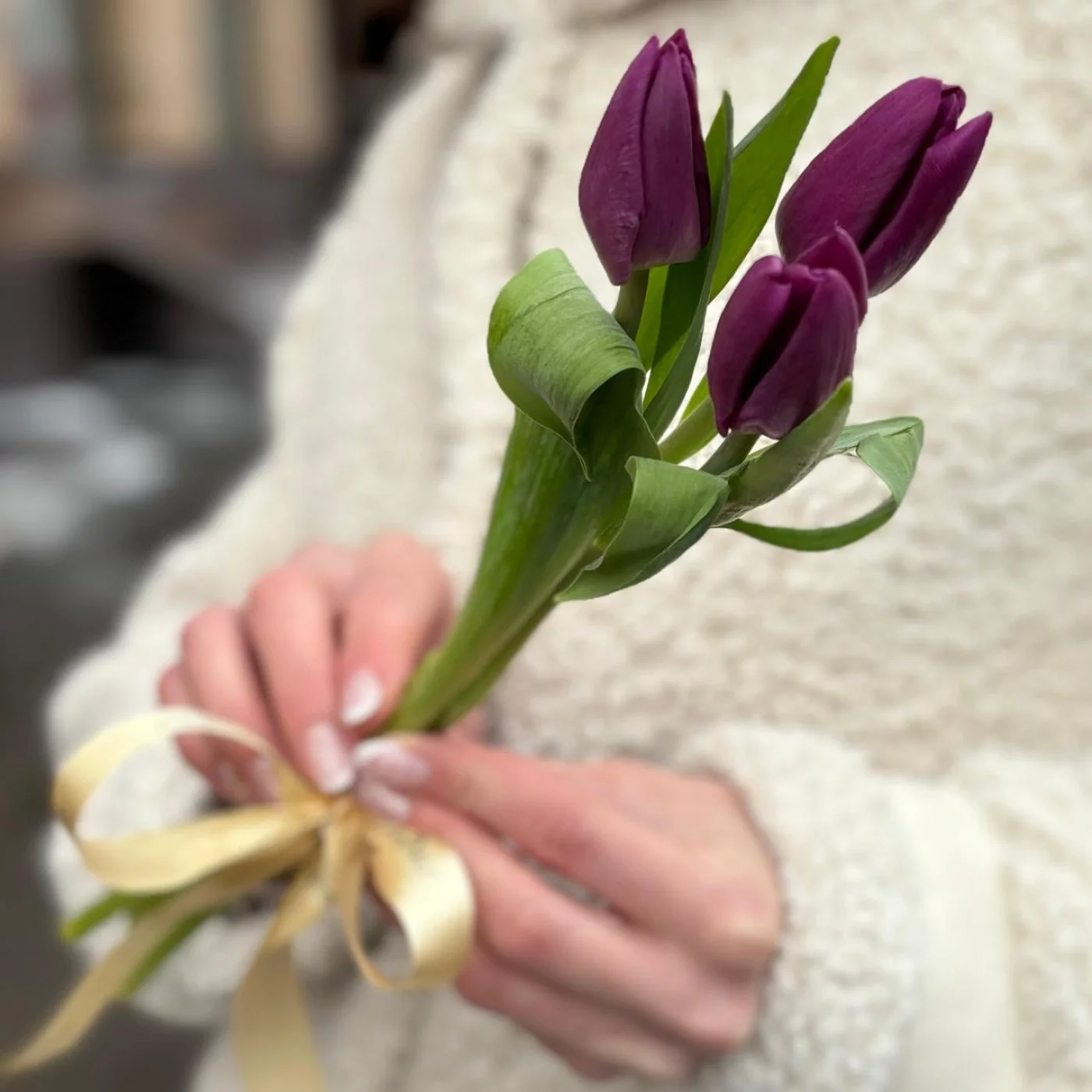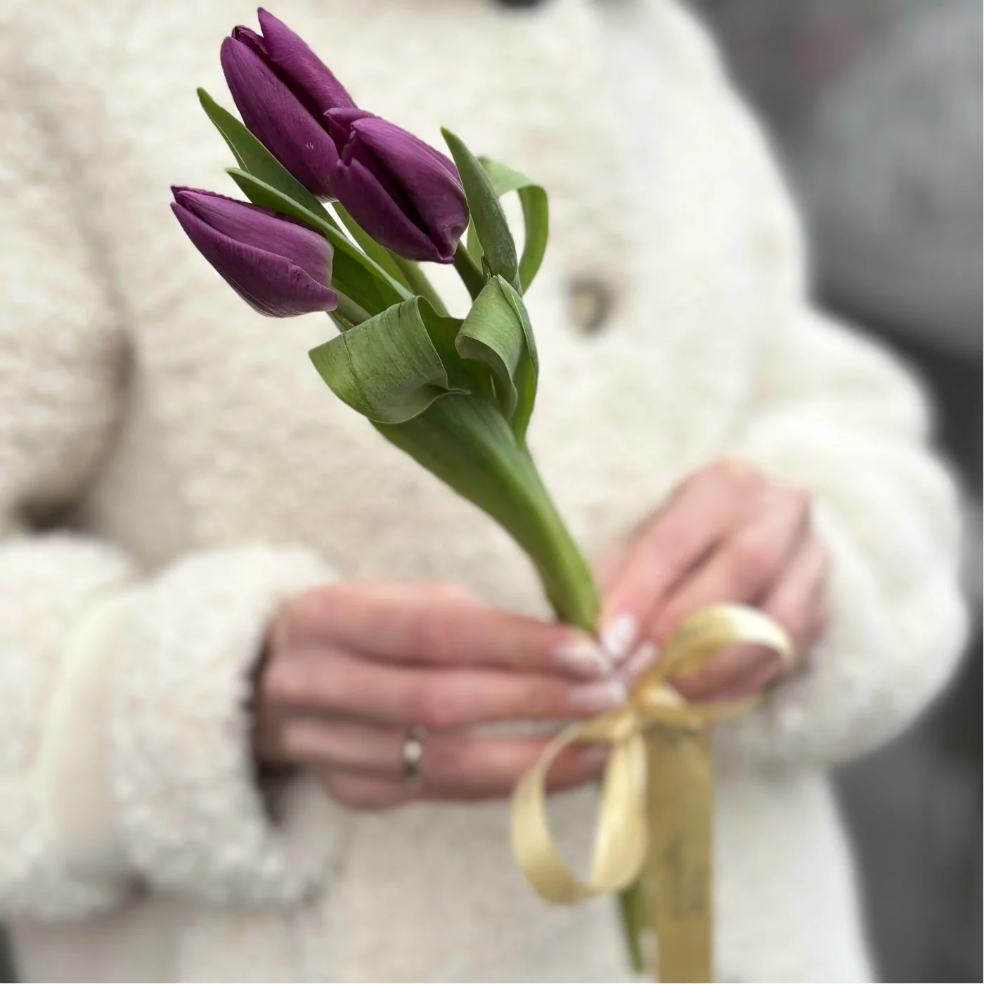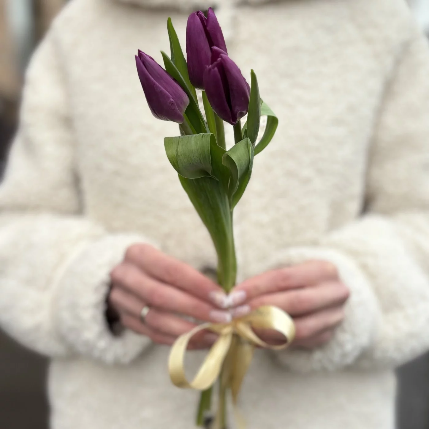 Мини букет из 3 тюльпанов фиолетового цвета. Прекрасный корпоративный вариант подарка на 8 марта.