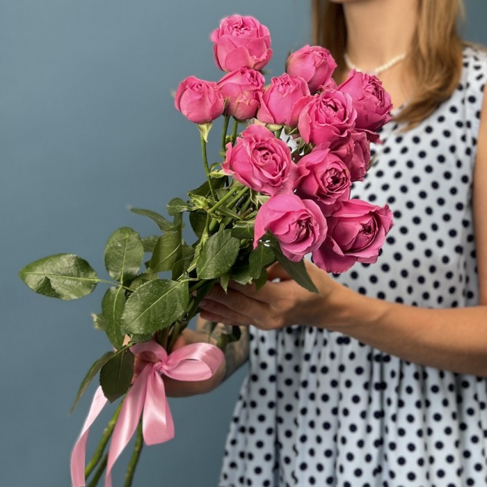 Подарок из трёх кустовых малиновых роз Мисти Баблс высотой около 60 см удивляет своей выразительной простотой и утончённым шармом. Глубокие розово-лиловые оттенки делают каждый бутон насыщенным и живым, а пионовидная форма придаёт композиции мягкость и естественную пышность. Именно эта лаконичность делает подарок совершенным: он выглядит стильно, элегантно и дарит искреннюю радость с первого взгляда. Его преимущество в универсальности и способности выразить внимание и нежность без лишних слов. Такой комплект идеально подходит для романтичного жеста, извинения, благодарности, небольшого, но очень тёплого сюрприза для подруги, любимой женщины, коллеги или дорогого человека. Наша