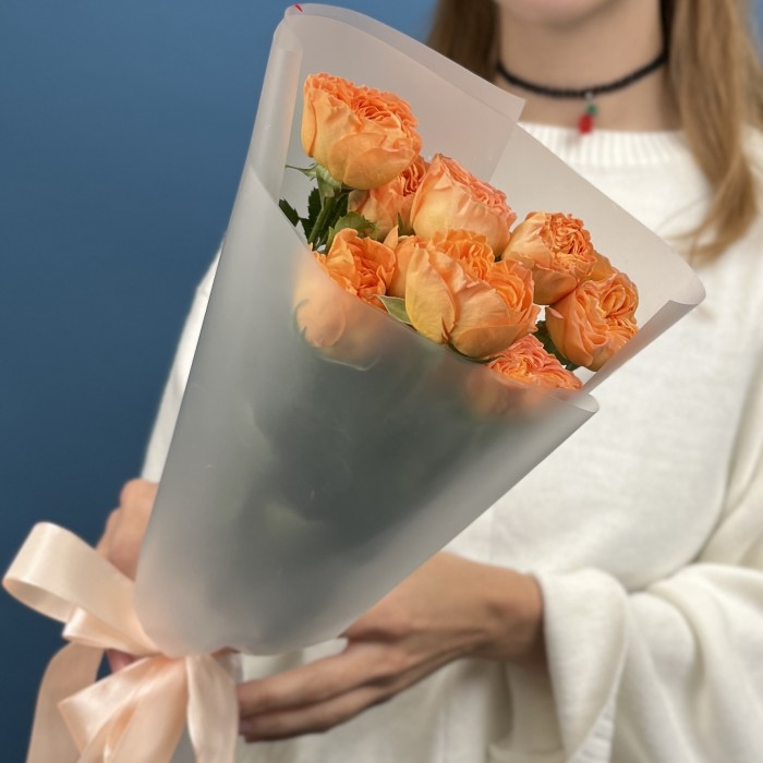 3 кустовые пионовидные розы Оранж Трендсеттер 50 см - солнечный и позитивный букет.