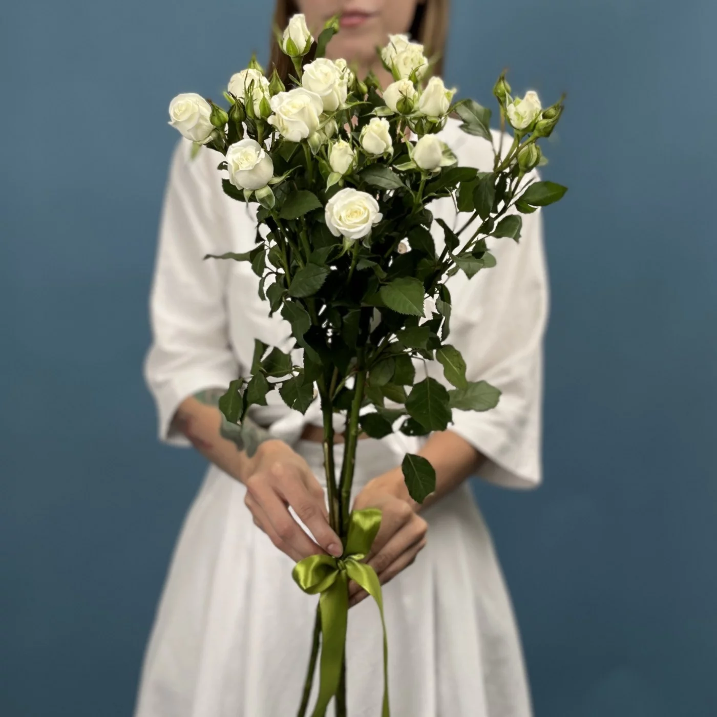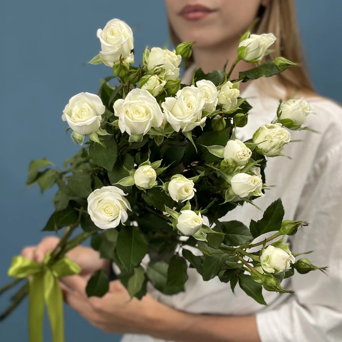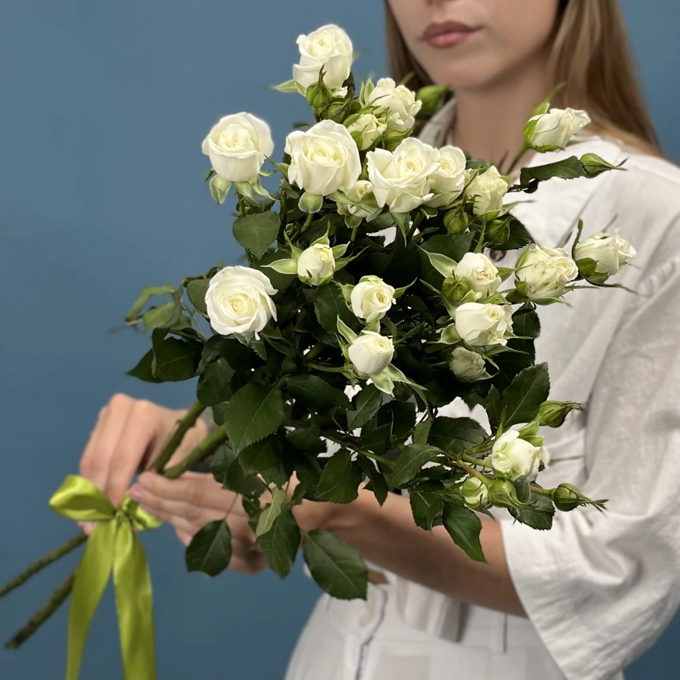 Очаровательный букет из 3 кустовых роз сорта Сноу Бабл высотой 70 см — то нежная и романтичная композиция, наполненная свежестью и элегантностью.